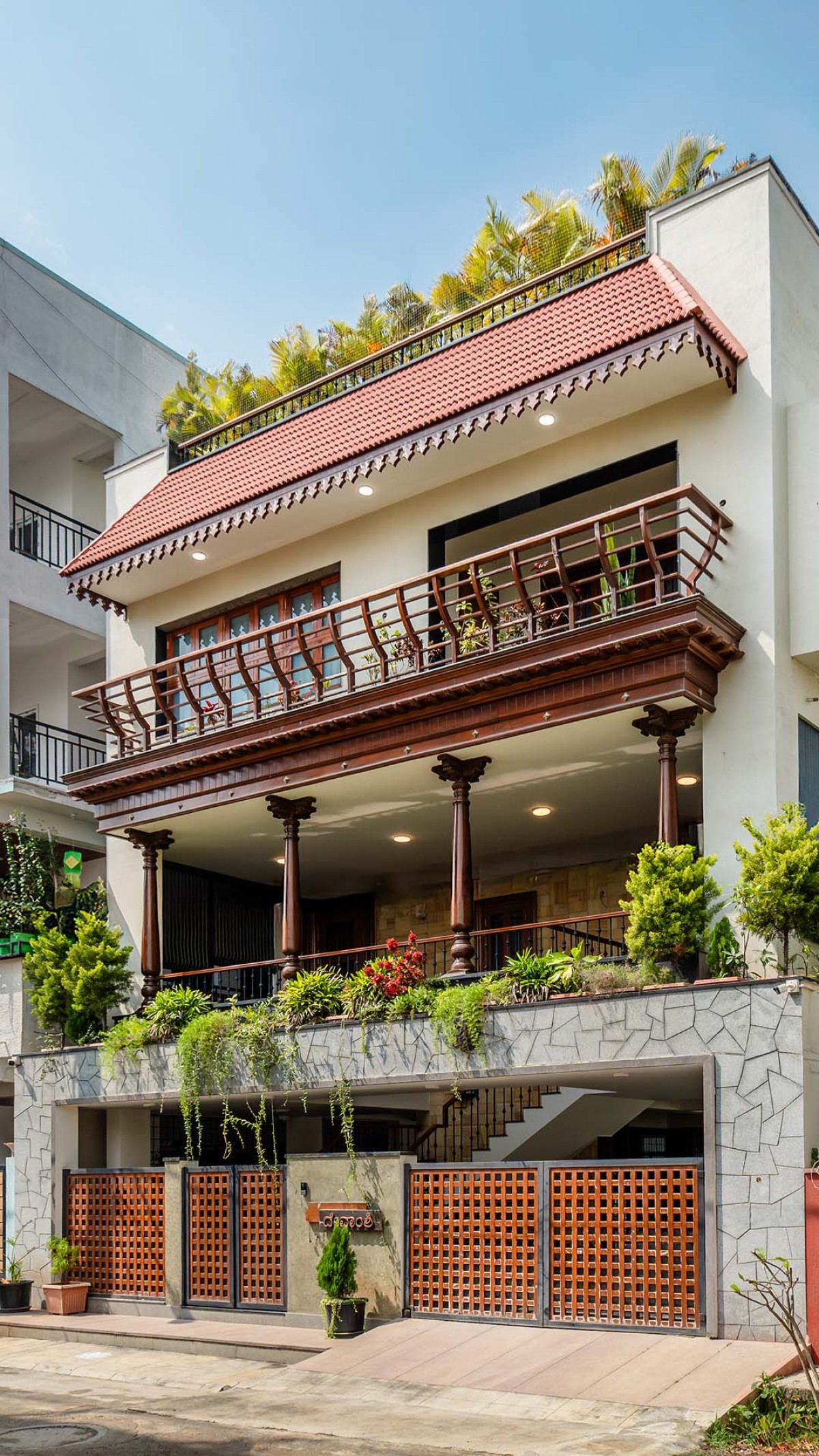 Devamshi Residence is a three-storey family home in Bengaluru that reinterprets traditional South Indian architecture through a modern and timeless sensibility. Built on a 35x60 ft east-facing plot with a total area of 6,000 sq.ft, the house embodies the warmth of regional craftsmanship while responding to the needs of contemporary living.