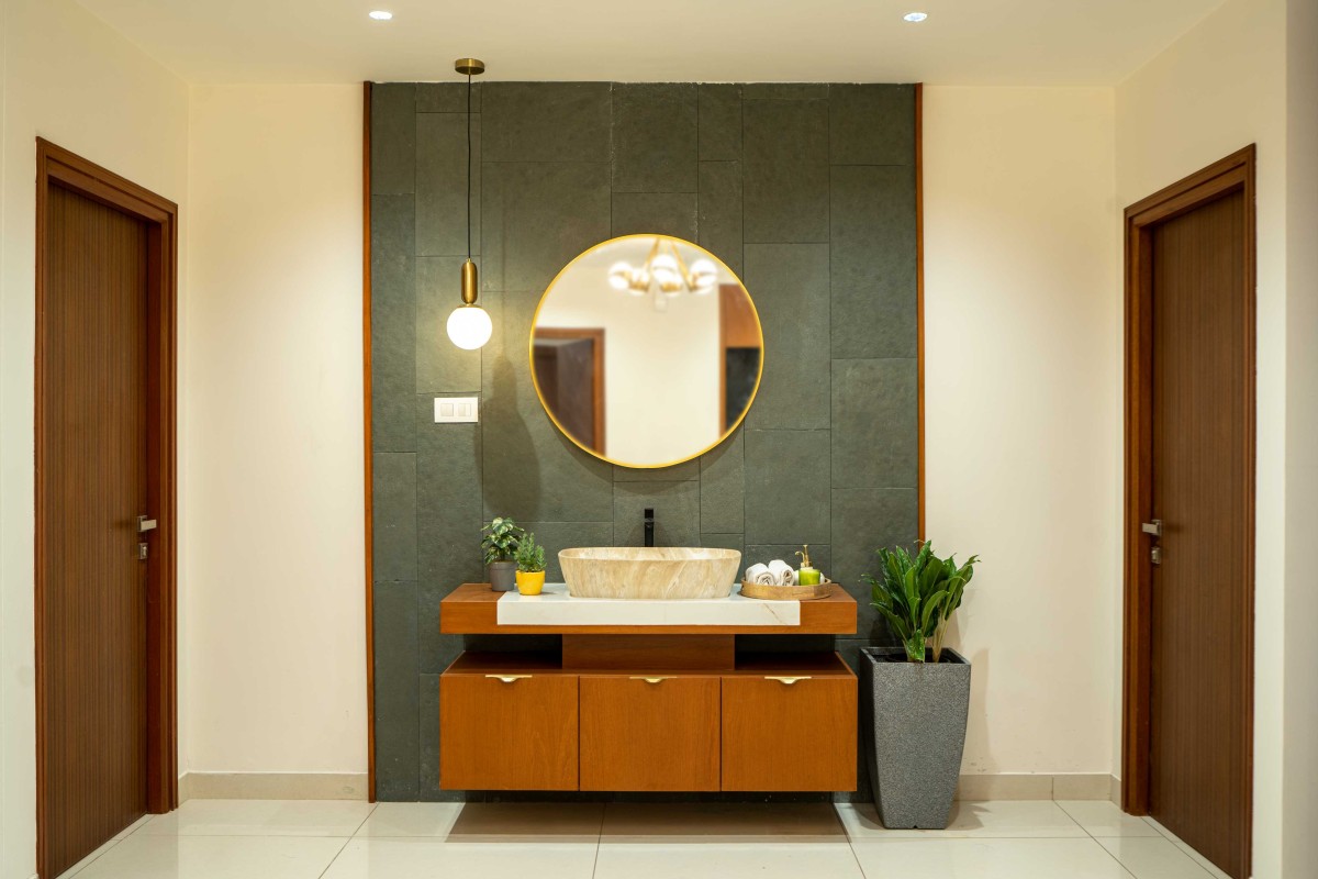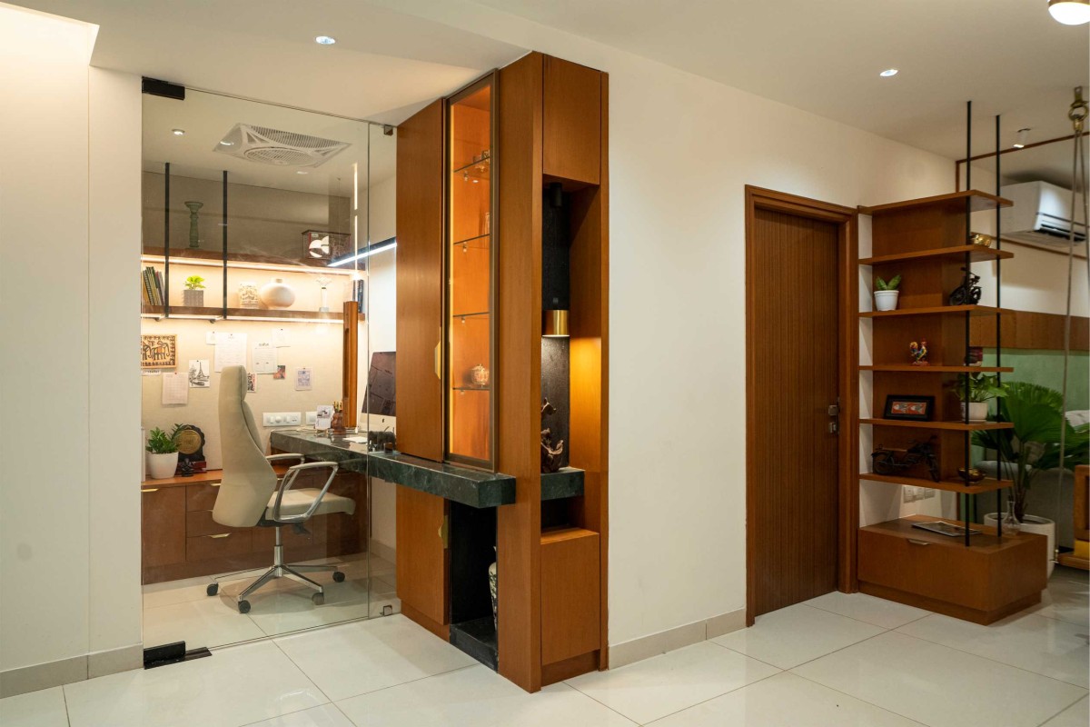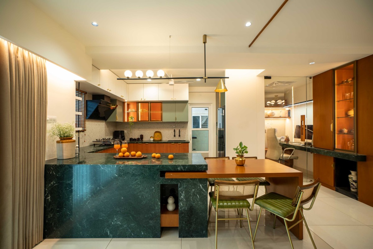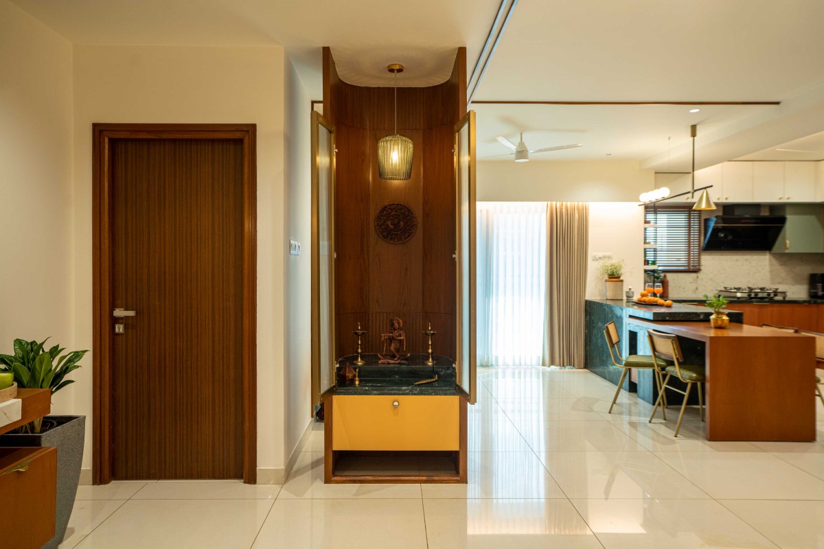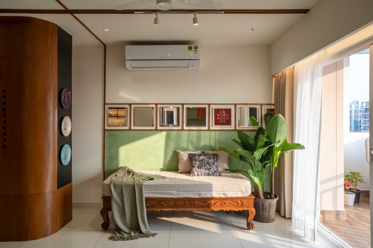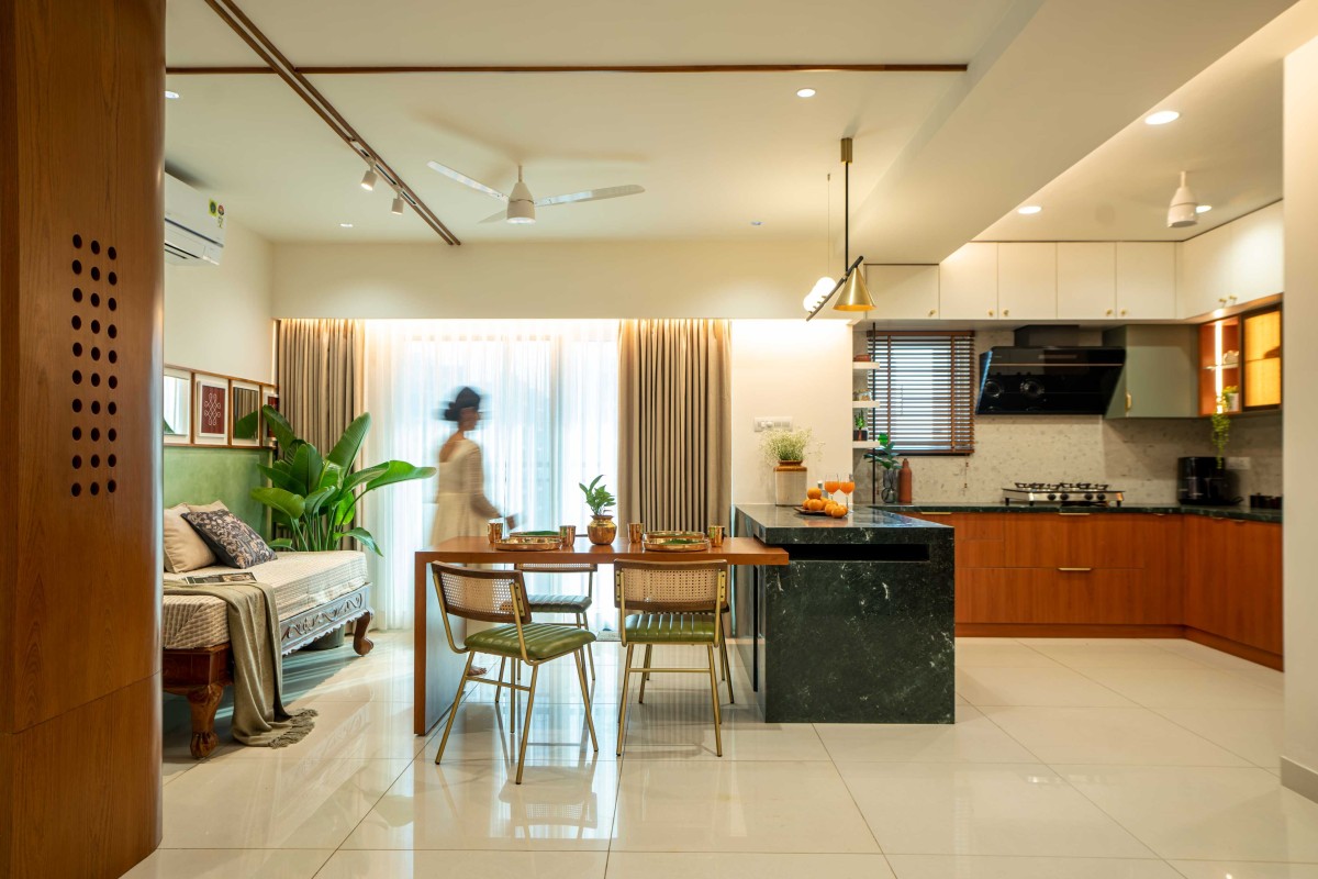 We took inspiration from Indian materials and elements, and recreated them in a modern framework, using hardwood paneling on walls with simple, clear lines in the place of intricate woodwork patterns, bringing warmth to the home. Whereas, accents of lush green lime plaster and vibrant yellow fabrics thread through the home, energizing the otherwise grounded palette, tying the individual spaces into a unified whole. The indian green marble is widely used in the home, enriching the overall ambience of the space. While, handcrafted rattan mats, woven jute textures and fabrics with Indian motifs are integrated with modern and minimalistic furniture. Traditional brass elements make a subtle return through delicate handles, lighting fixtures, and decor pieces—bringing a touch of heritage into the modern setting. Traditional features like the ancestral furniture and artisanal woodcraft played a central role in infusing the home with a deeply personal and enduring character.