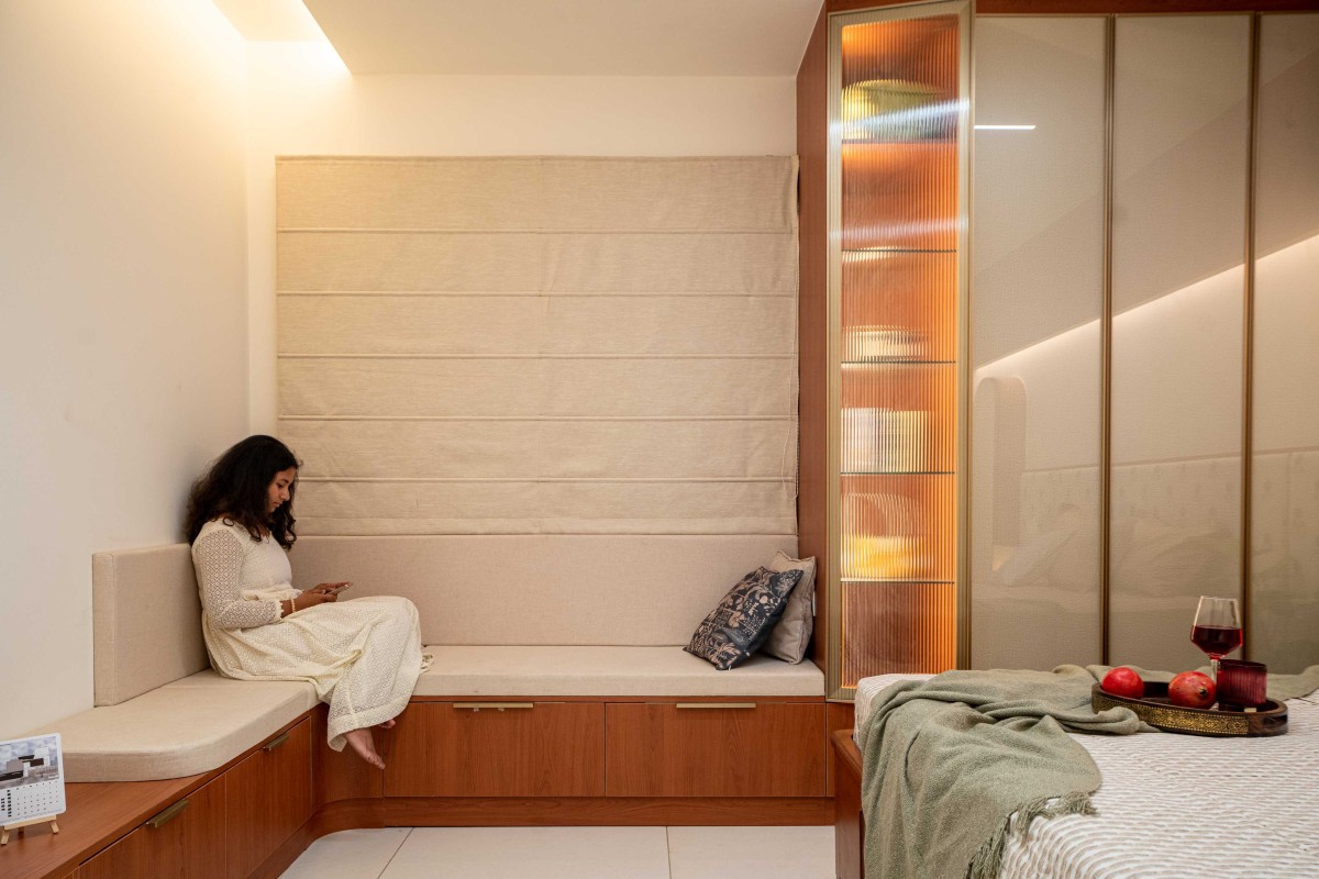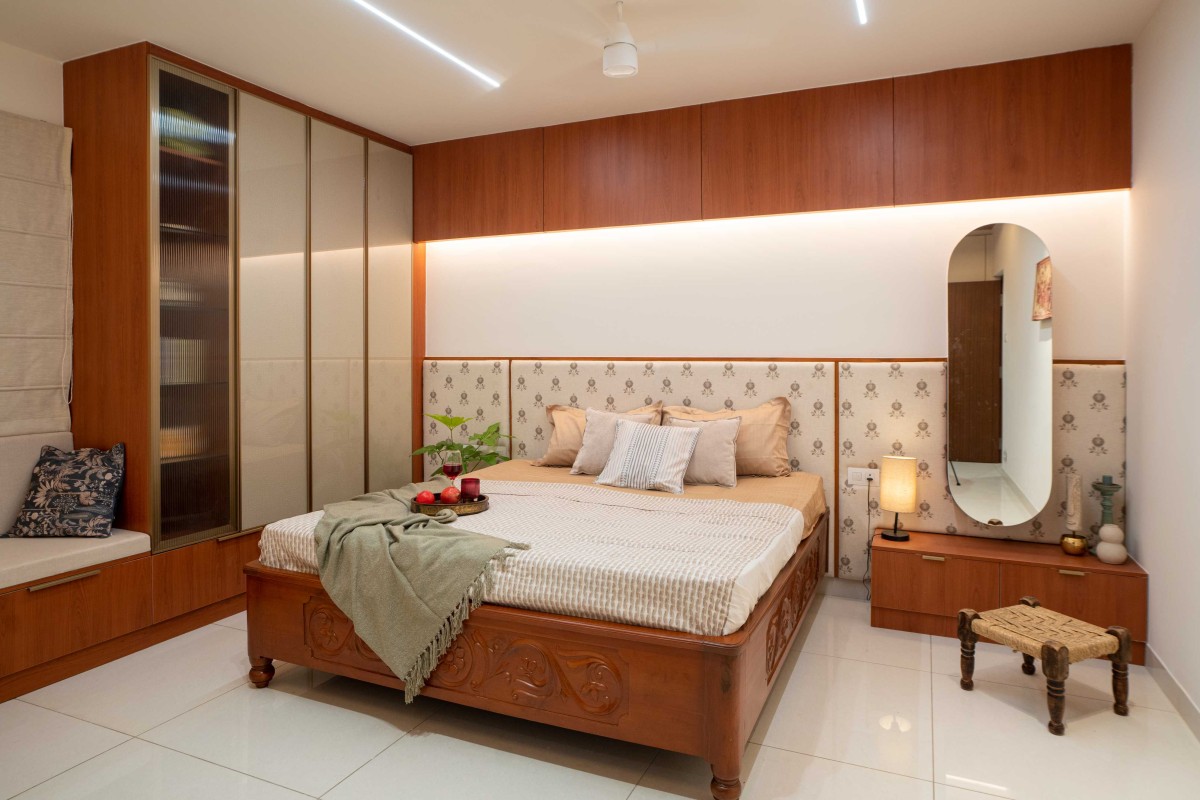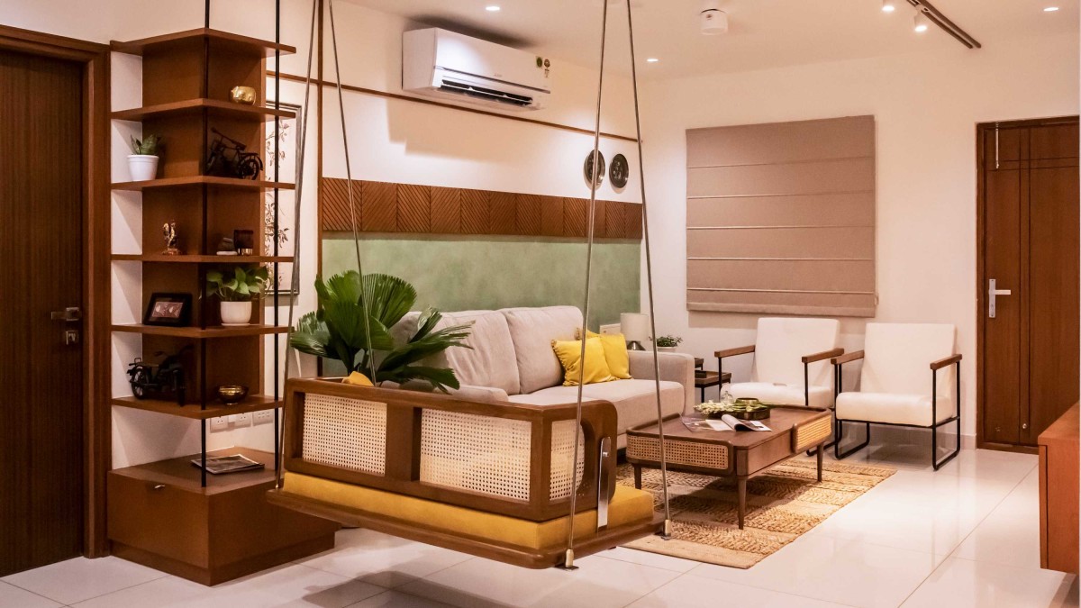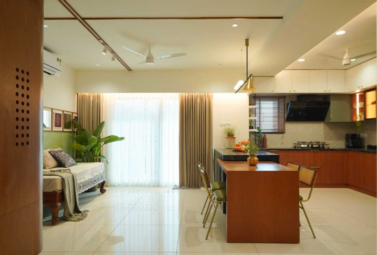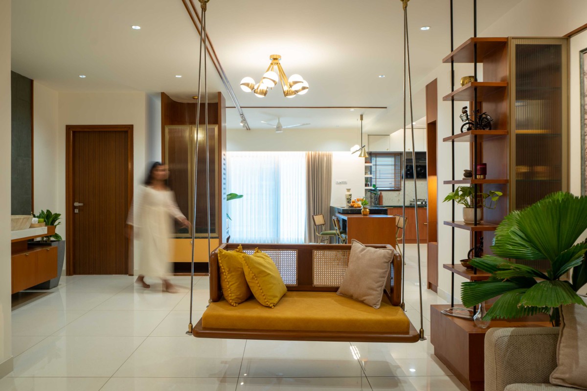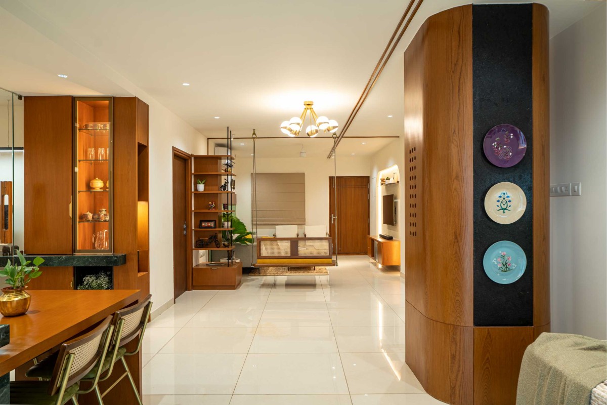 We took inspiration from Indian materials and elements, and recreated them in a modern framework, using hardwood paneling on walls with simple, clear lines in the place of intricate woodwork patterns, bringing warmth to the home. Whereas, accents of lush green lime plaster and vibrant yellow fabrics thread through the home, energizing the otherwise grounded palette, tying the individual spaces into a unified whole. The indian green marble is widely used in the home, enriching the overall ambience of the space. While, handcrafted rattan mats, woven jute textures and fabrics with Indian motifs are integrated with modern and minimalistic furniture. Traditional brass elements make a subtle return through delicate handles, lighting fixtures, and decor pieces—bringing a touch of heritage into the modern setting. Traditional features like the ancestral furniture and artisanal woodcraft played a central role in infusing the home with a deeply personal and enduring character.