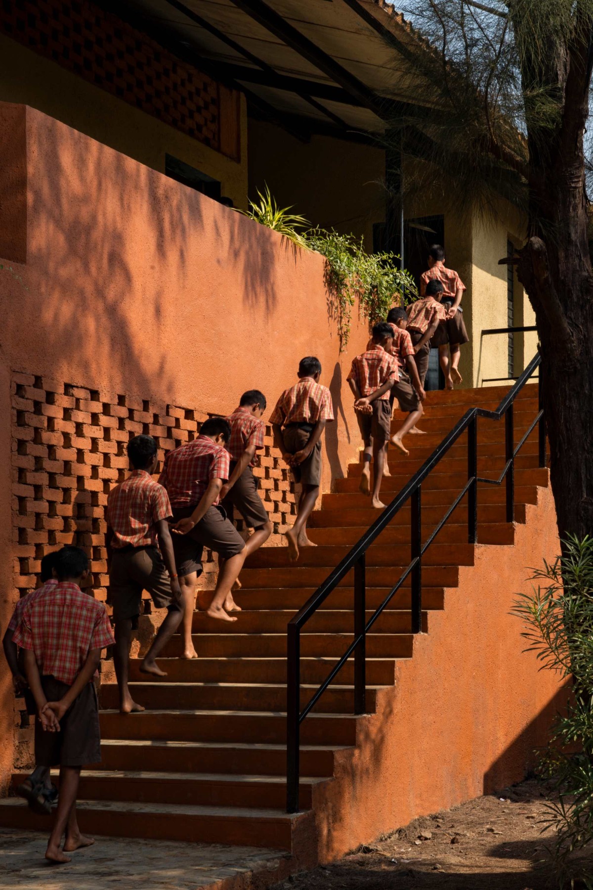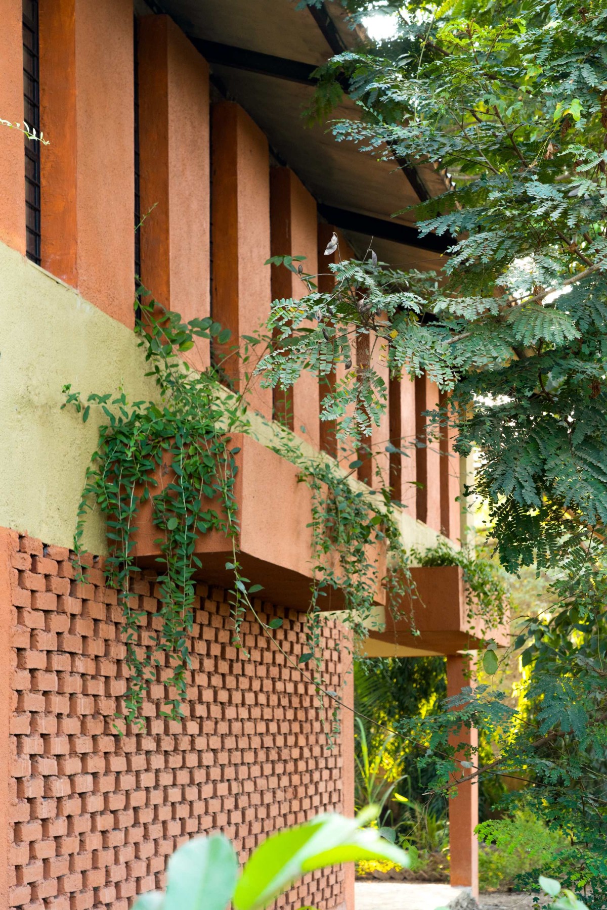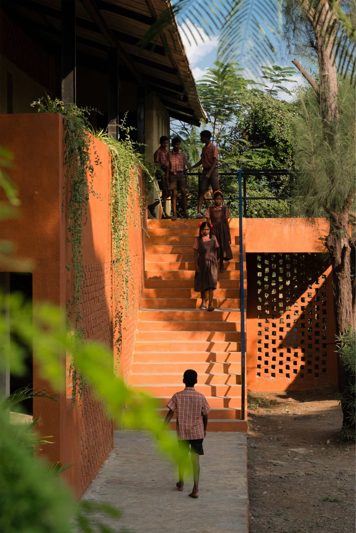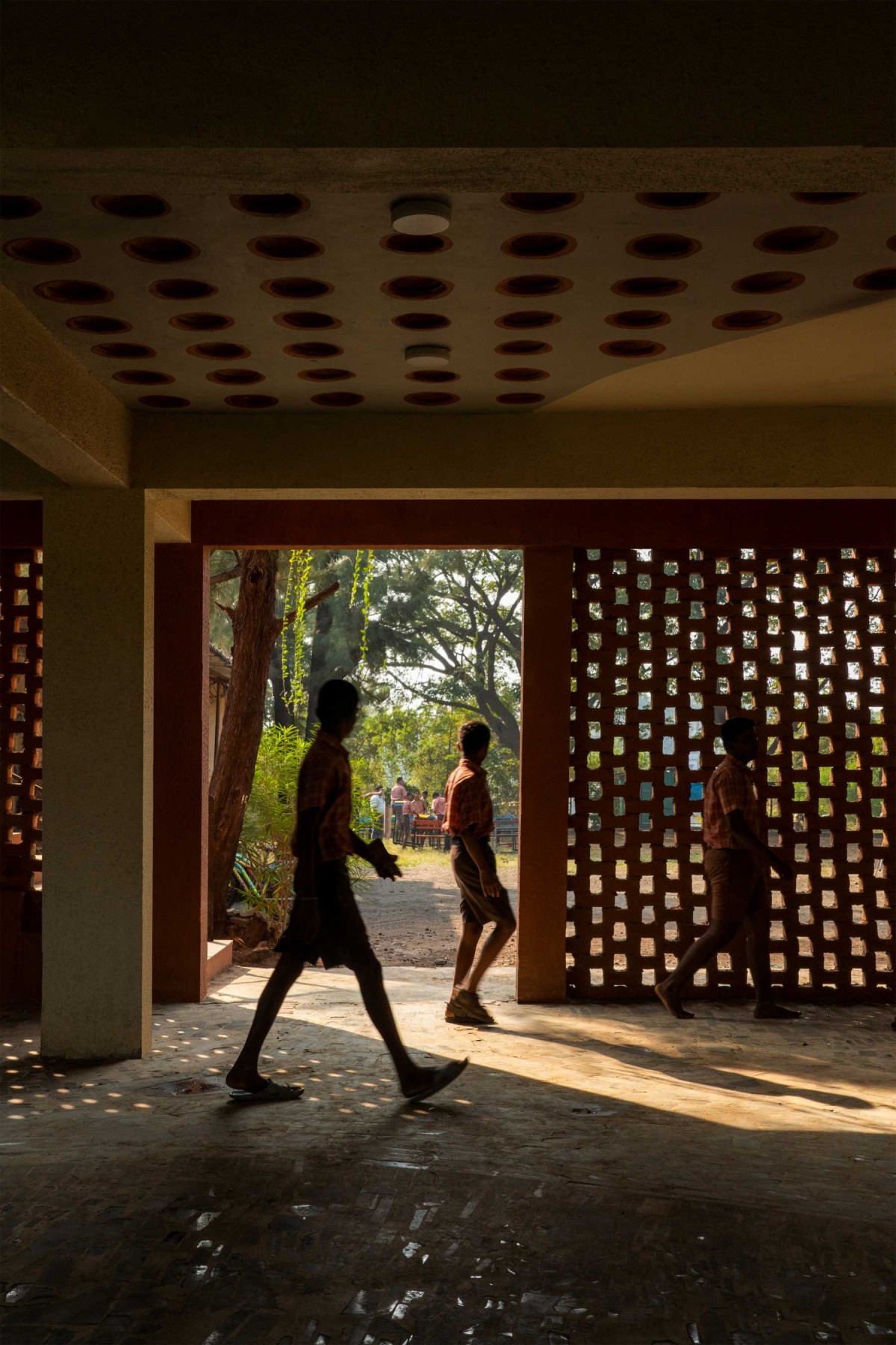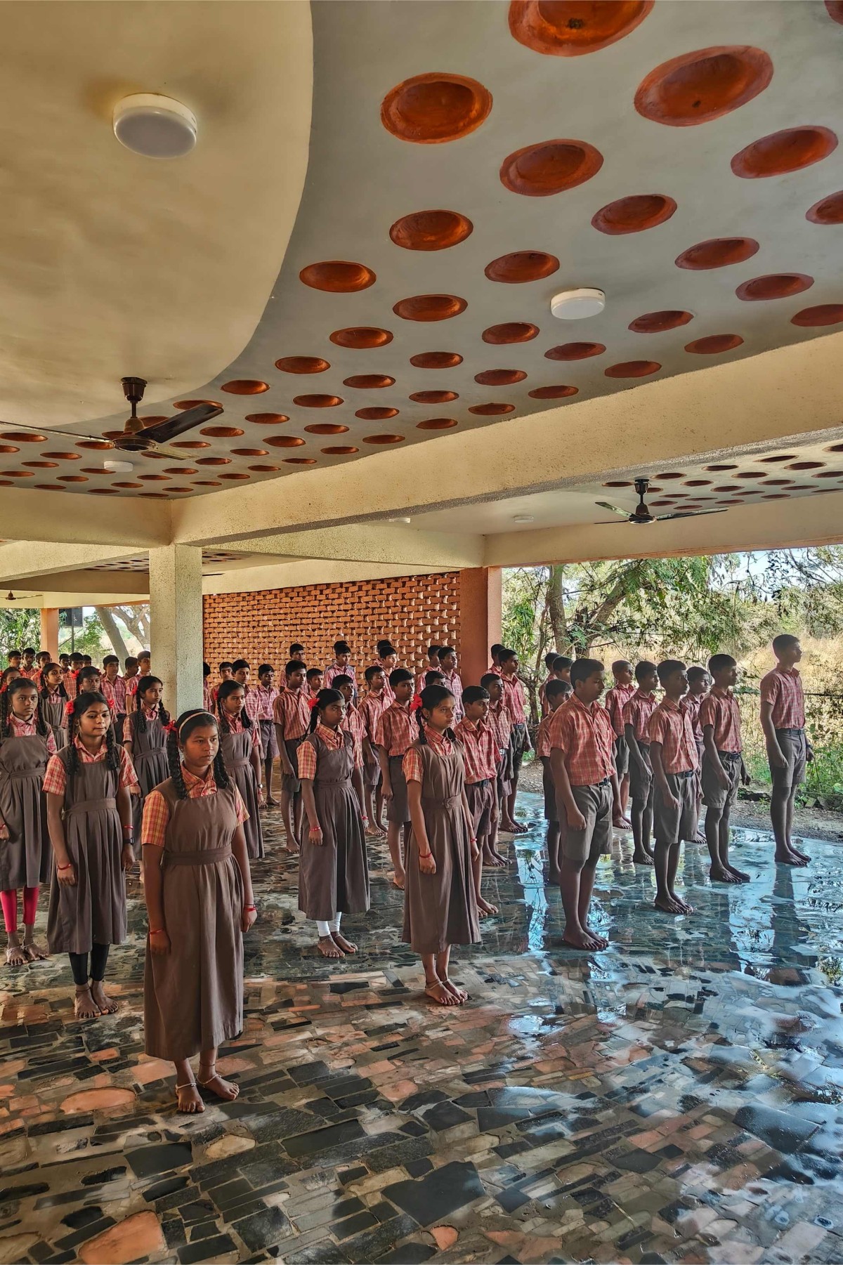 A locally sourced material palette helped in achieving an unbelievable construction cost of Rs.1200 per sq.ft. (13.5$. per sq.ft), ensuring low carbon footprint for construction. With a concrete framework, the body of this sustainable school is built in locally baked red bricks, laid in Rat-trap bond. This reduces the brick quantum, while providing thermal insulation to classrooms. Brick Jalis at strategic locations act as visual filters, also ensure breeze flows. Filler-Slab technique has been used for the ground floor, wherein locally crafted earthen disks are inserted in a free-flowing ceiling pattern, reducing concrete quantity while adding vernacular aesthetics.