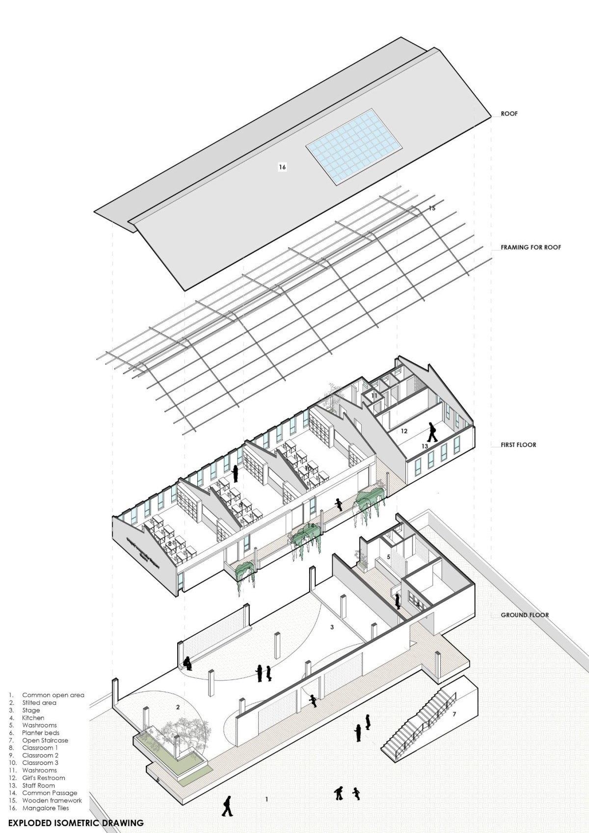 Exploded isometric of Flood Affected School at Kelthan Village by unTAG Architecture and Interiors
