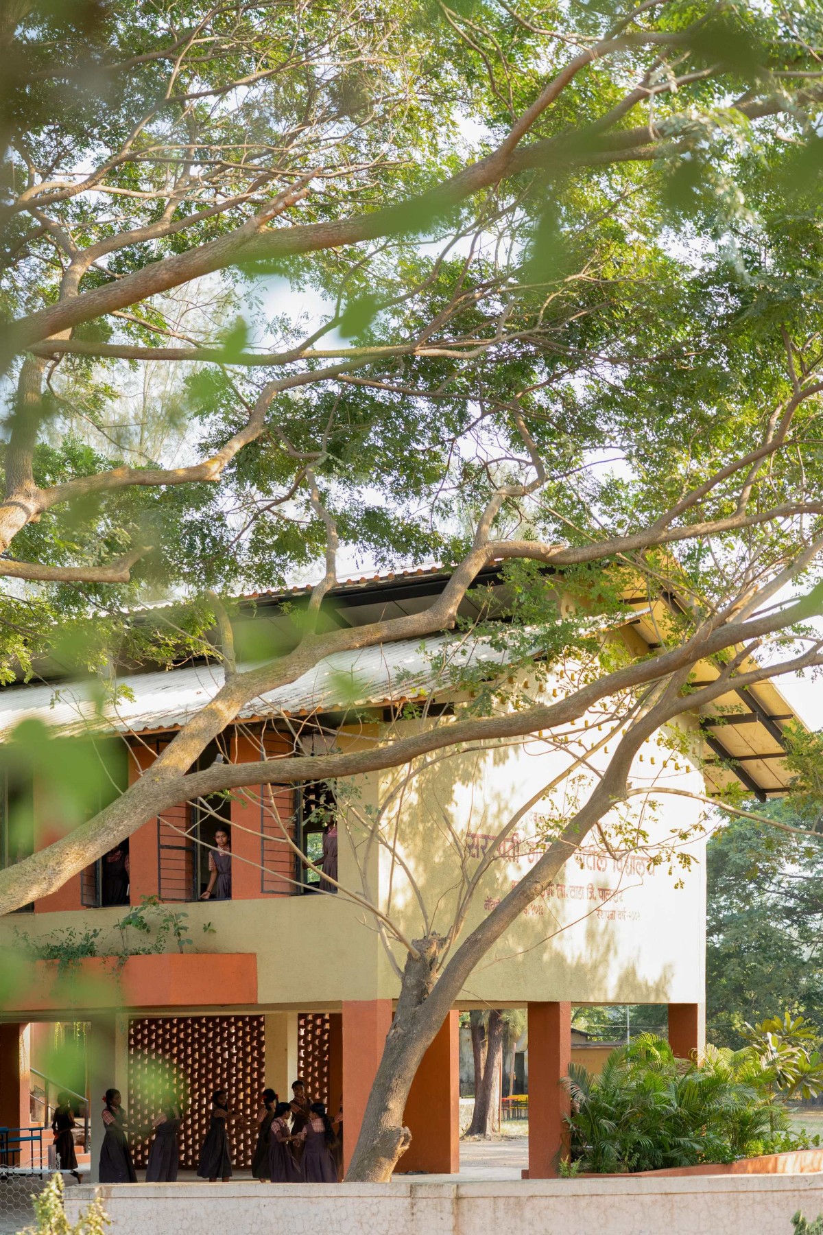 Recycled Indian stone flooring using waste stones sourced for free from local vendors, is used to lay the ground floor, a pattern inspired by the meandering Tansa river. Insulated puff panels for roof ensures the classrooms stays thermally comfortable throughout the year. Roof-mounted Solar panels make the school net-zero, self-reliant in its energy needs. The school façade imagined as a biophilic interface, has green planters as an important design element, maintained by school students. The surrounding open space has been partially used by students to grow seasonal vegetables, used for midday meals. The students alongside farmer parents contributed to the construction through shramdaan, as hands-on site training of alternative techniques given by Architects, adding to the skills of locals.