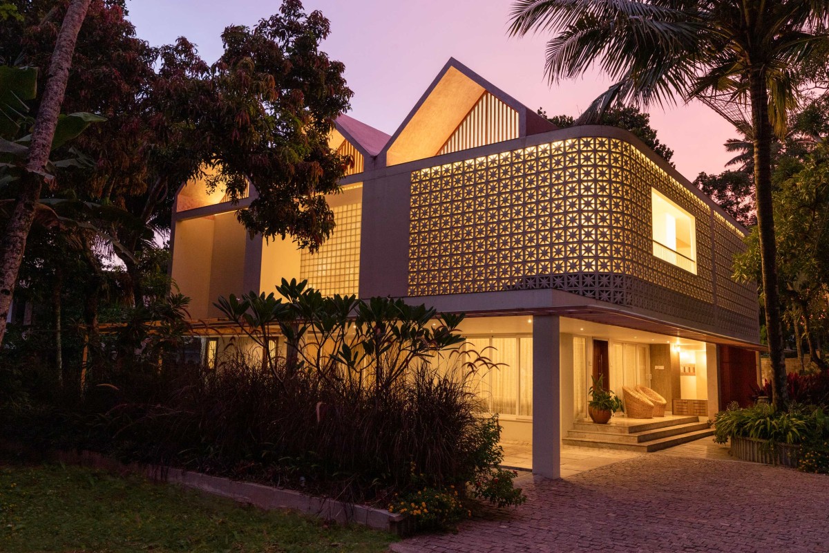 Night exterior view of Folded Canopy House by NO Architects Designers and Social Artists