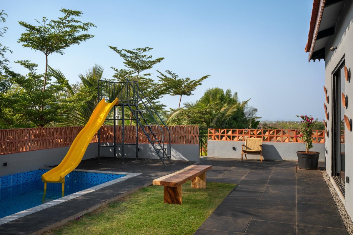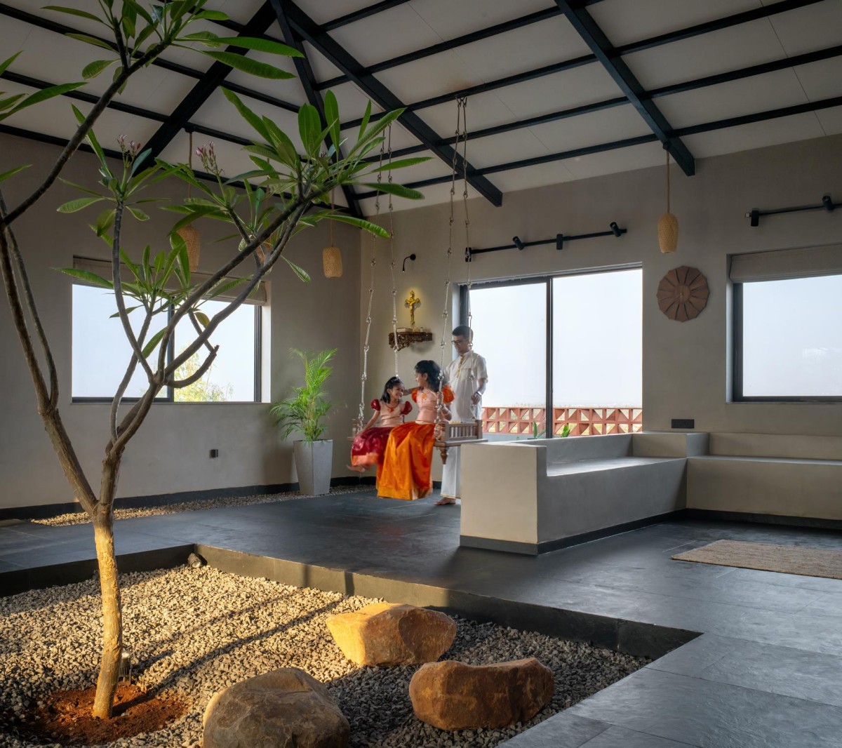 The entrance is marked by a grotto, creating a spiritual threshold that imparts positive energy to the home. Sustainability is central to the material palette: red bricks, Mangalore tiles, and an abundance of greenery both inside and out.