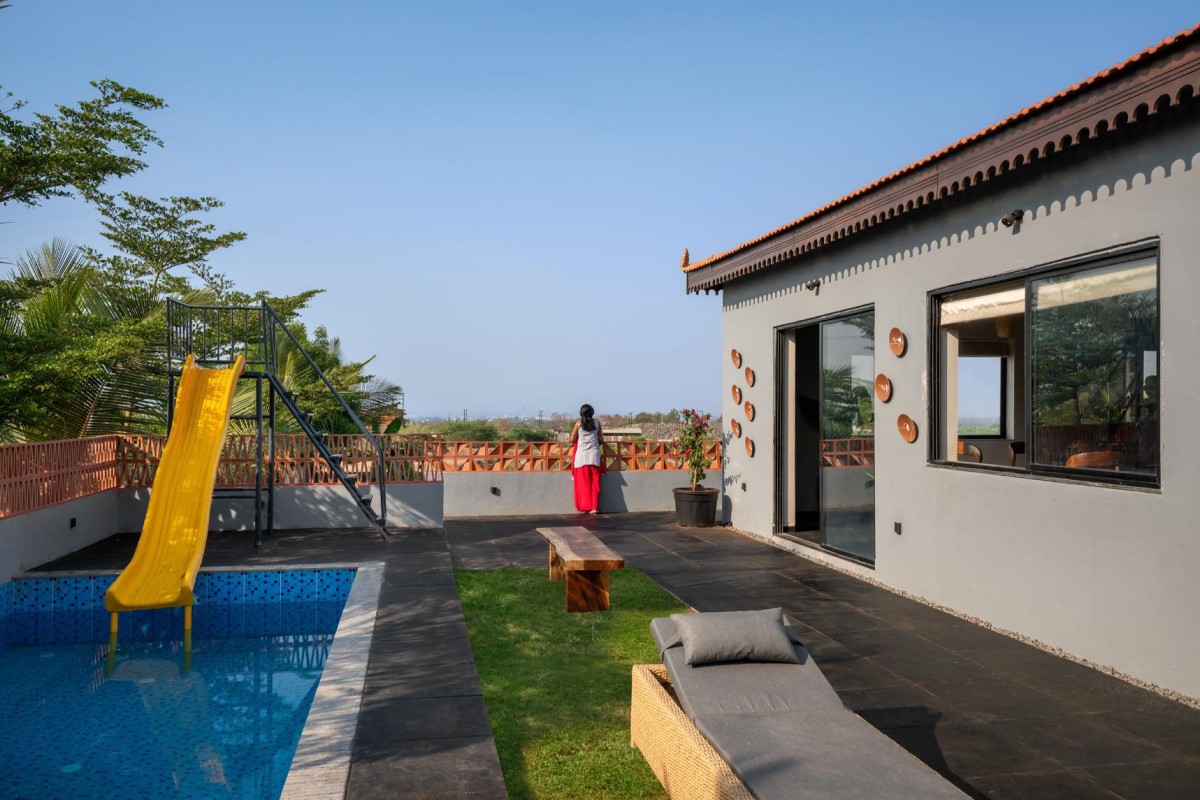 To the west, a deck extends into a manicured lawn and swimming pool—perfect for soaking in golden-hour hues over the hills. On the northern side, a carefully designed pathway leads through the organic farming zone, symbolizing the client's passion for sustainability and homegrown food.