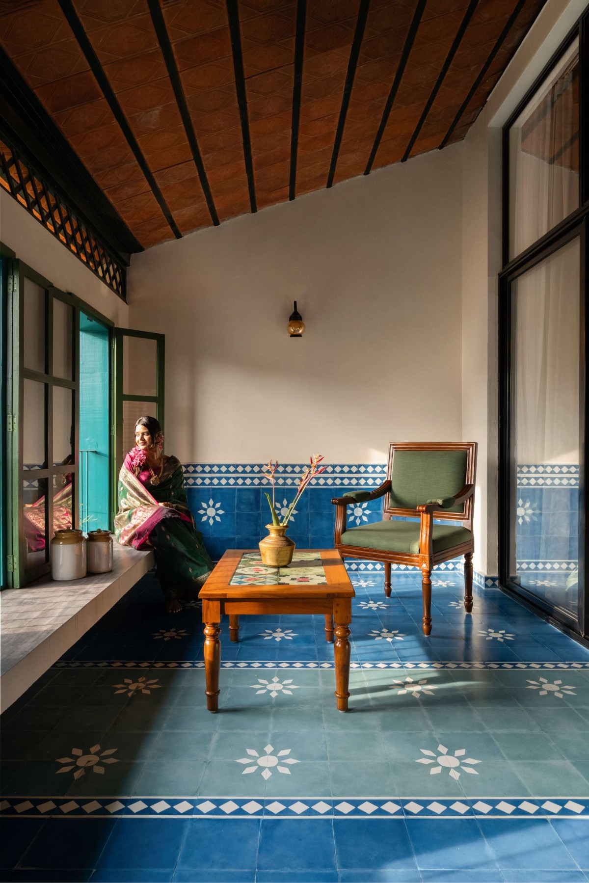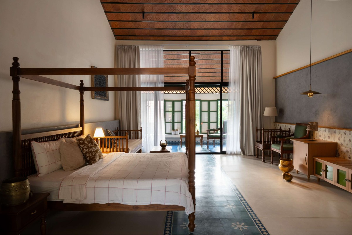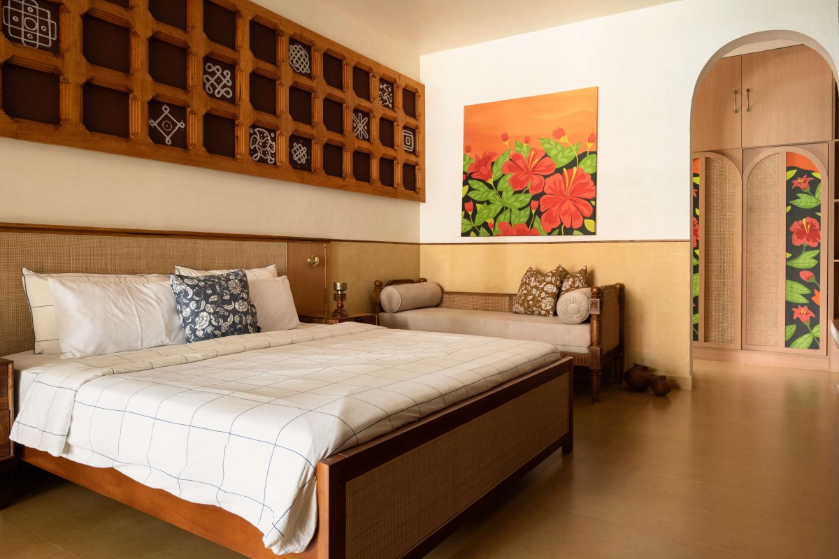 The three guest rooms are generous in scale, each expressing a distinct variation of the same overarching theme. While the client brought in numerous visual references from social media, the design process focused on distilling these inspirations into a cohesive language—one that feels elegant yet unpretentious. The resulting aesthetic is an amalgamation of agraharam-inspired patterns and details, layered with references to hyper-local flora.
