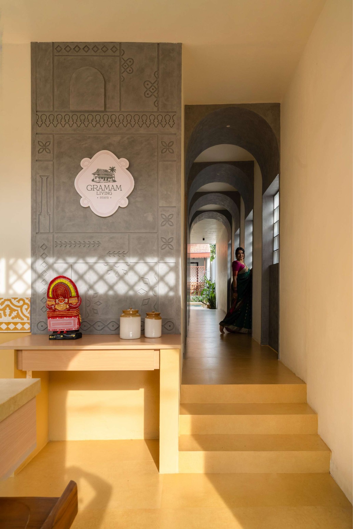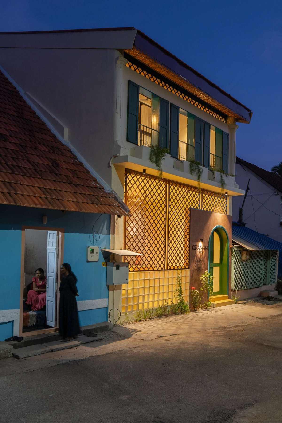 Wooden elements, kolam motifs, and handcrafted details are complemented by landscaping and visual cues drawn from familiar regional flowers such as thetti and hibiscus. These elements subtly reinforce the project’s name—Gramam—anchoring it firmly in a sense of place and collective memory.
