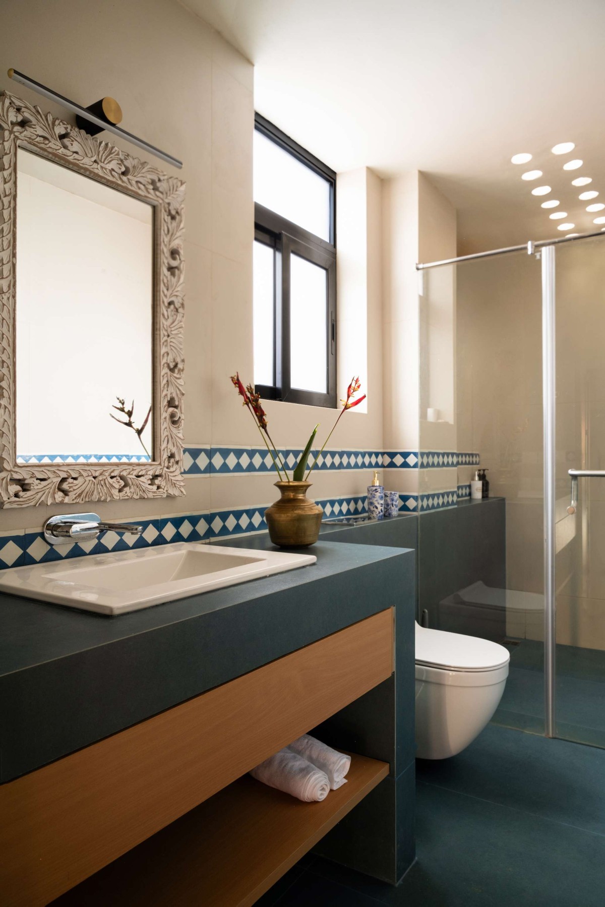 A recurring cross pattern animates the façade and continues seamlessly into the interiors, emerging subtly across partitions, cabinetry, and detailing. This motif acts as a connective tissue throughout the project, visually tying together the exterior and interior narratives.