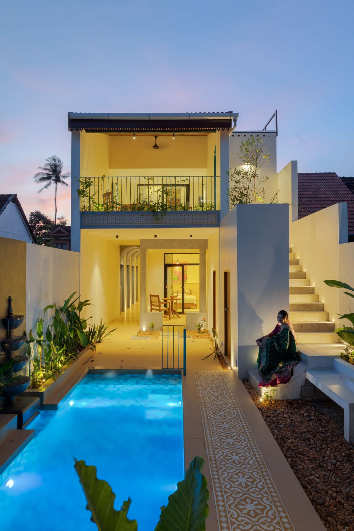 Dusk light view of pool side area of Gramam Living by Sarwaa by A N Design Studio