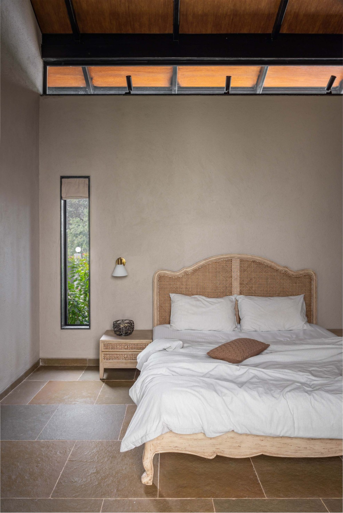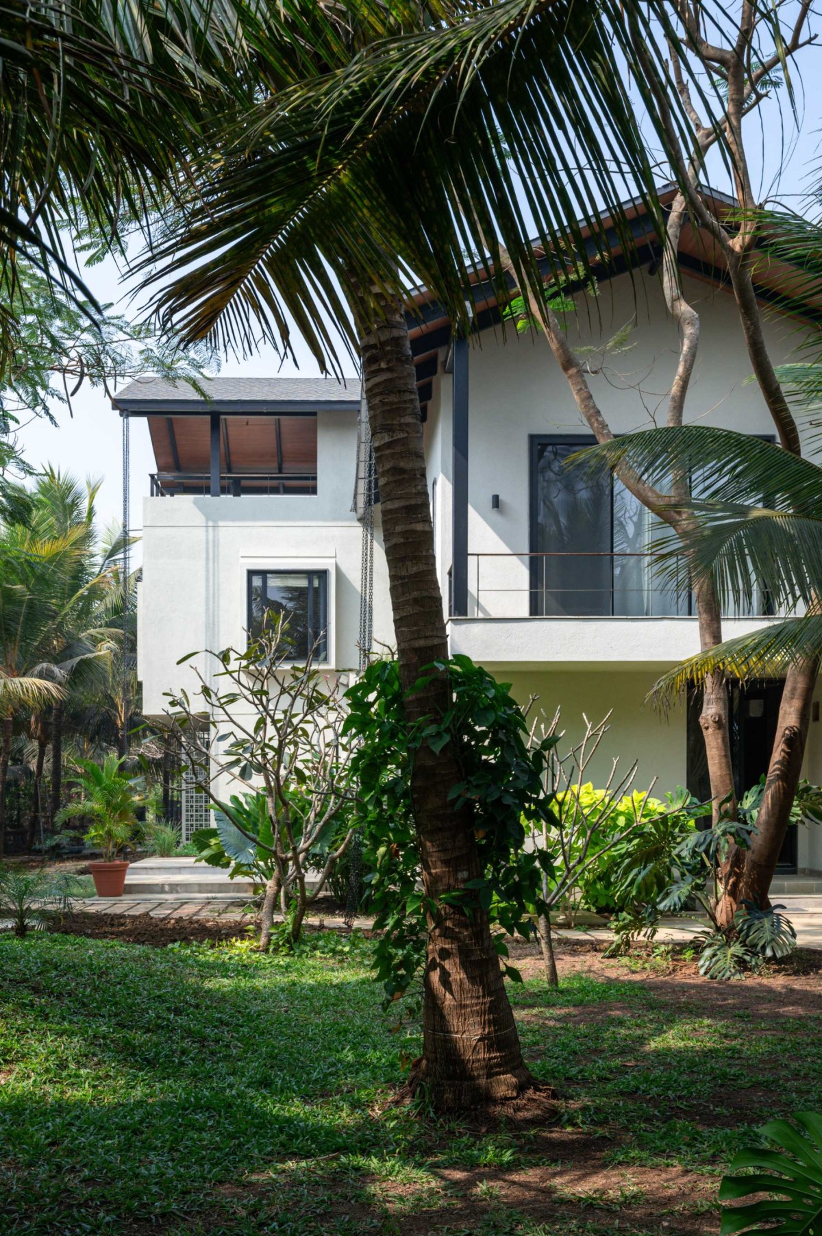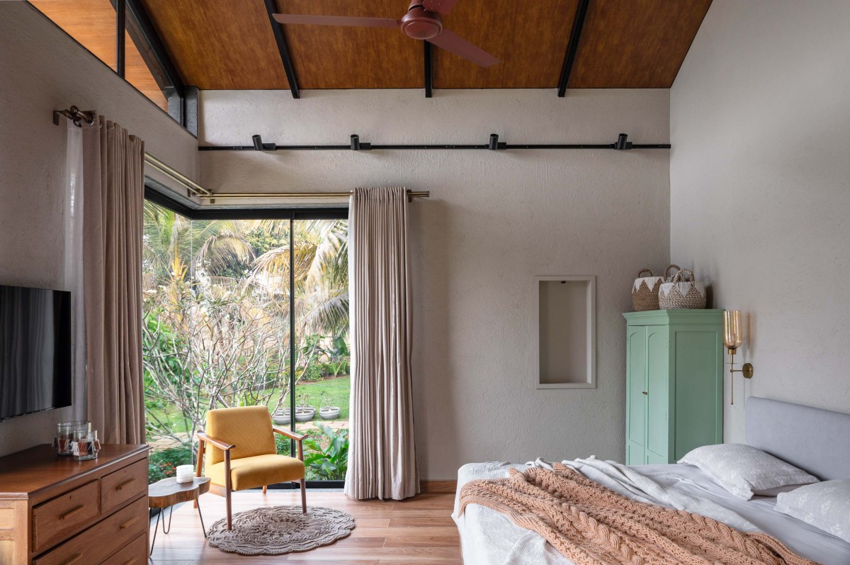 The house occupies the open western half of the 1 acre plot with the dense coconut grove to its east, preserving every tree that stood on the site before construction. The home is imagined as a three-sided open courtyard layout, with the pool house at a distance completing the forth side. The layout consists of two parallel wings with the living area and guest room on the west and the lower master bedroom in the east, connected by the semi-public spaces such as the covered verandas, kitchen and the staircase. Most of the public and private spaces open towards the north, facing pool house and lawn, drawing in the mellow, indirect light throughout the day.