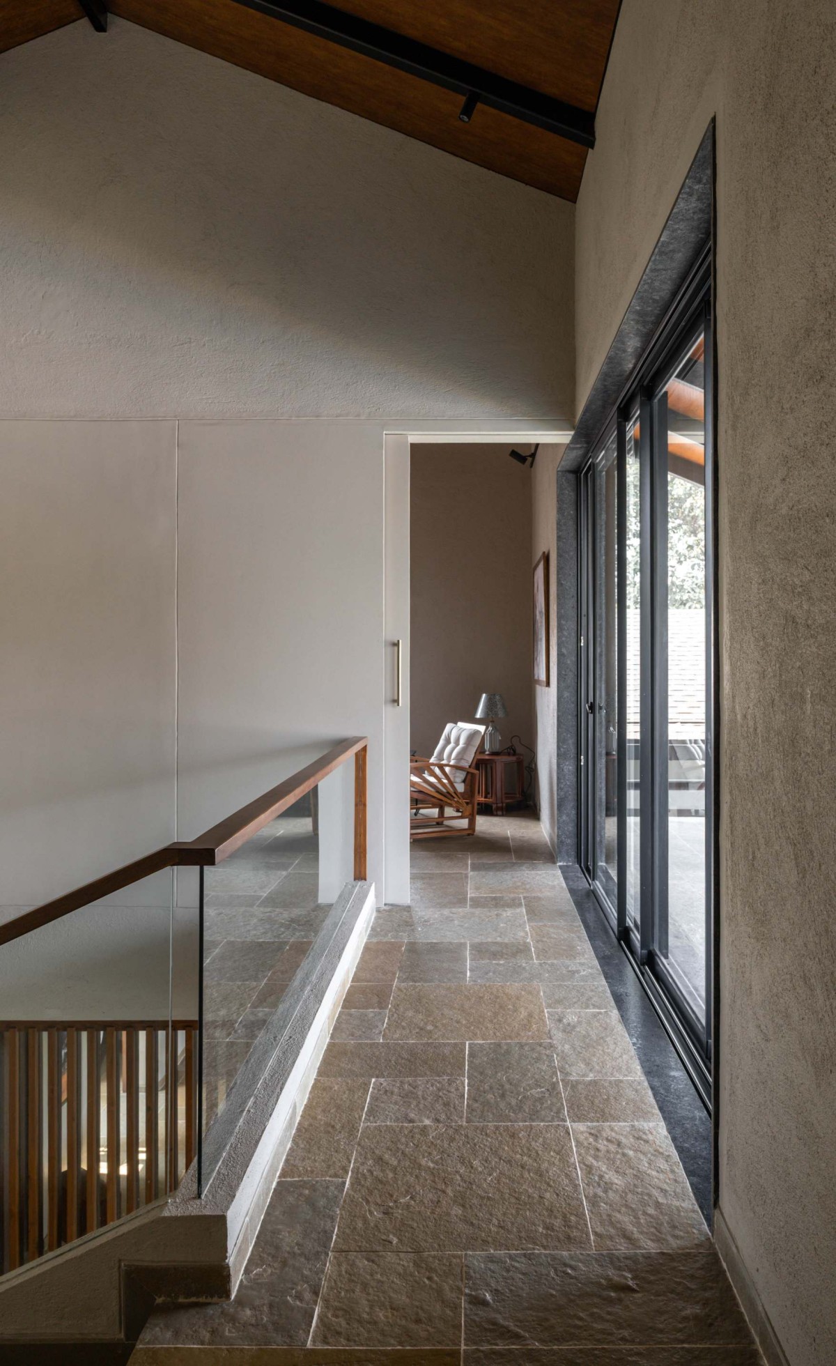 Responding to the heavy Monsoon rains, the gable roofs over each block imbibe one of the vernacular roof profiles prevailing in the region. The deep roof overhangs compliment the large north openings to limit heat gain into the building. Tall trees on the west and south add to this cause. The house celebrates Indian stone flooring with an abundant use of Shabad slabs in the majority of the spaces. The interior design of the house is eclectic and elaborate mirroring the clients taste in timeless wooden furniture, textiles and décor. The palette effortlessly accommodates several heirloom furniture pieces from the clients' home in Kanpur, adding a strong layer of family's identity to the home. The indirect roof lighting and curated artworks are warm up the spaces making them unique.