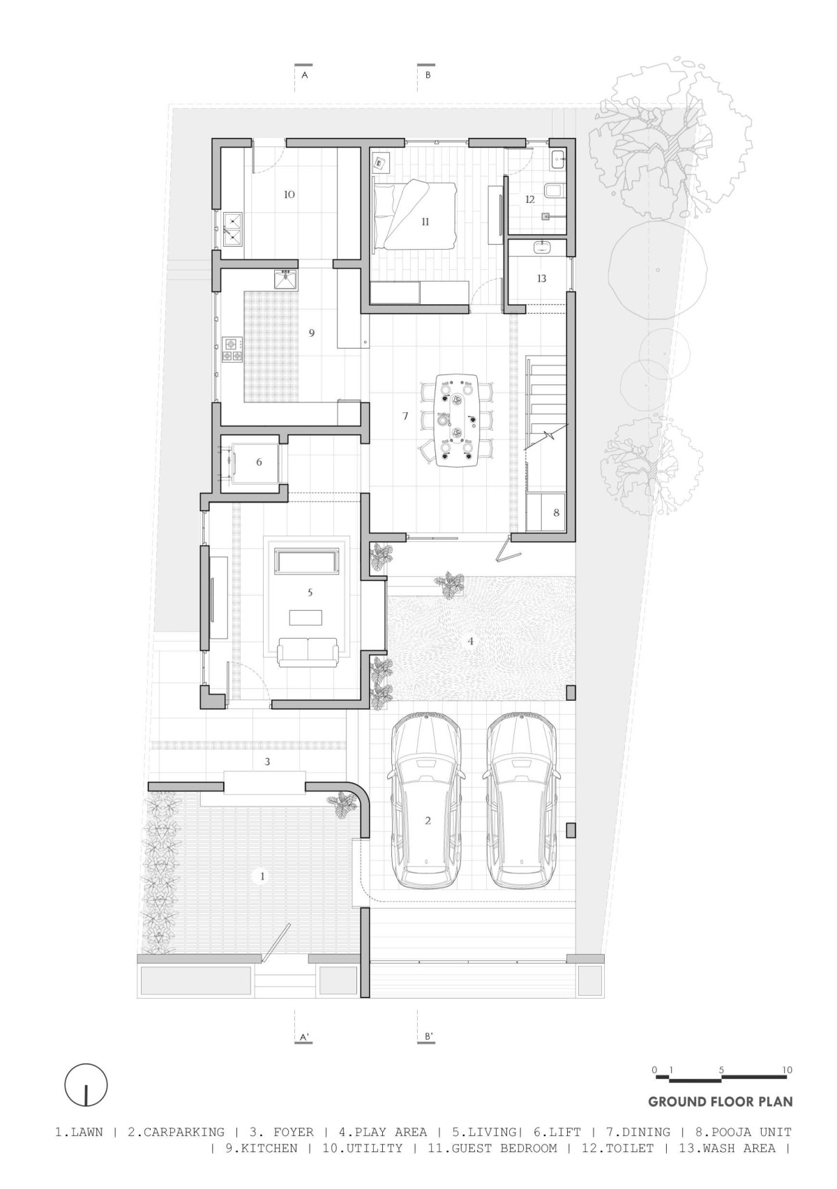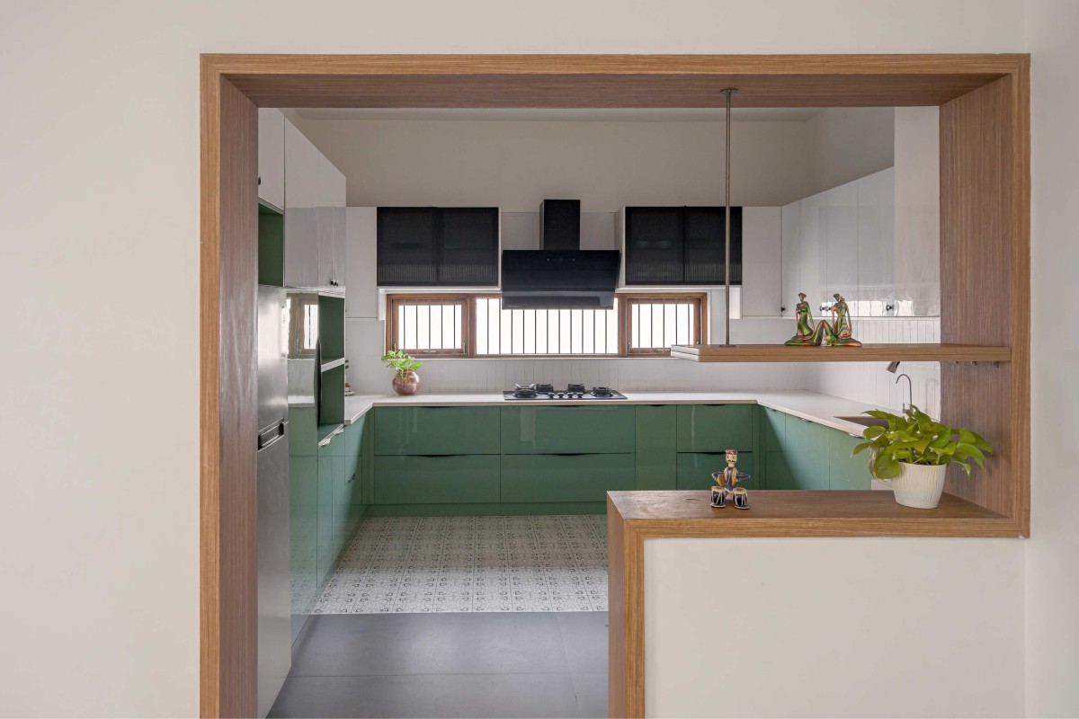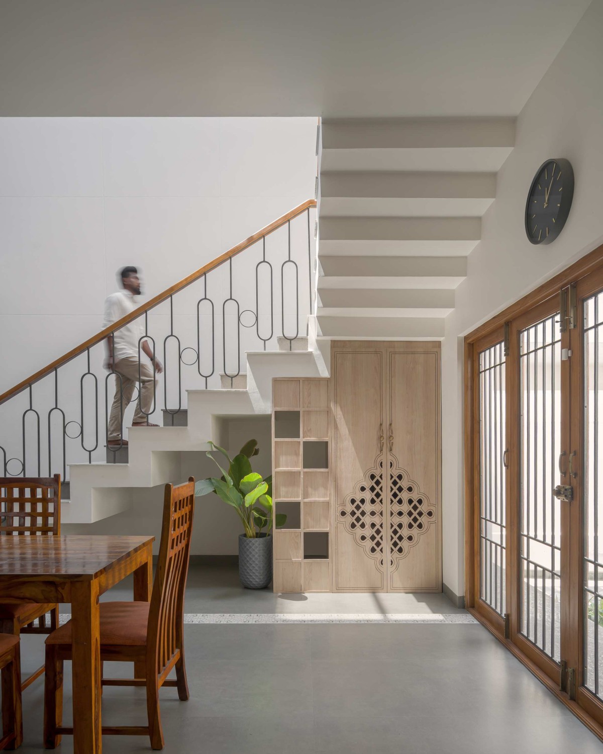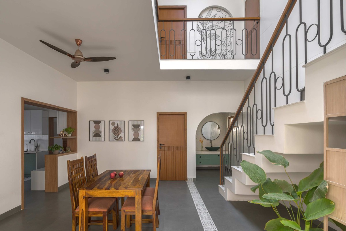 View of the double height dining and pooja unit of Harmony House by D.L.E.A