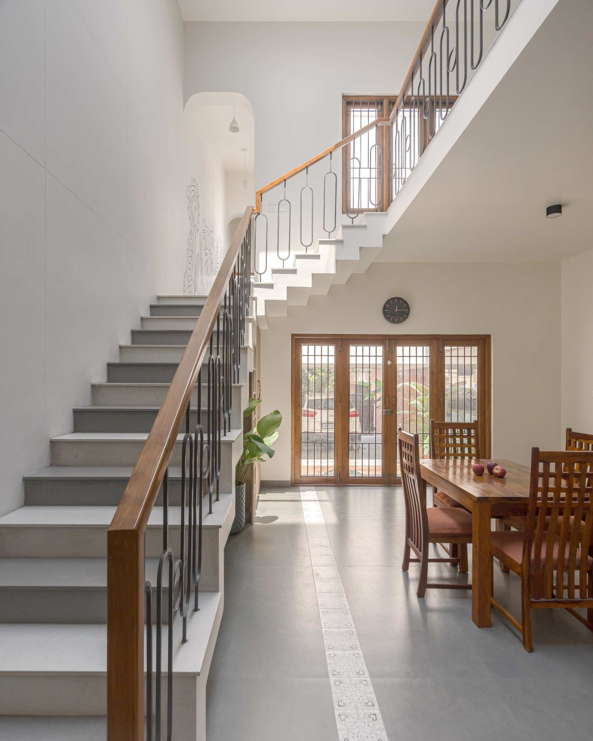 View of the double height dining and staircase of Harmony House by D.L.E.A