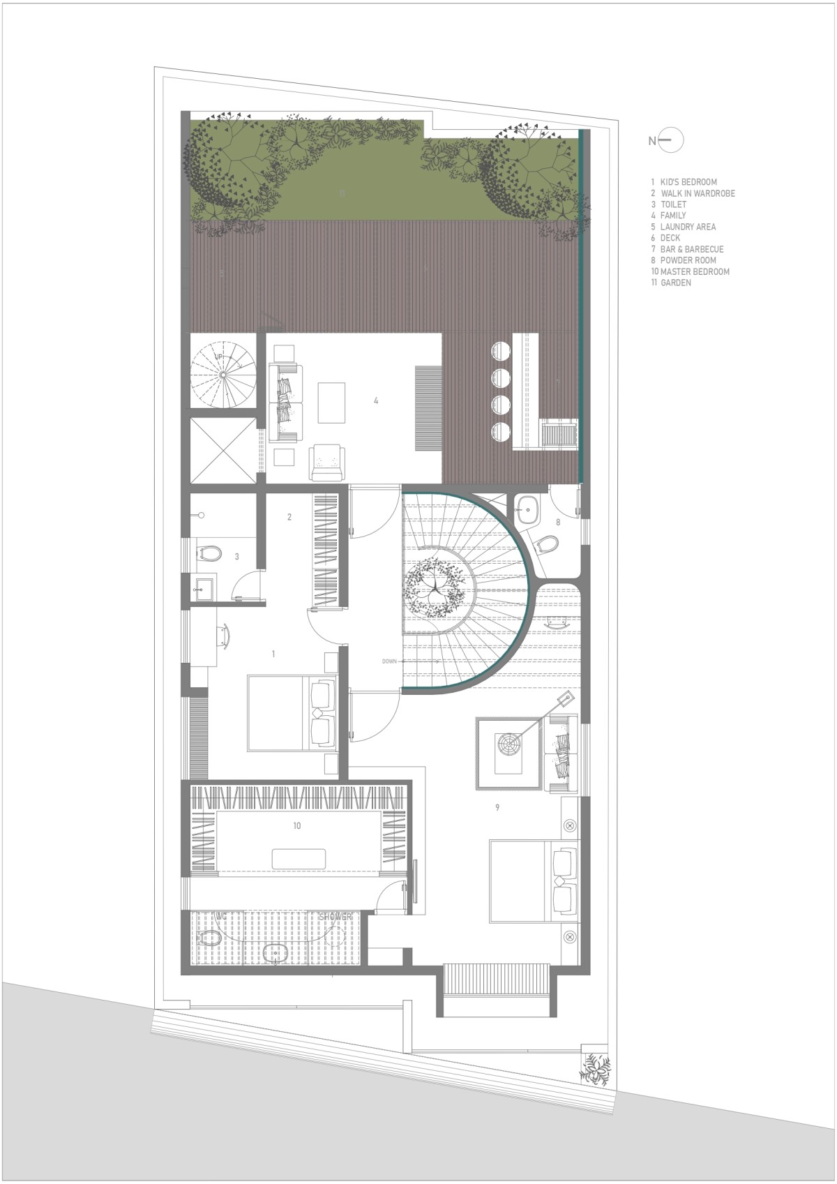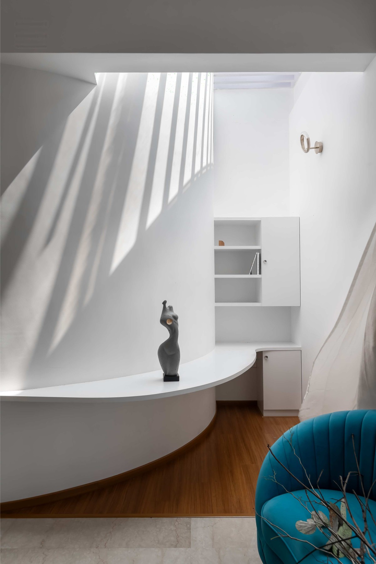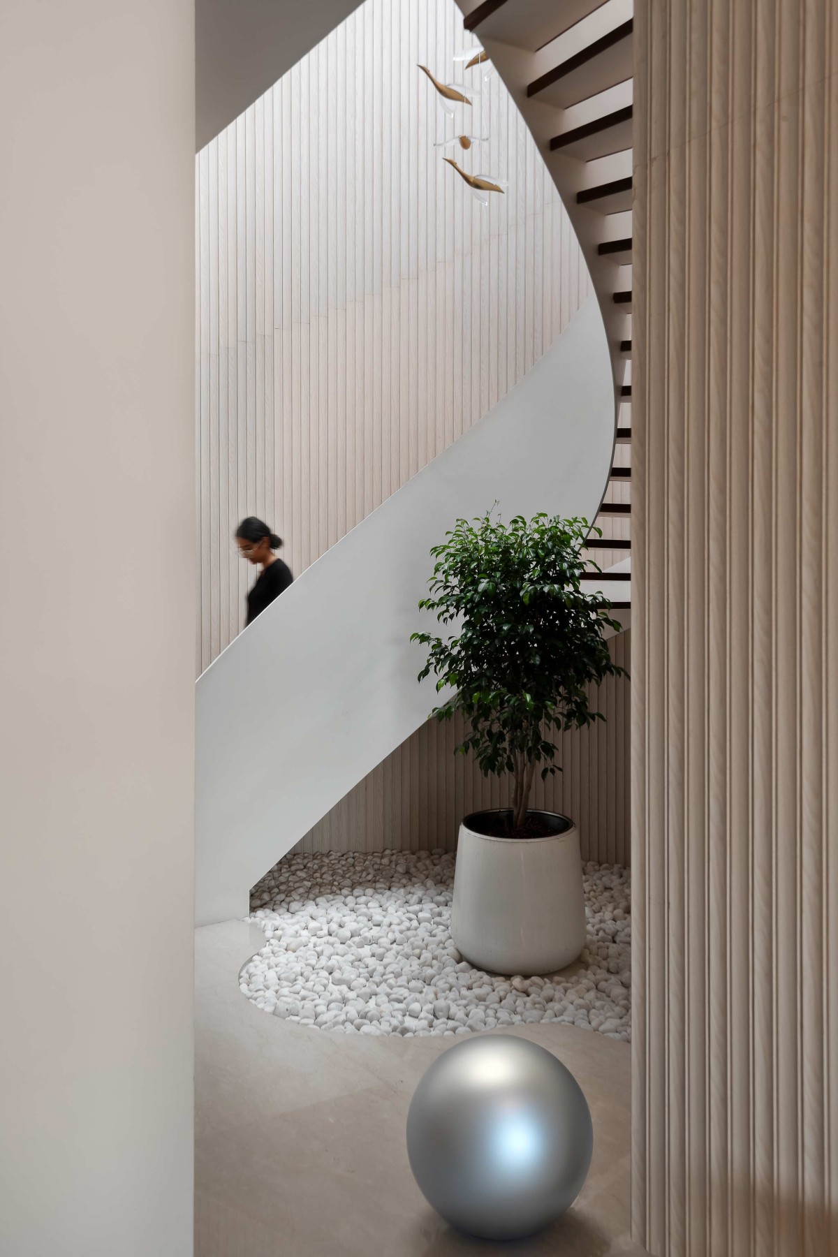 Upon entering, the eye is immediately drawn to a stunning helical staircase, a sculptural centerpiece that sets a tone of contemporary elegance. This architectural marvel, with its fluid curves and impeccable craftsmanship, rises gracefully against the backdrop of a curved feature wall. The contrast between the staircase’s dynamic, swirling form and the clean, linear aesthetic of the surrounding space creates a striking visual impact, making it a focal point that embodies both artistic flair and structural ingenuity.