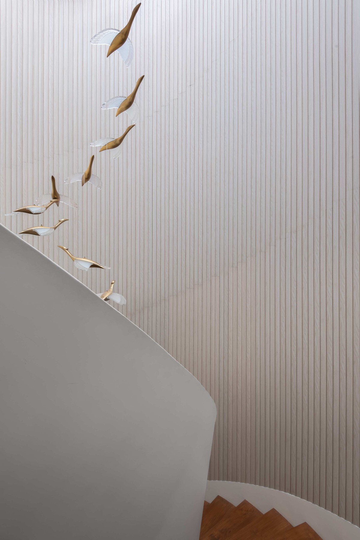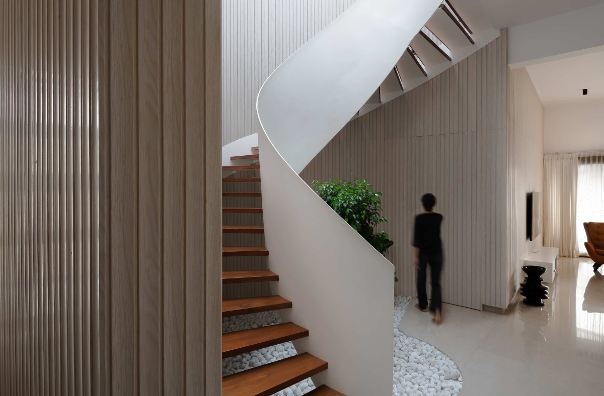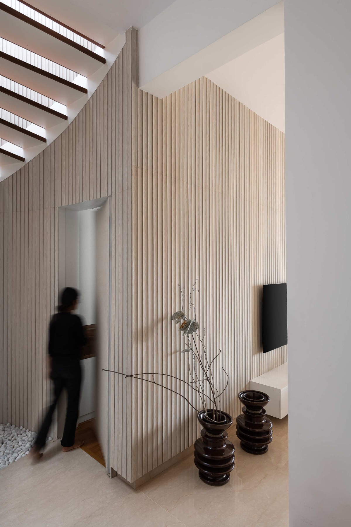 Fluted panel along staircase of Hemadri by Design Kacheri