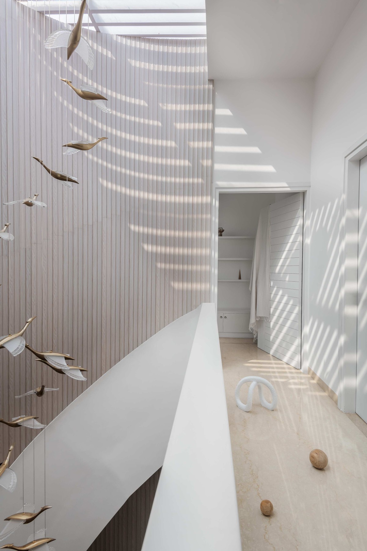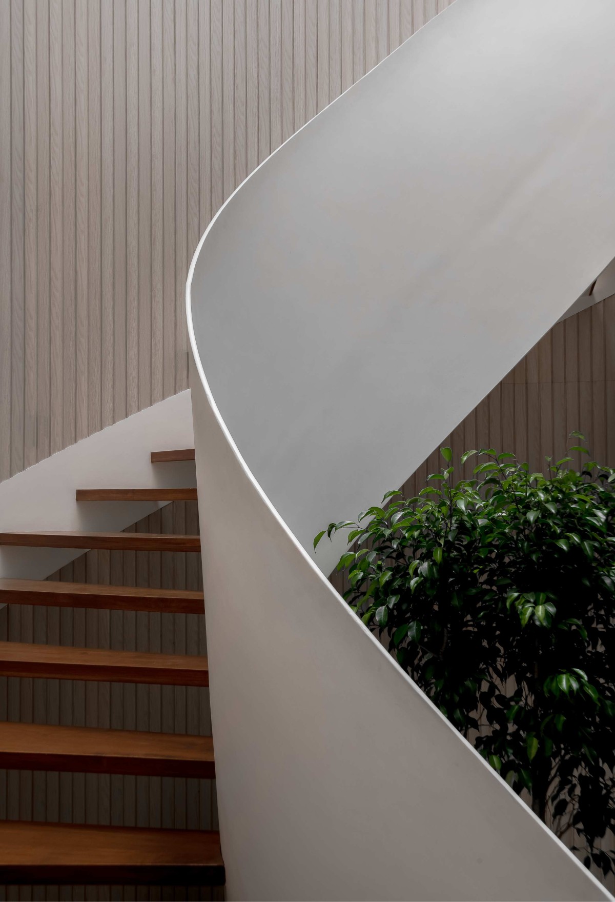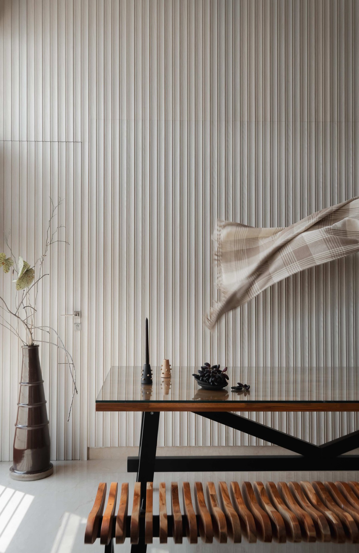 Fluted panel along staircase of Hemadri by Design Kacheri