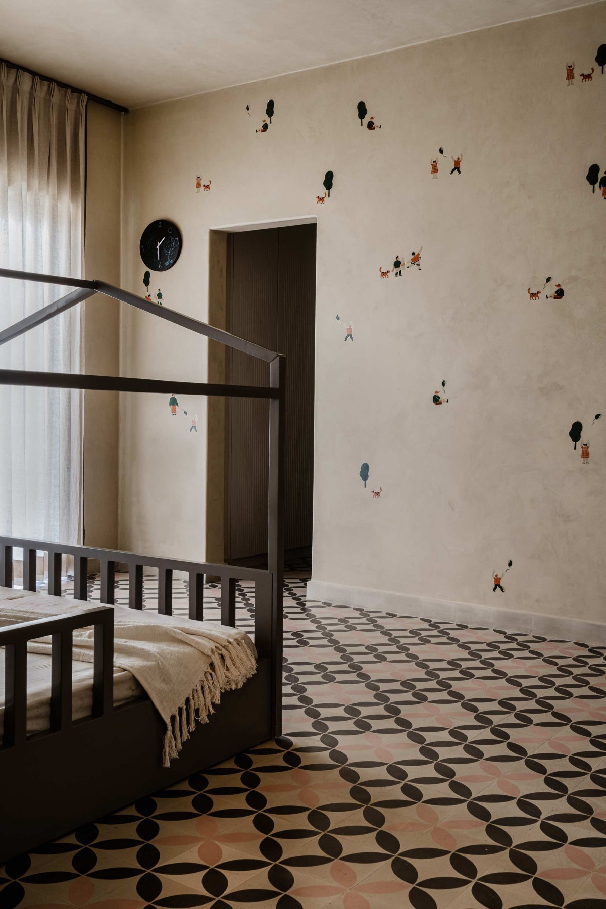 The kids' bedroom features a fun bed design in the shape of a hut. One wall is covered in custom-designed wall decals, scattered all over, depicting joyous scenes of the kids and their dog playing in the park, sleeping under a tree, and hula-hooping!