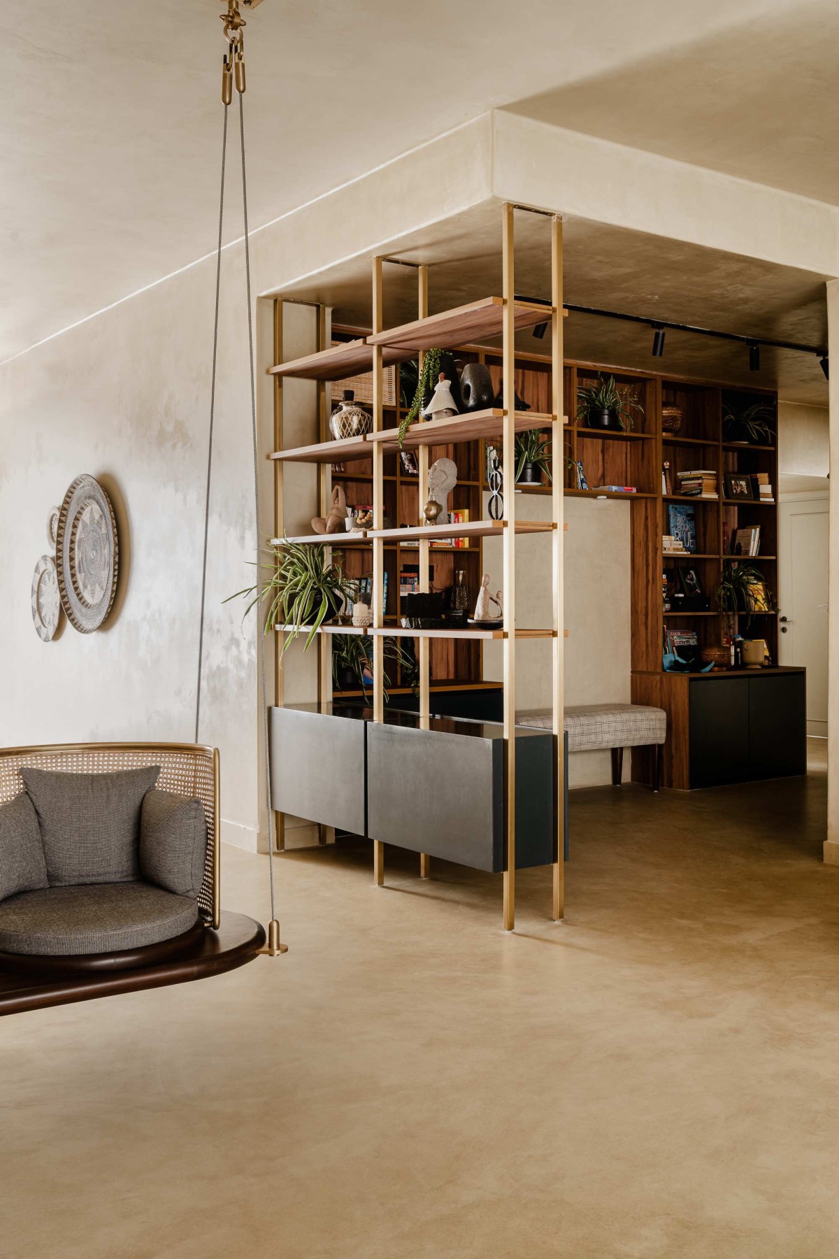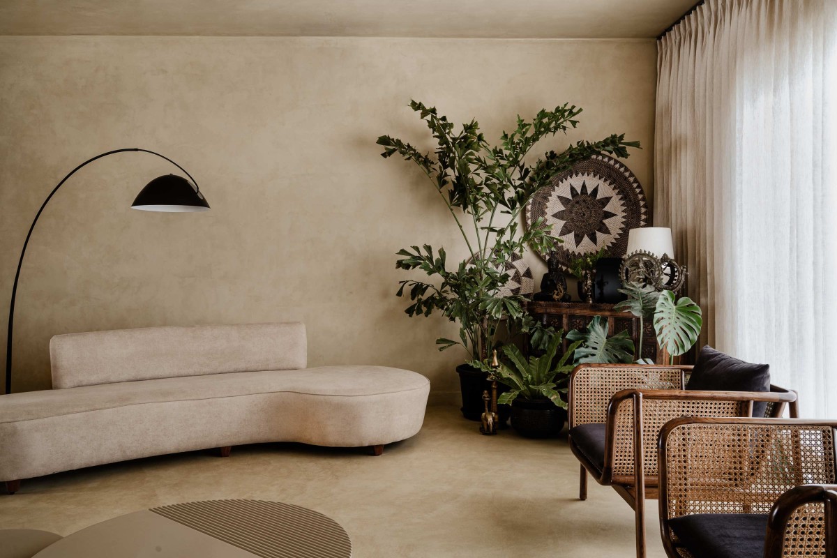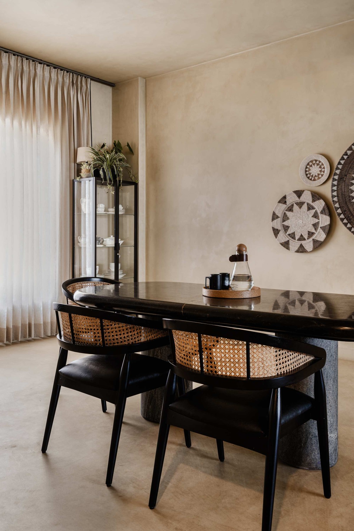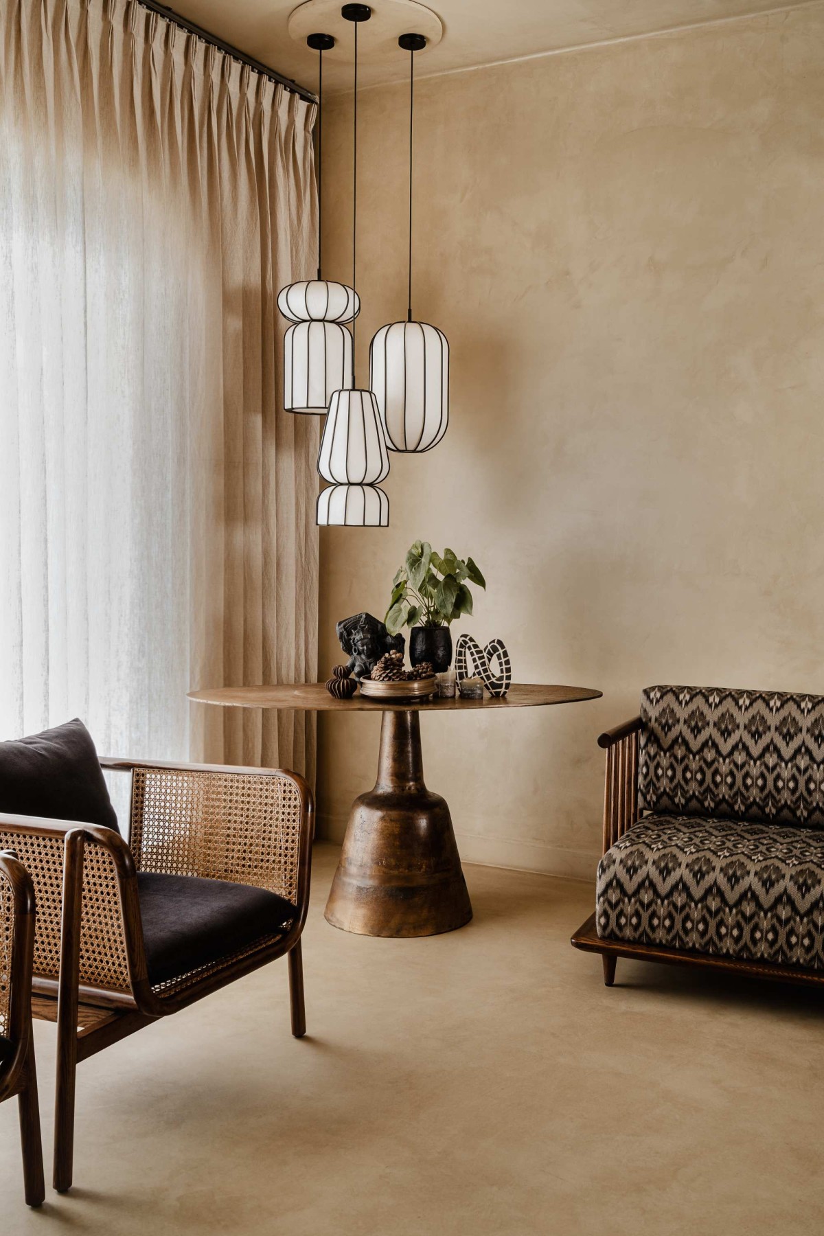 The living and dining areas have an open plan that flows seamlessly into one another. One standout feature of the living room is the corner filled with plants of varying species, creating an almost jungle-like ambiance around an old wooden carved chest. In the opposite corner, leather paper pendant lights by LxBxH hang above a brass console table, adding a soft glow to the space. Other elements include an upholstered curved sofa in a neutral palette, twin bucket chairs in cane, and a low-height wooden sofa with an open-fluted doweled back. The space is completed by a two-sided swing suspended from the ceiling, creating a visual separation between the living and dining areas without being obstructive. Ample sunlight that enters the rooms is filtered through linen curtains that blend into the textured walls.