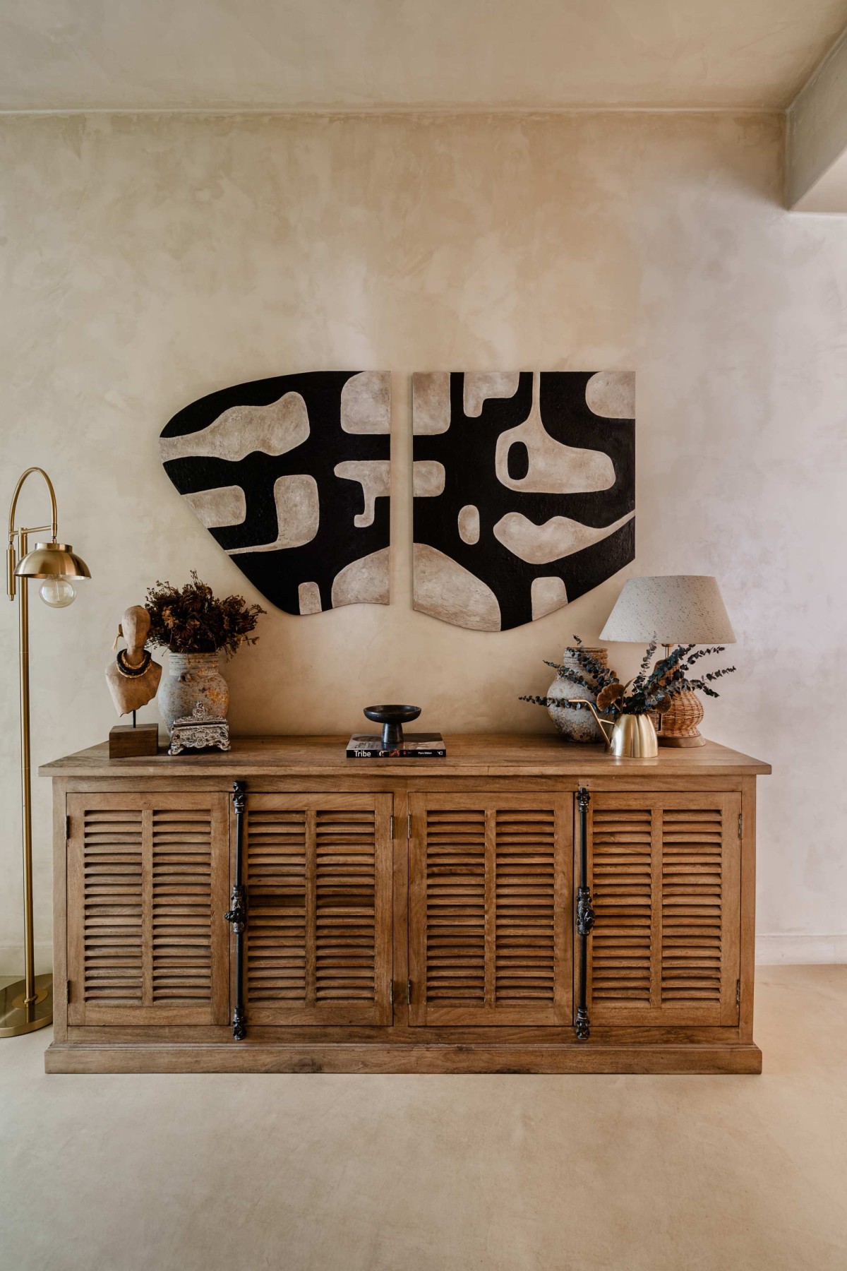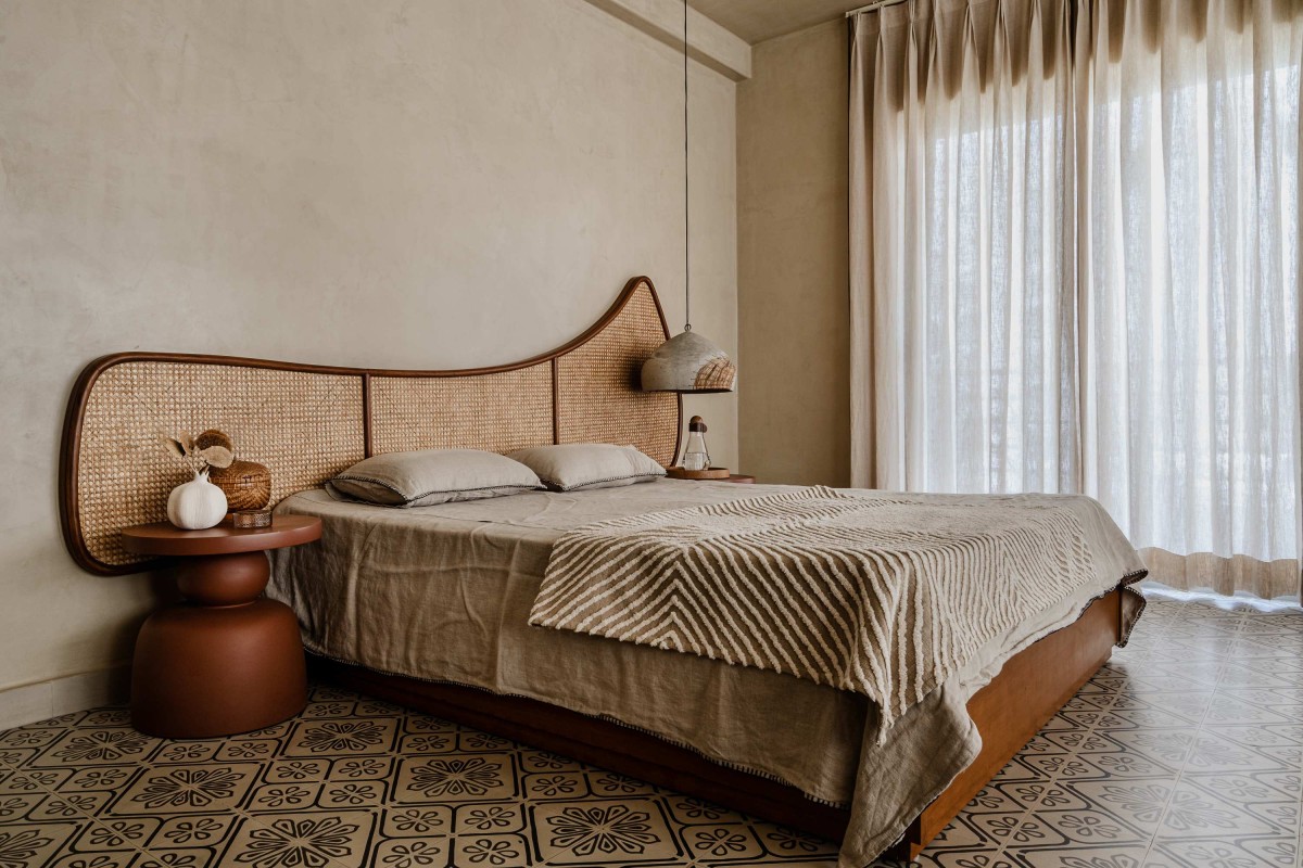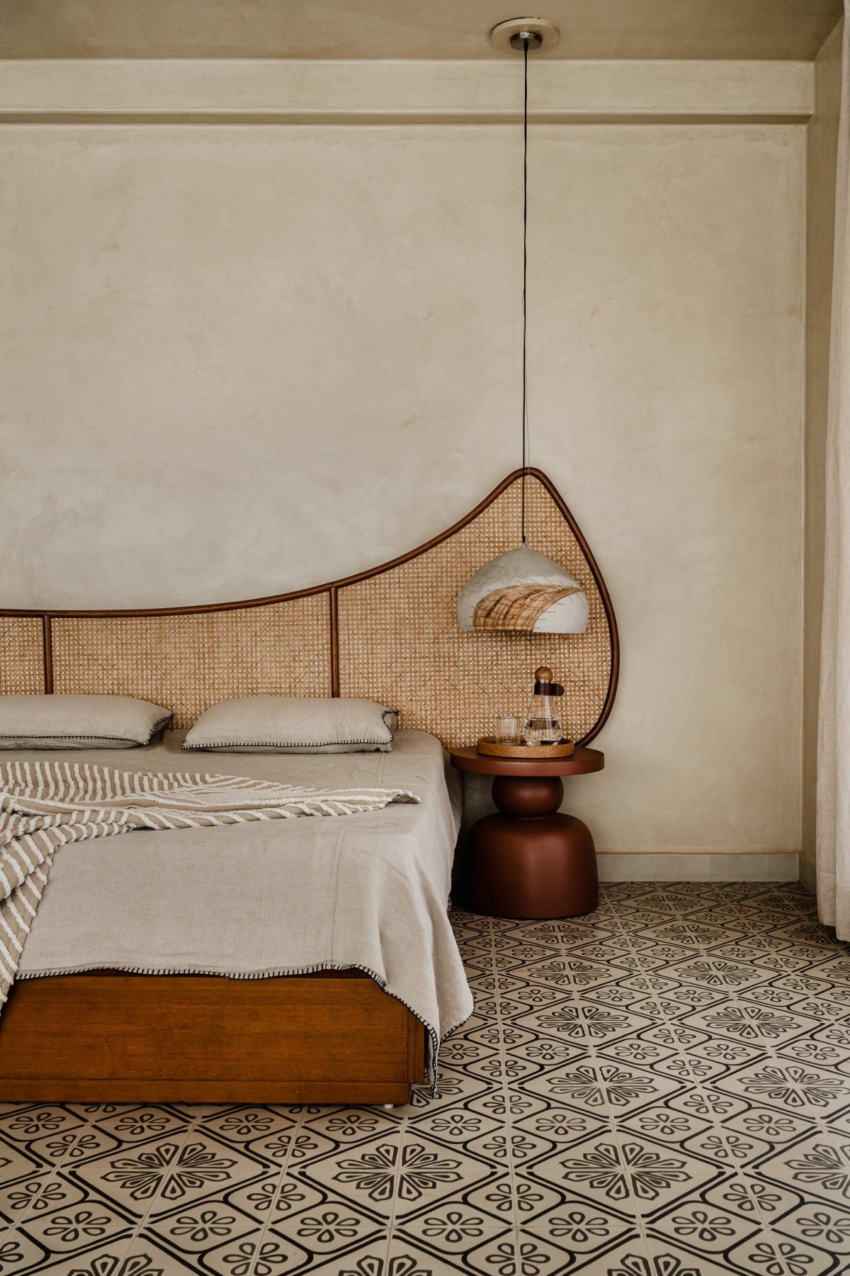 The neutral palette continues in the master bedroom, where an organically shaped bed in wood and cane sits atop a black and beige patterned concrete floor. Terracotta-coloured side tables flank the bed, with a concrete pendant lamp hanging over one side. The room extends into a lounge space, designed with a restored TV unit and a re-upholstered L-shaped sofa that maintains the overall vibe. Two custom artworks hang over the sofa, continuing the story of texture.