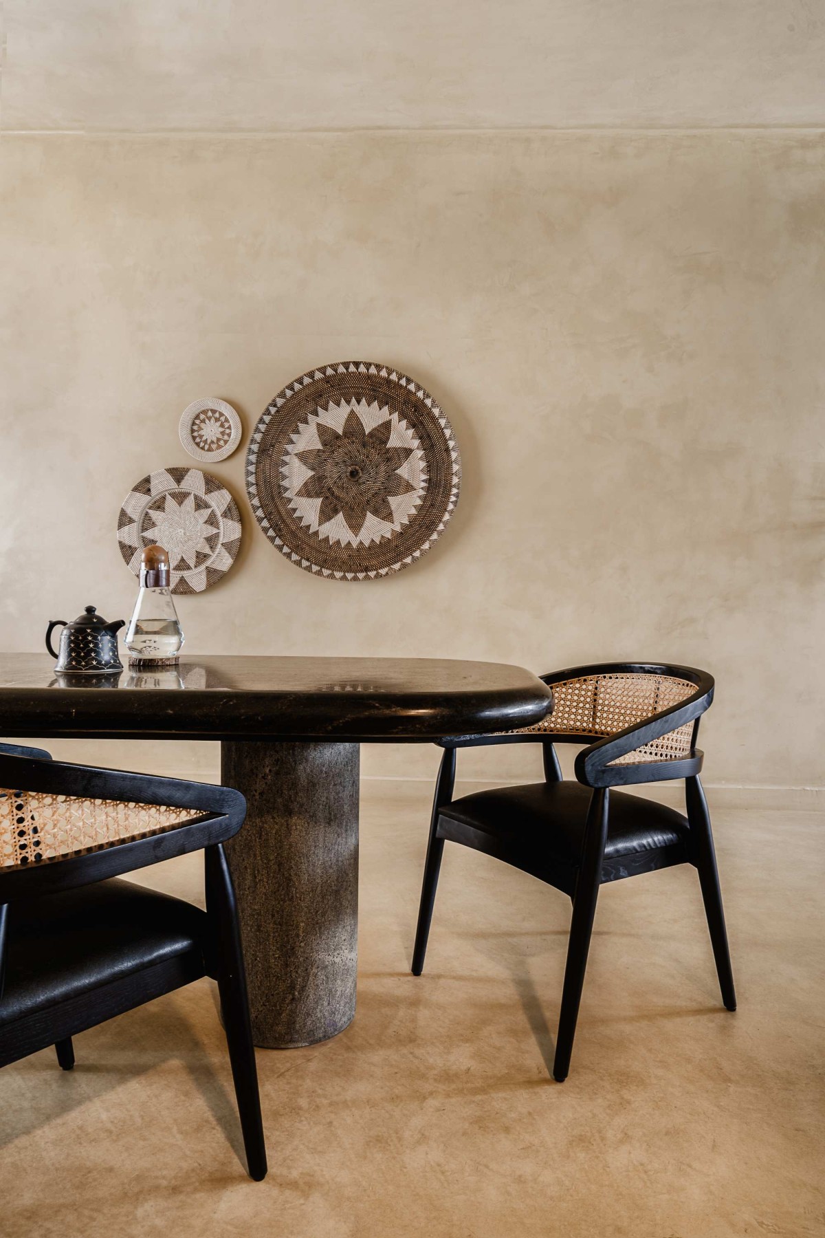 The project did not come without its challenges. The dining table, a highlight of the room, is a thick slab of granite weighing approximately 200 kgs, ordered from a local artisan in Mahabalipuram. Unfortunately, it split in half during transportation and had to be re-joined on-site, mimicking the Kintsugi technique.
