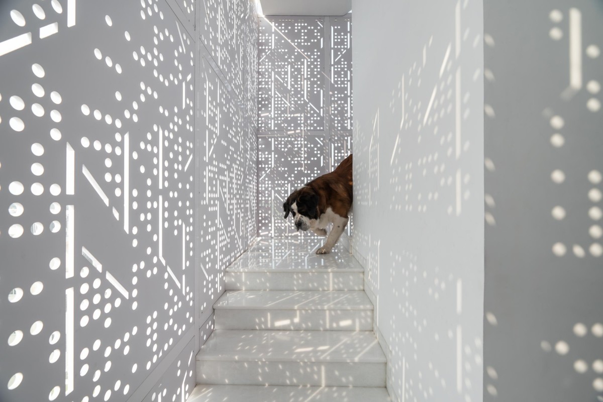 Double-height spaces were strategically incorporated to foster a sense of openness and connectivity complemented by skylights which were added to further enhance the natural illumination within the interior spaces, engender a cohesive sectional dialogue throughout the dwelling creating a dynamic interplay of light and shadow as well. On the western facade, a delicate screen was introduced to filter sunlight into the interior, reminiscent of the dappled illumination found beneath a canopy. This feature not only added a touch of natural beauty but also helped regulate the amount of sunlight entering the house, ensuring optimal comfort for its occupants.