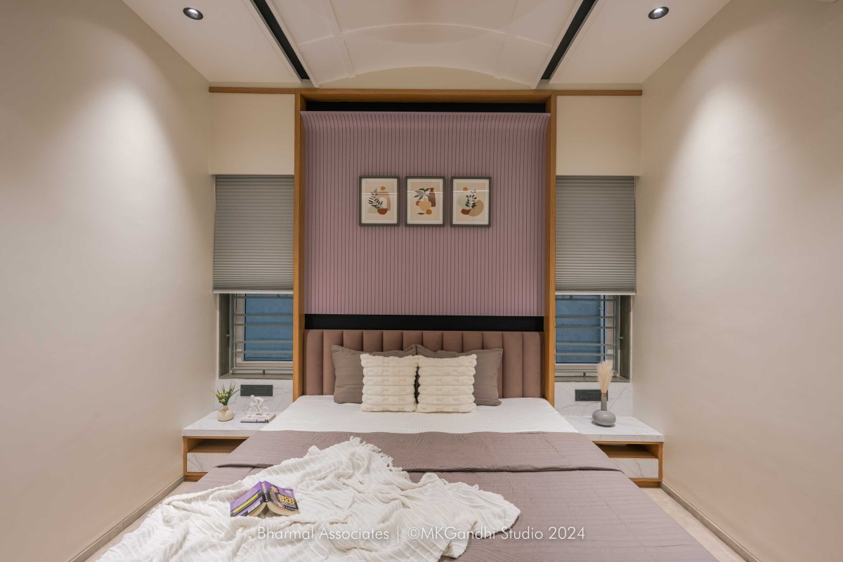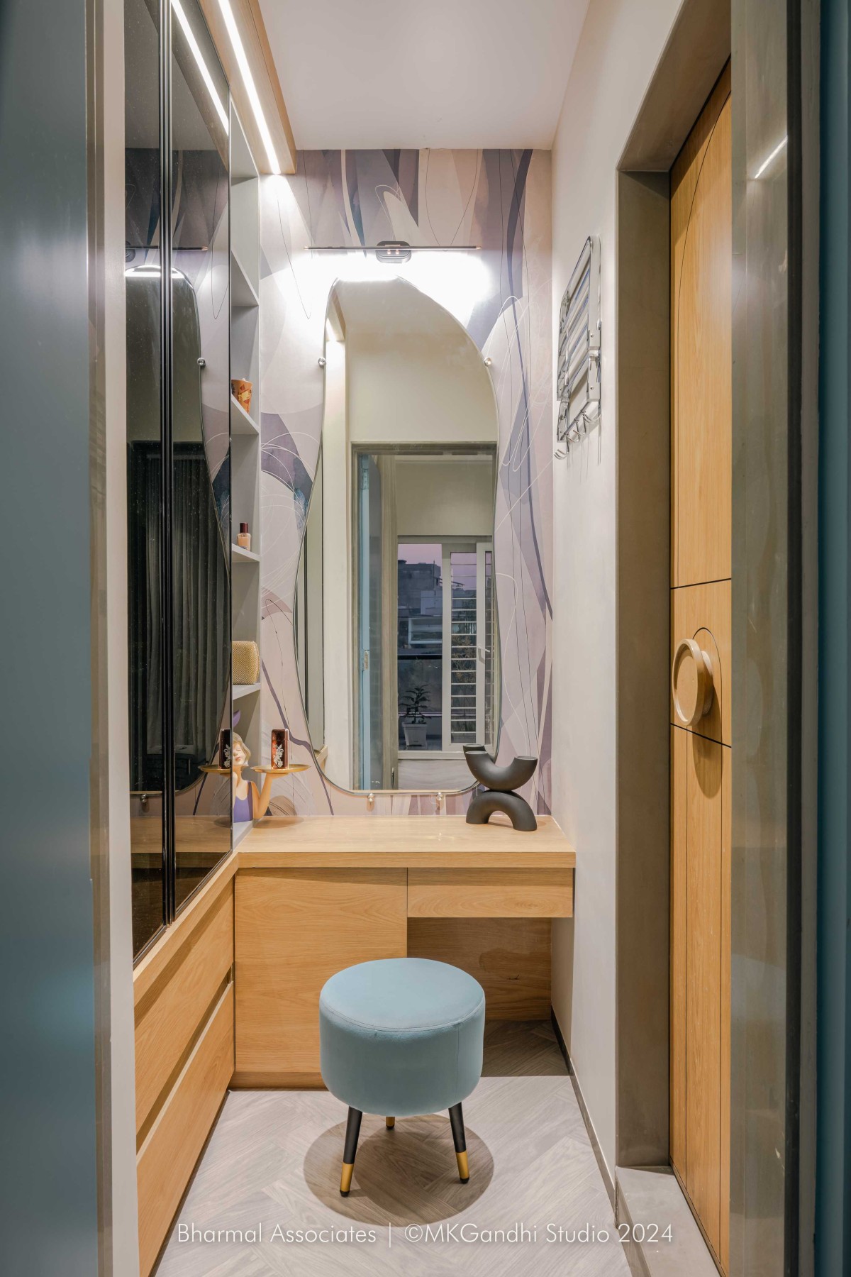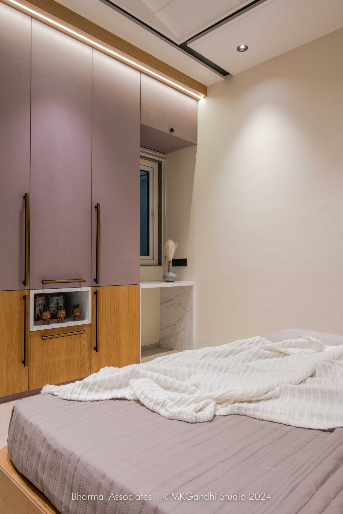 The most sacred space in this luxurious modern home is a shrine of relaxation and functionality. Thoughtfully designed to include ample closet space, rest and work areas, and a haven for unwinding, this room epitomizes luxury. The bed’s back wall paneling, crafted in a unique curved pattern, creates a flawless. The curved ceiling gives a minimalistic yet luxurious feel. The lavender and fluted wooden sheet in the wardrobe is a crucial design element in this space.