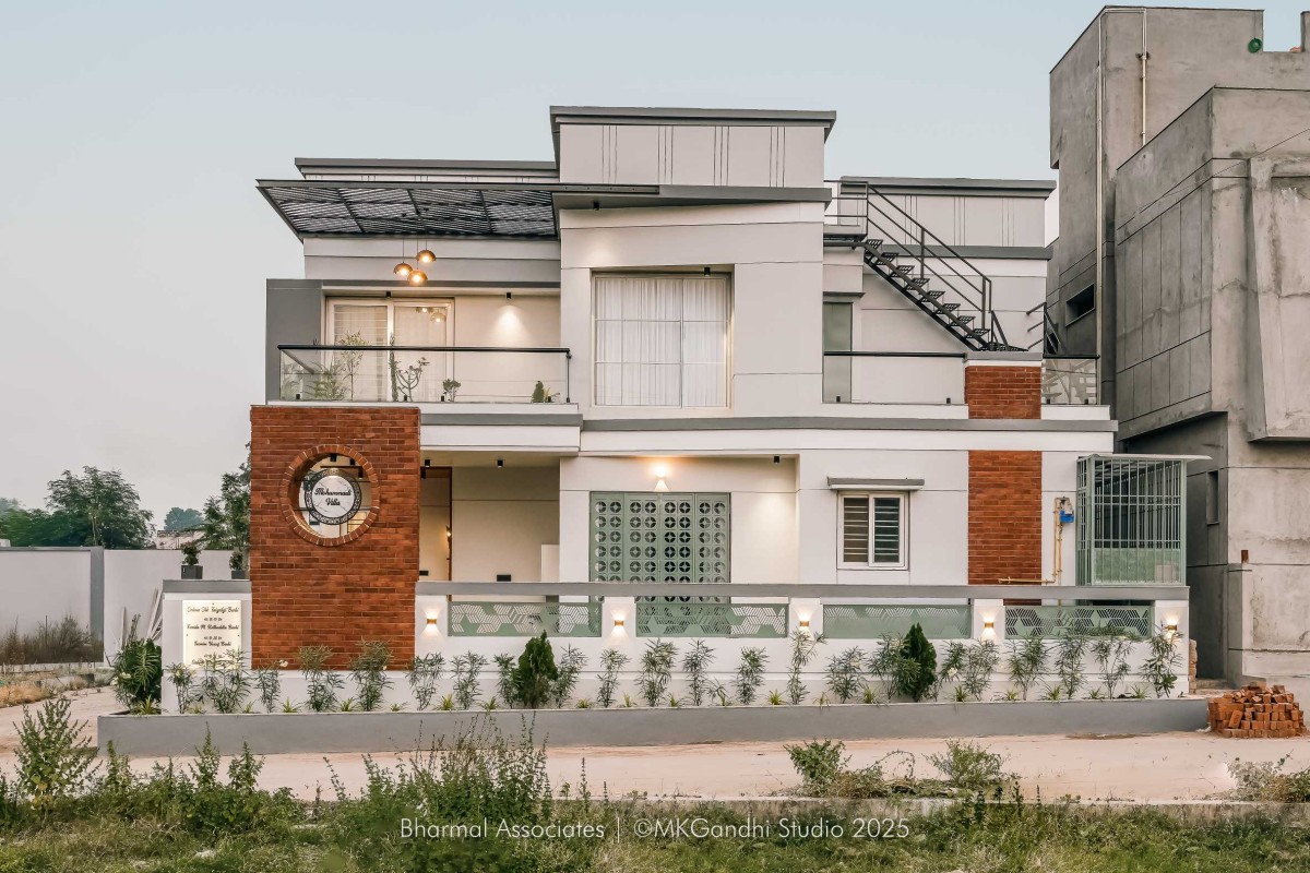 Dusk light exterior view of House B-23 by Bharmal Associates