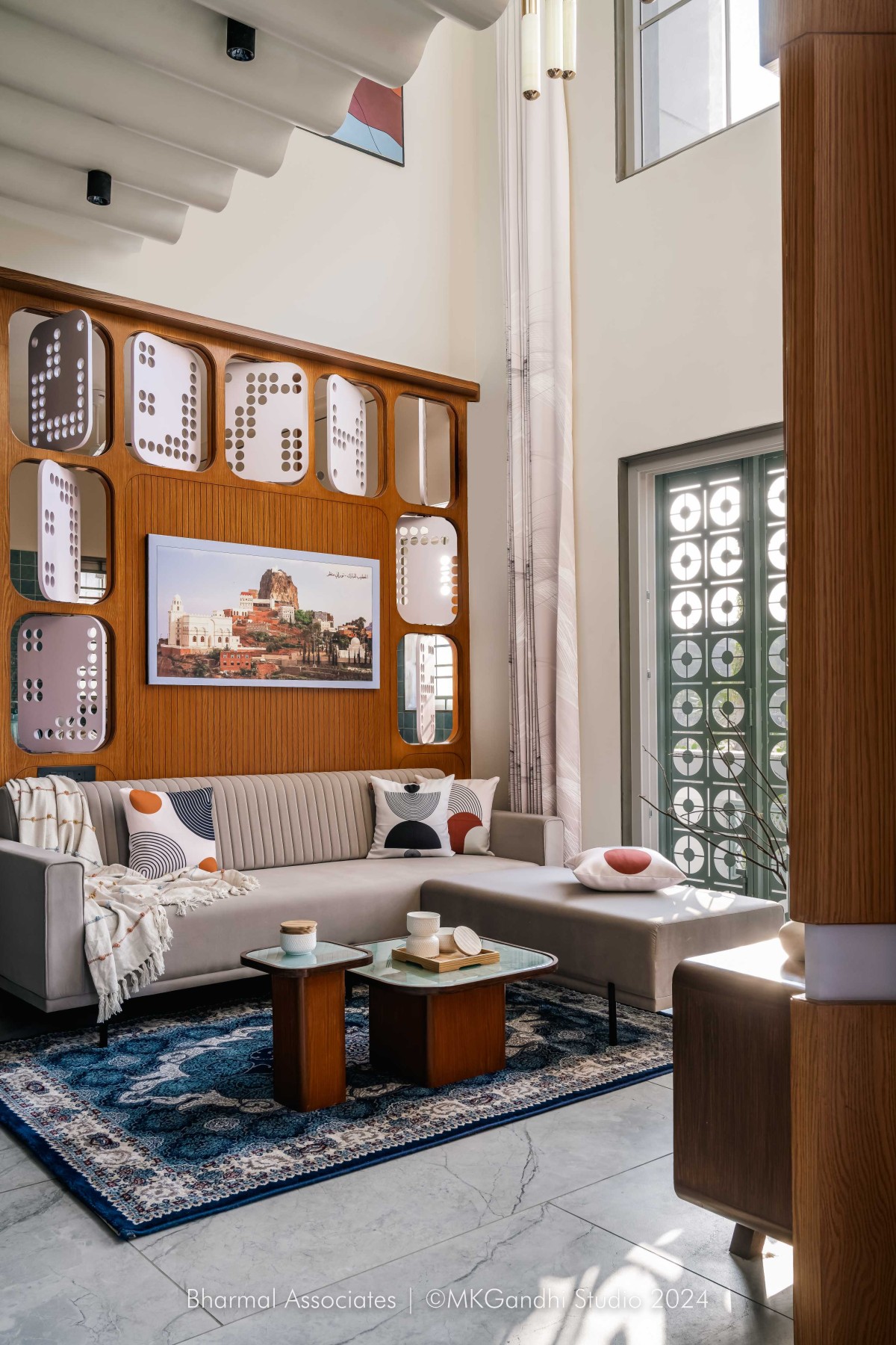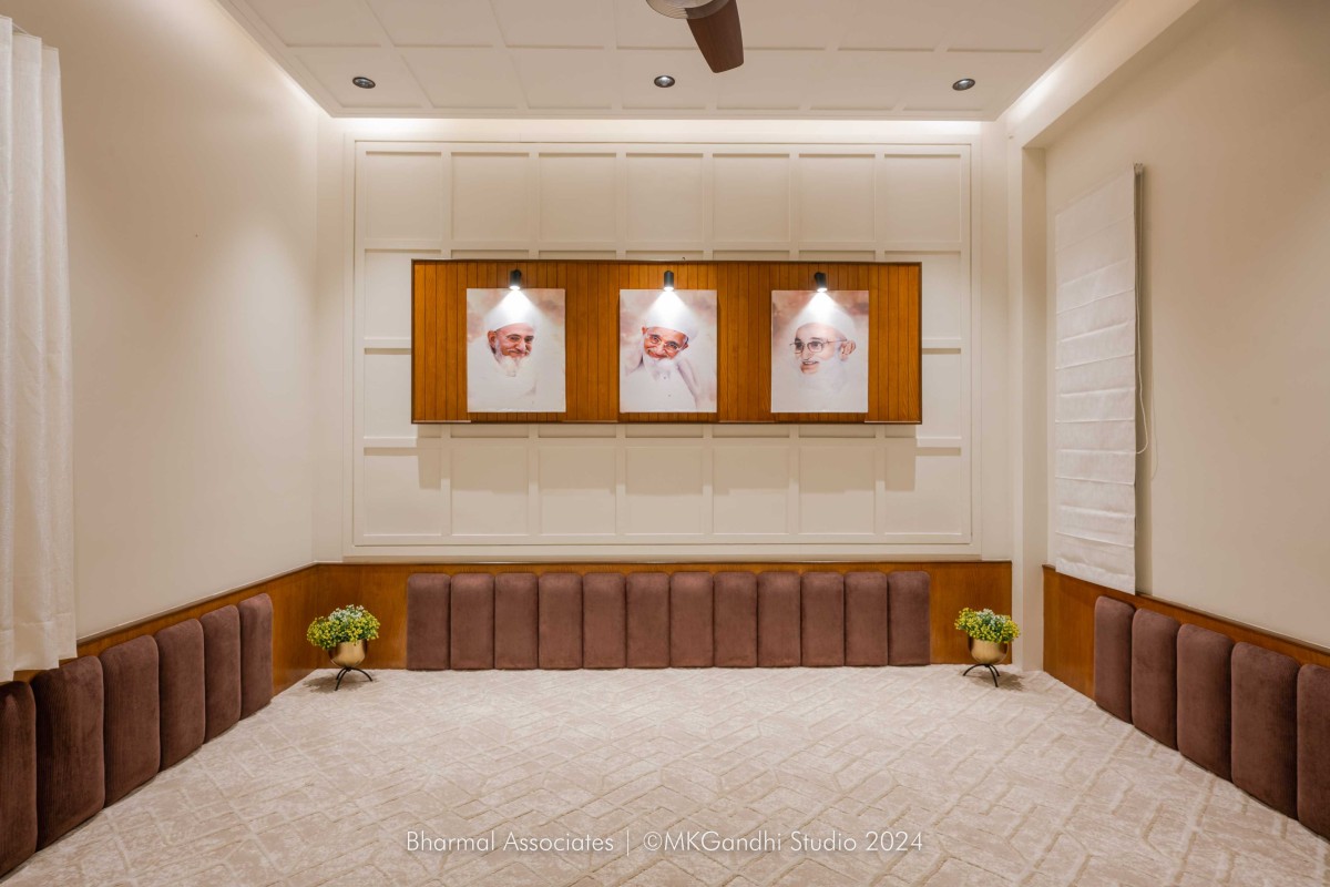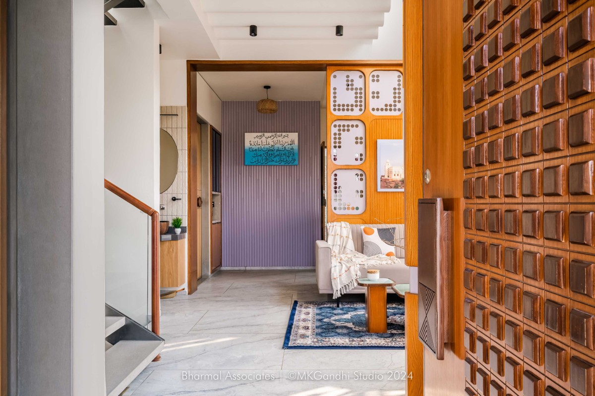 A traditional Baithak room, characteristic of the Dawoodi Bohra community, serves as a special gathering space for family events. A similar pop and wall paneling emerges with vibrant betak teka, inviting warmth and comfort into the space.