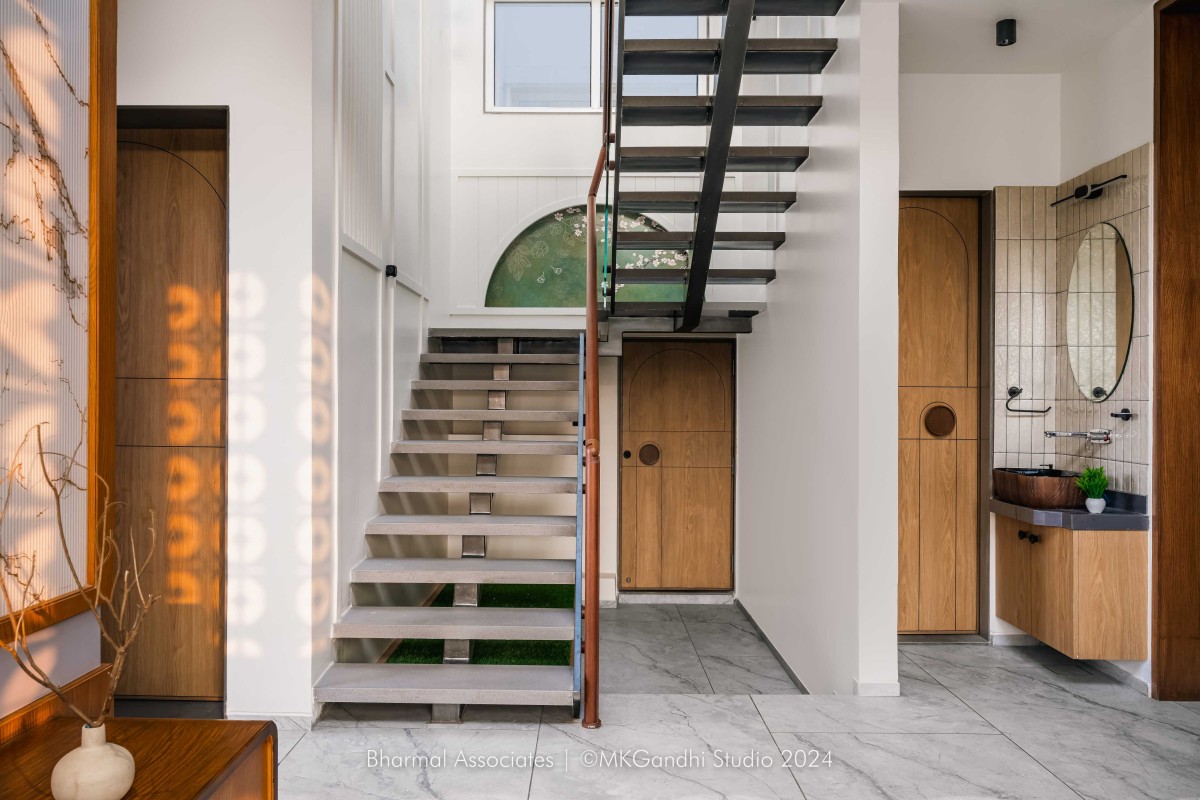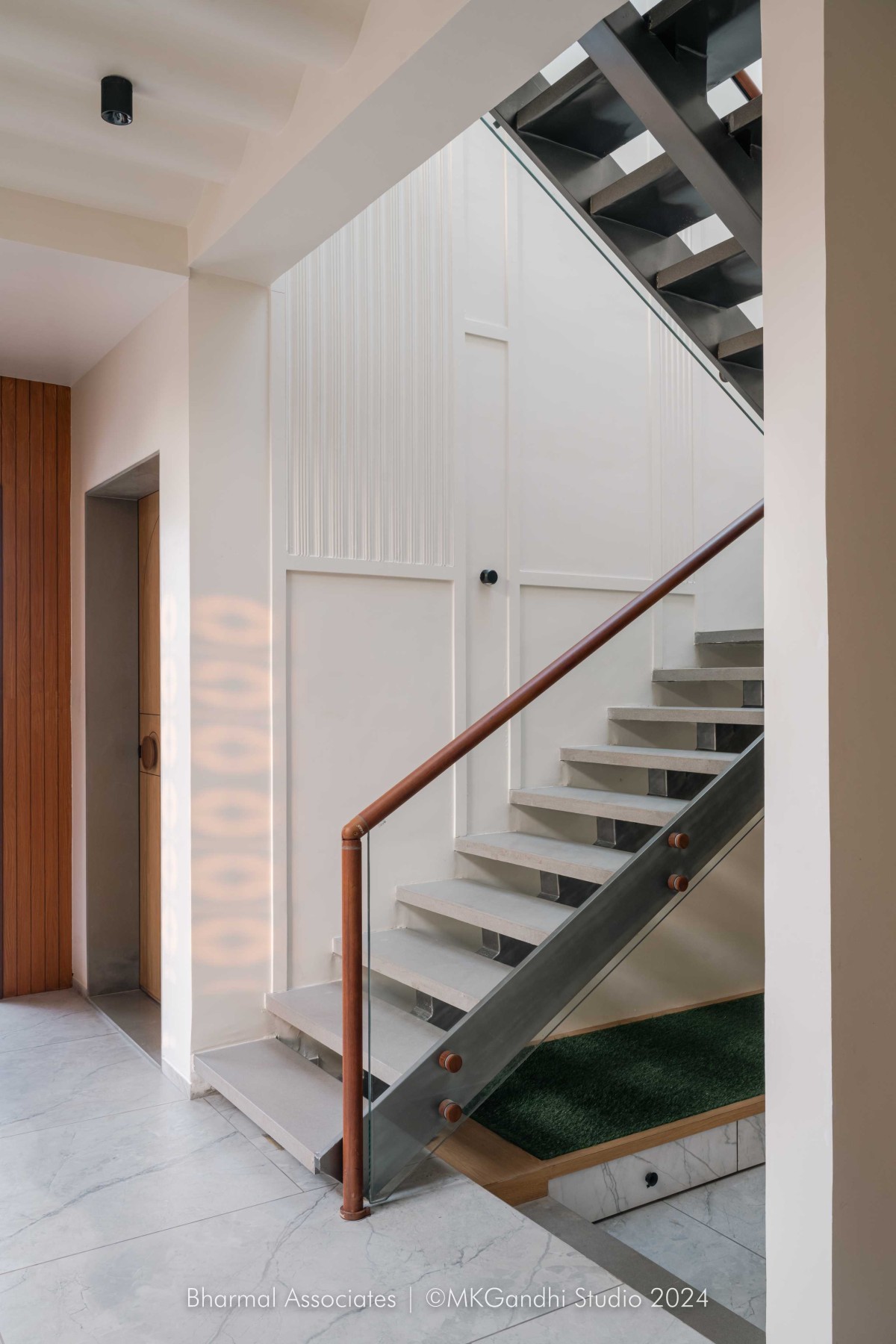Connecting with two brothers' houses, “HOUSE B-23” is a residential project with a built-up area of 2500 sq. Ft on a 1470 sq. Ft plot in Dahod, Gujarat. This 3-BHK is modern and simplistic and designed to fuse simplicity and elegance.