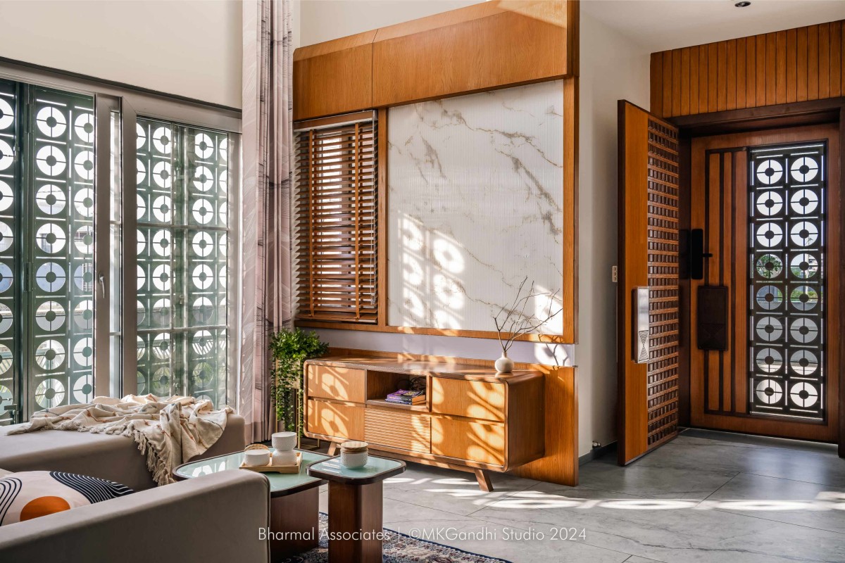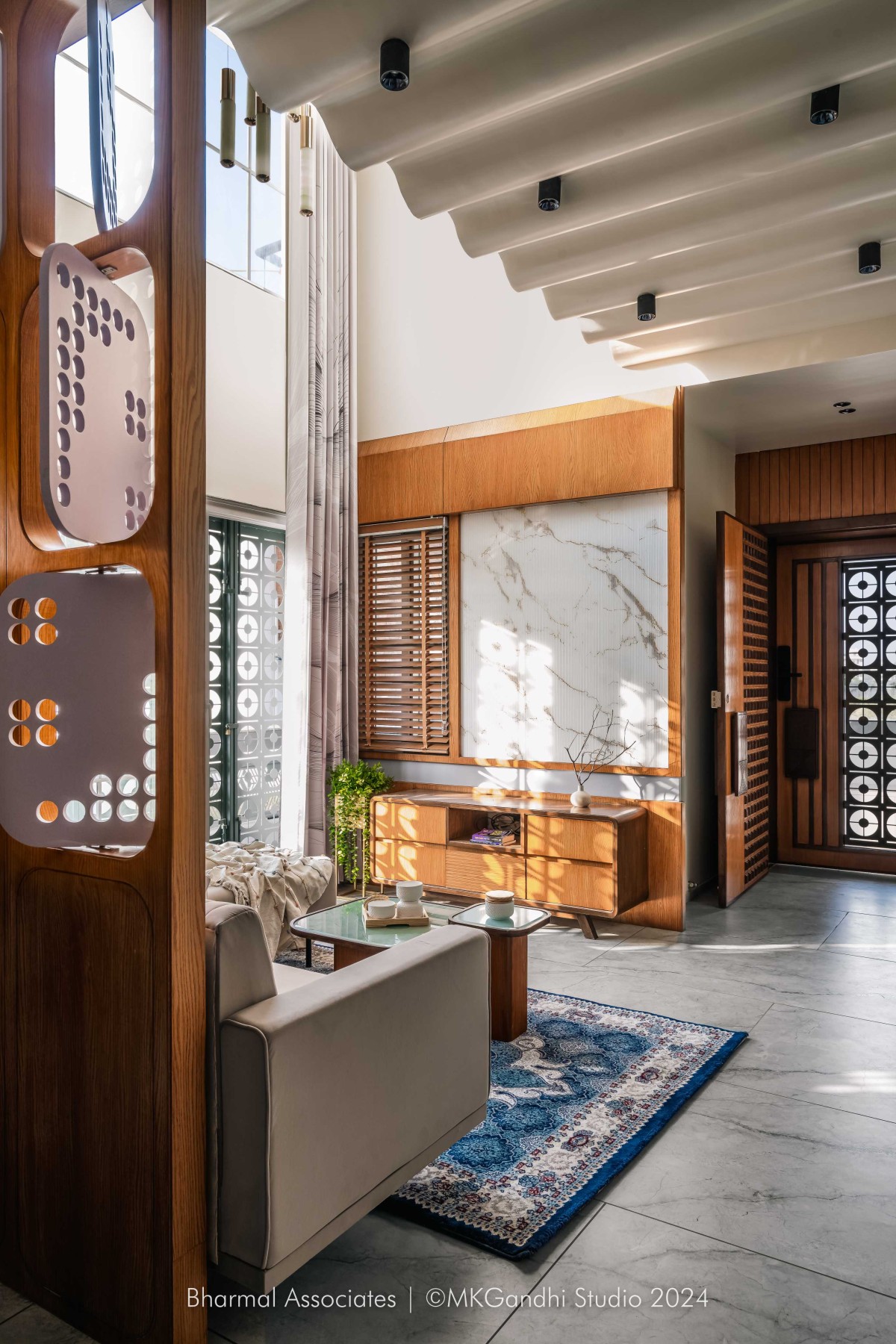 The house opens into the foyer that leads to the drawing room, where we come across a grey sofa and an astounding wooden open partition and PU finished fluted wall paneling.