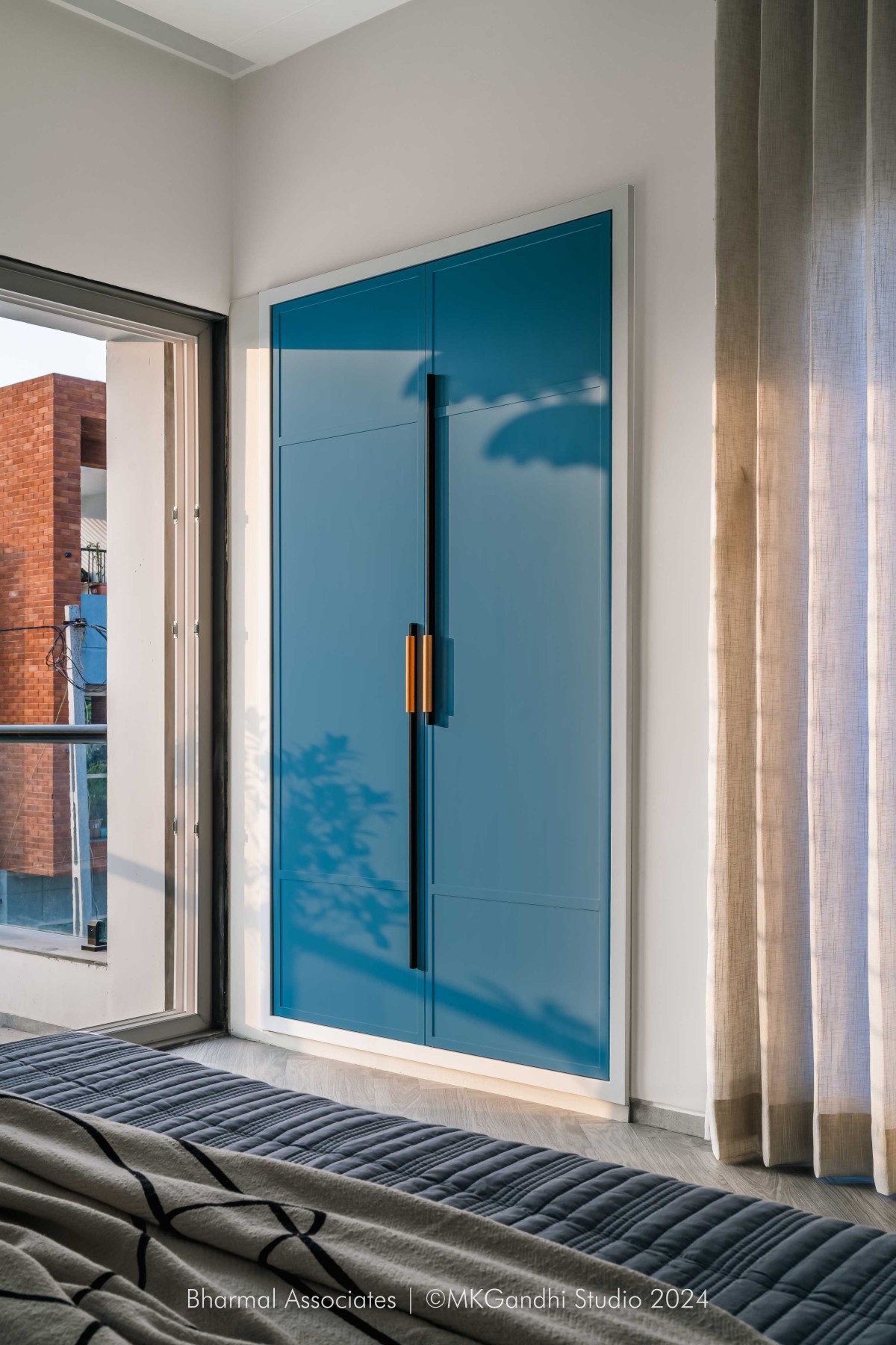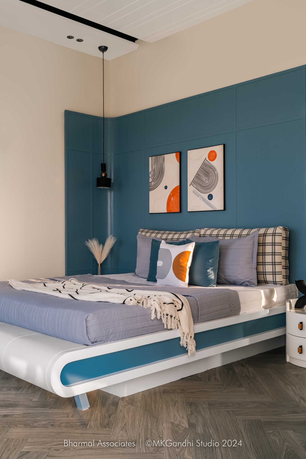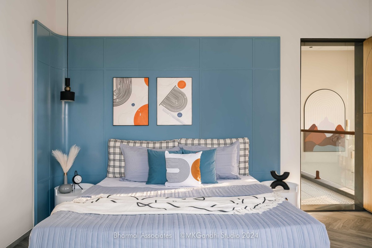 This lavish master’s bedroom combines modern luxury with natural elements to create a calm and sophisticated space. The royal blue backdrop with photo frame adds a touch of refined elegance, perfectly balanced by a soft cushion. A round bed gives a soft and cozy feel in the space. A full round PU finished site table is a key element in the room. Glass sliding doors ensure plenty of natural light and ventilation, connecting the room seamlessly to a private balcony.