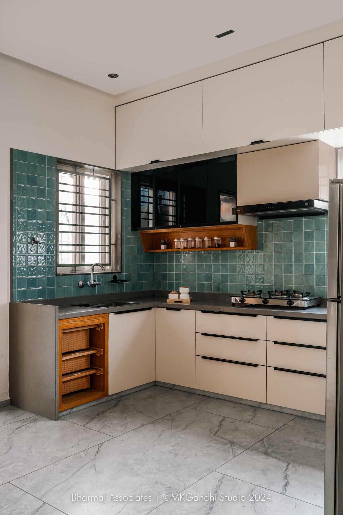 The L-shaped kitchen with high-spec modern technologies and an artificial stone countertop with fresh furniture in beige and blue tiles on the wall.