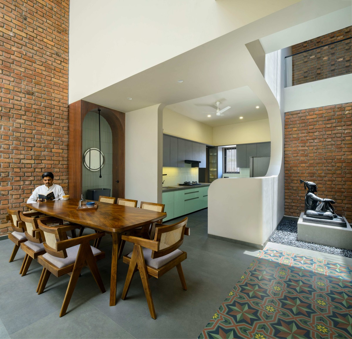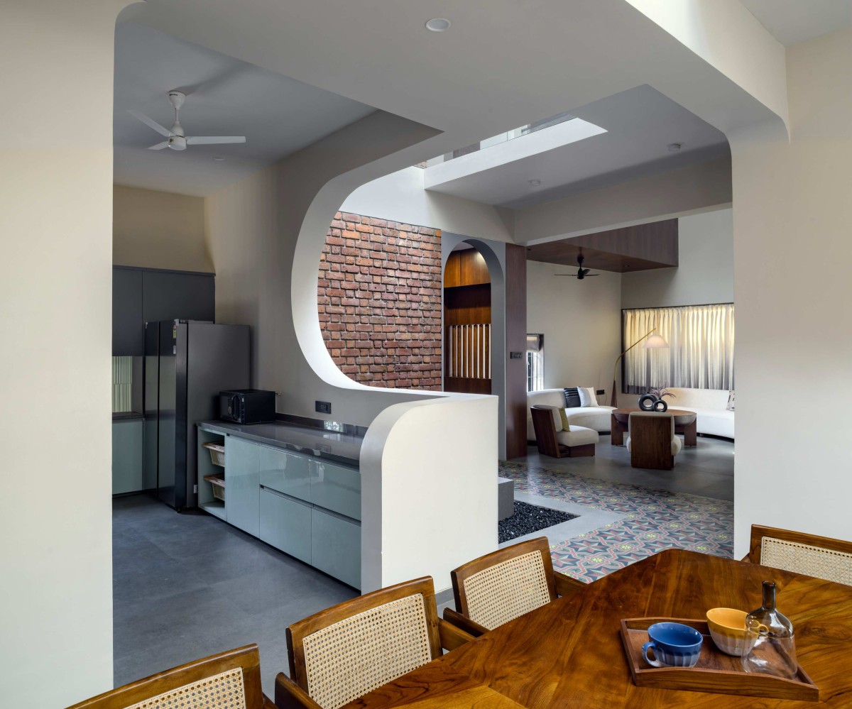 Dining, Kitchen & Entry Court of House of Contrast by Alok Kothari Architects