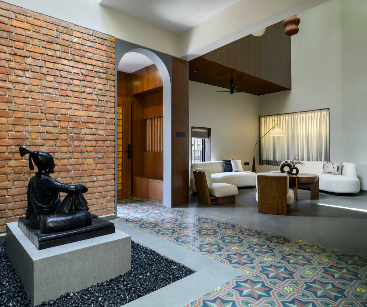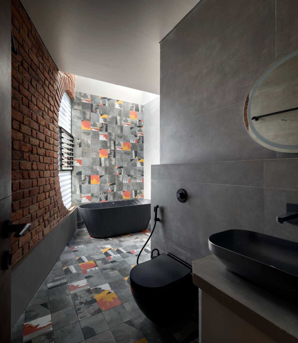 Just like the exteriors, interiors of the house also take this 'journey of contrast' further, but in a subtle way. The grey flooring of the common areas has been contrasted with colourful, geometric tiles so as to highlight its importance as a movement line or passage.