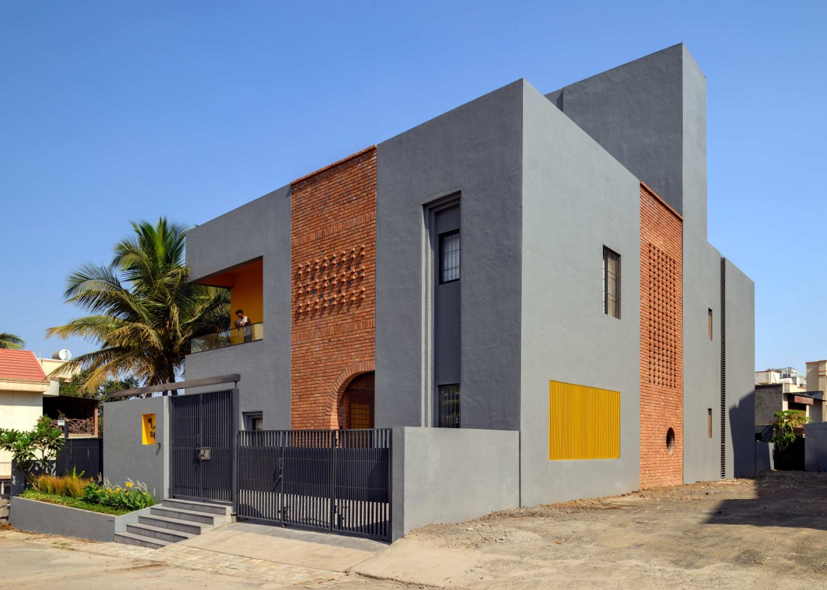Earthy tone of the brick walls stand in stark contrast with the subdued grey of the external facade. This contrast is further accentuated by adding a curved profile to all the openings on the exposed brick walls against the straight & sharp lines of the rest of the house. The bright, mustard coloured elements on the external facade are not just in continuation with the idea of having contrasting features but also add vibrancy to the mundane grey facade.