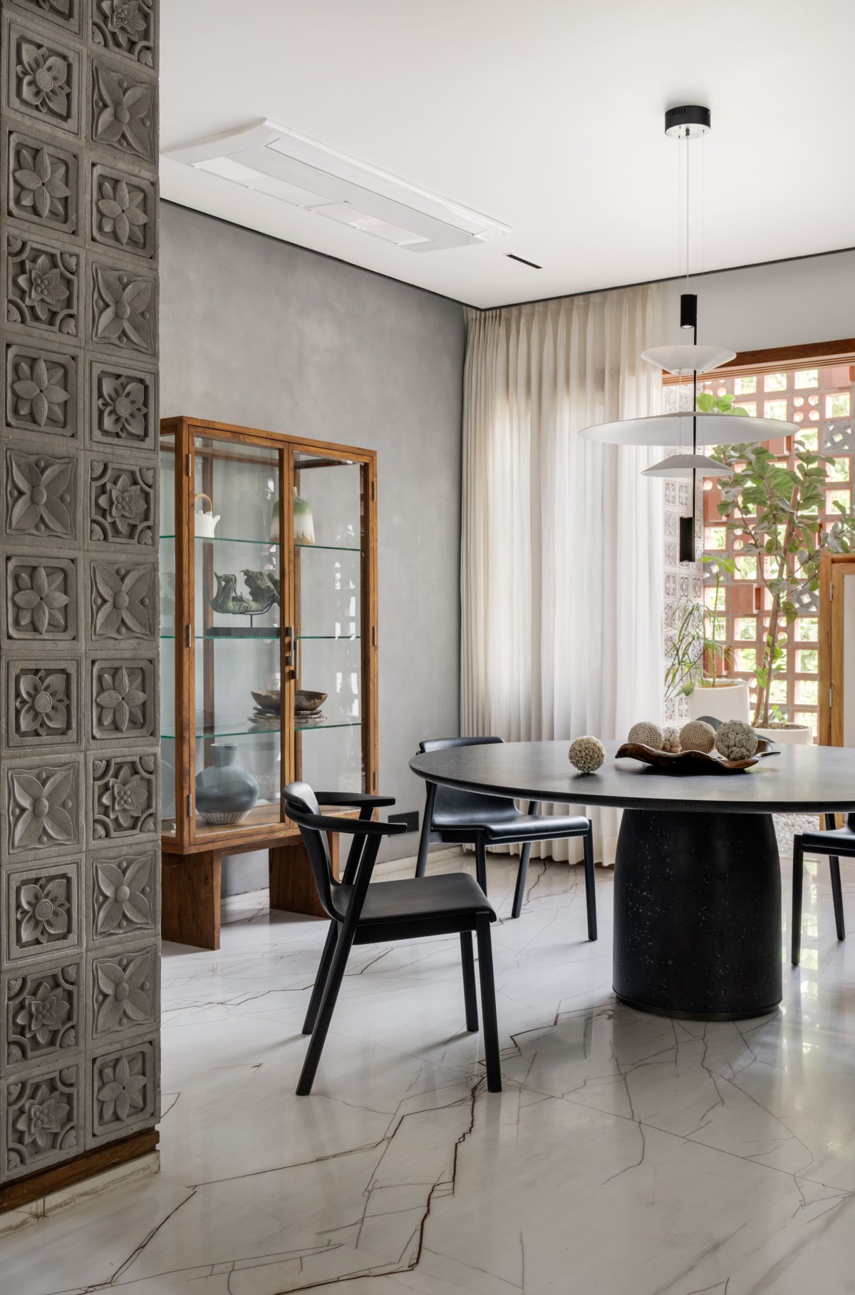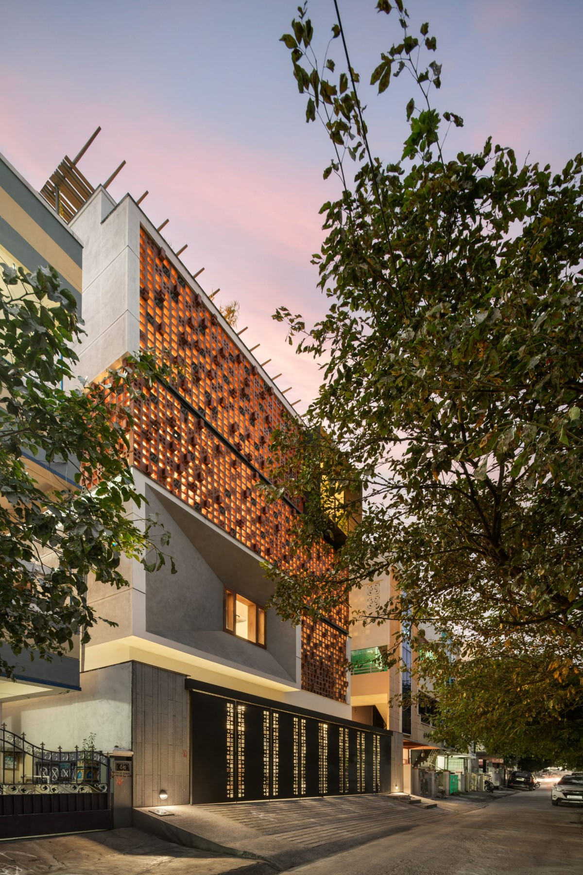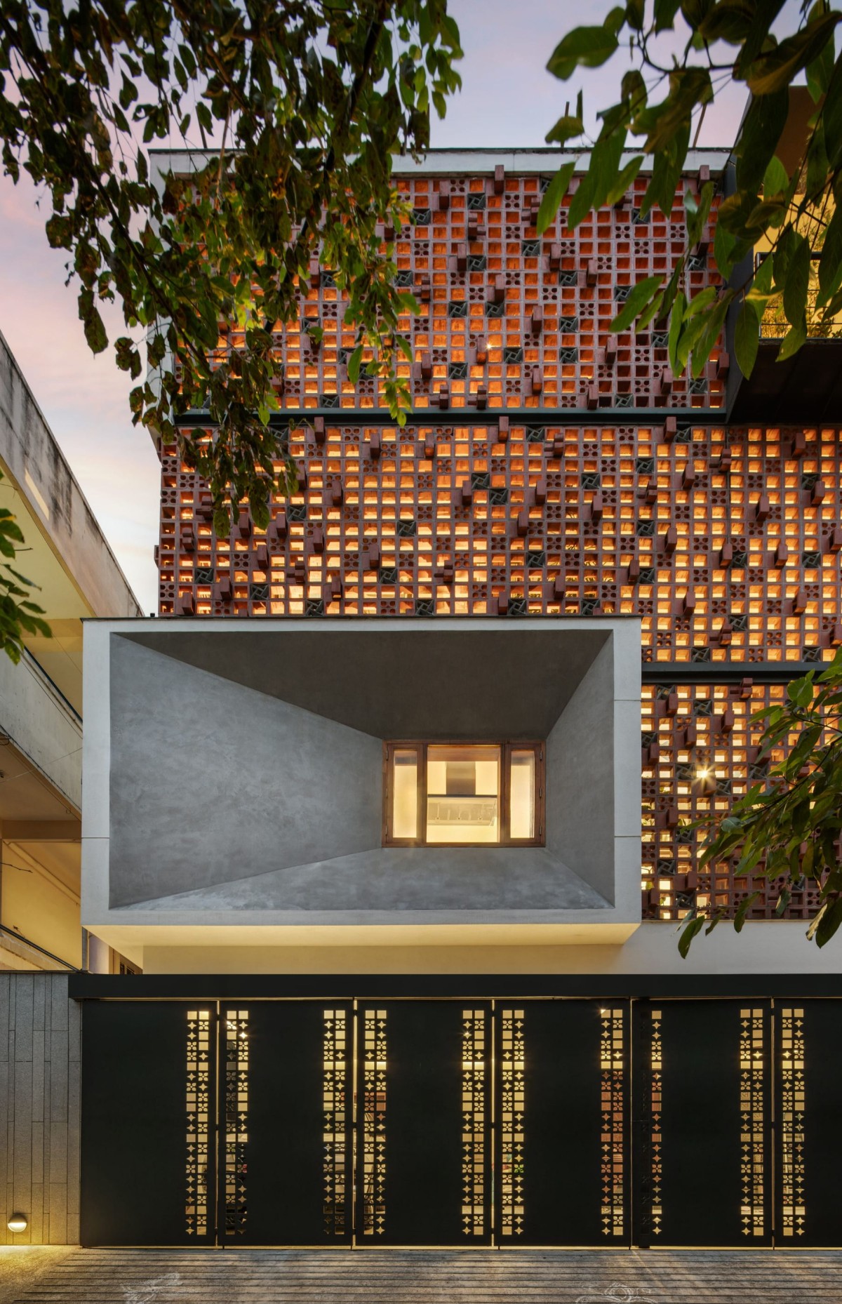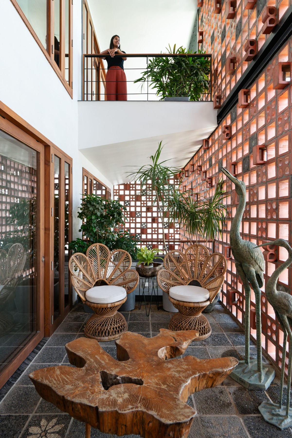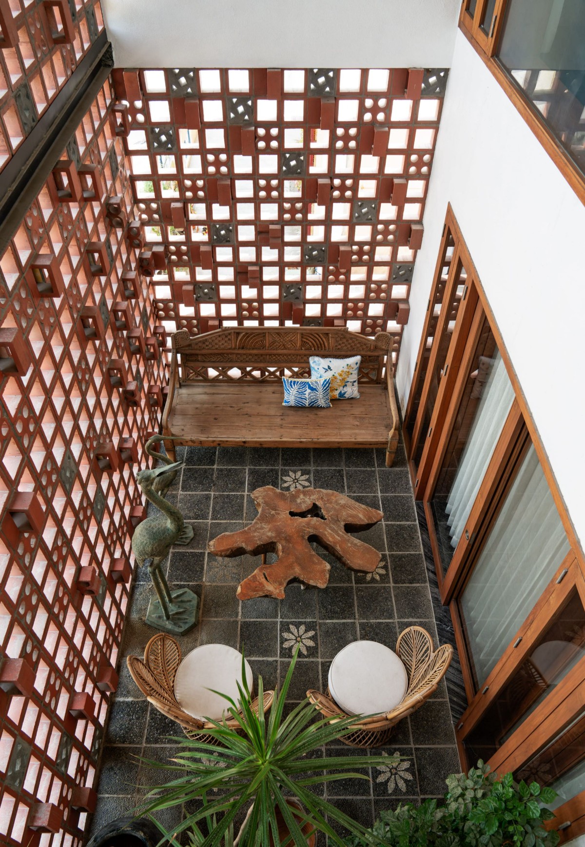 A standout feature in the house is the external façade, designed to evoke a sense of sanctuary amidst urban hustle. Inspired by the need of protection from various factors such as extreme heat, close proximity to the roads and neighbouring homes the façade incorporates a curtain of terracotta breeze blocks. The expression of the façade was to enhance a weathered object within the landscape.  It spans three floors, offering privacy and protection from the extreme weather.  It houses alternating balconies within, which offer interesting visual connections for the inhabitants. And these pockets are used for the incorporation of the landscape for their home. This also allows for all spaces to be near the garden and to be able to see light change through the seasons and hours of the day. There are different ways to experience the home based on where you are vertically.