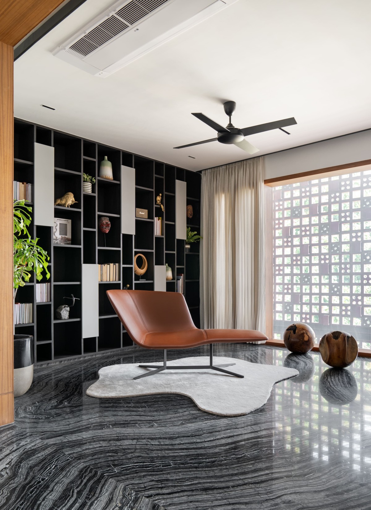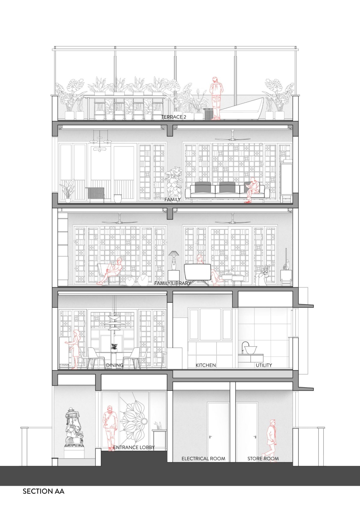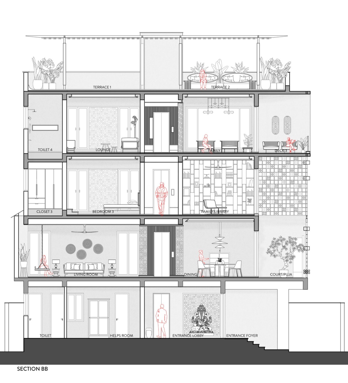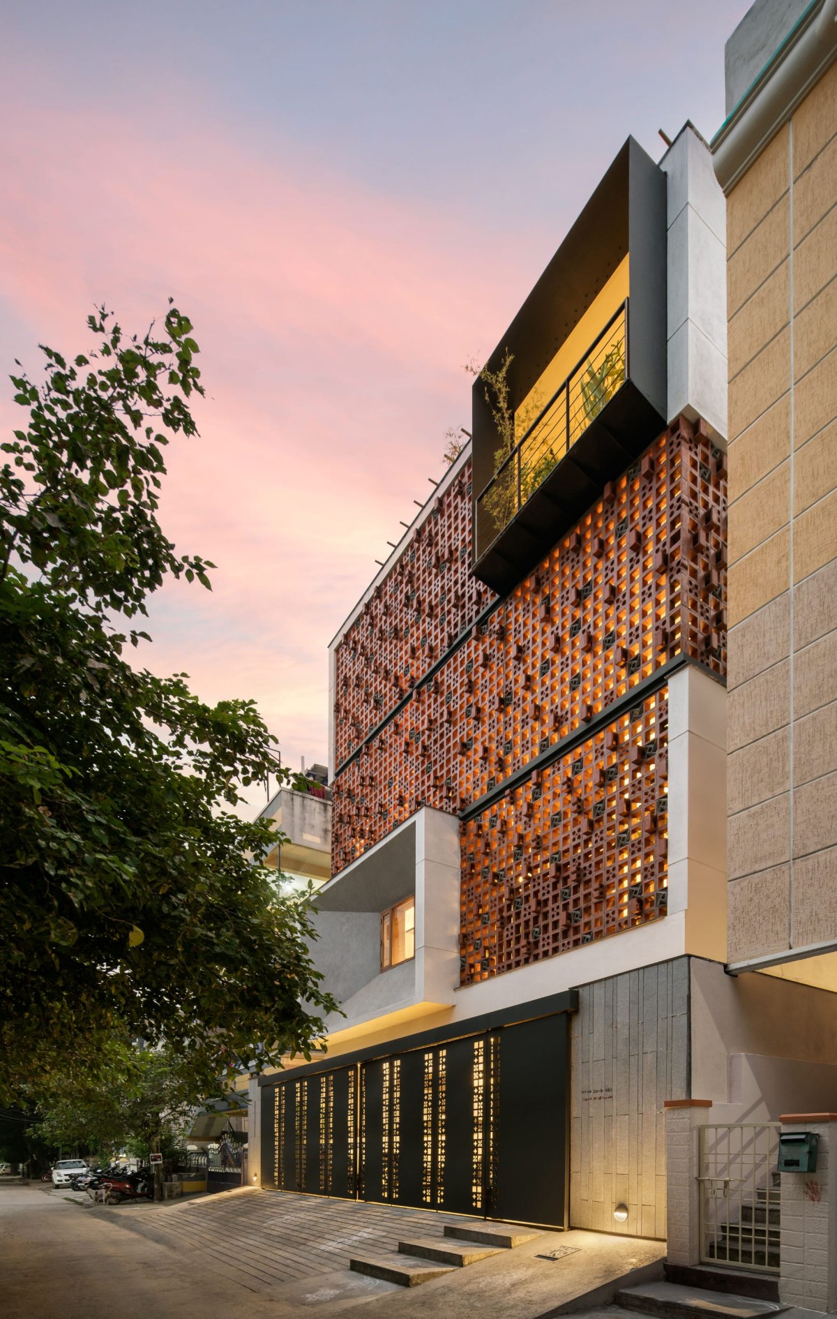 A standout feature in the house is the external façade, designed to evoke a sense of sanctuary amidst urban hustle. Inspired by the need of protection from various factors such as extreme heat, close proximity to the roads and neighbouring homes the façade incorporates a curtain of terracotta breeze blocks. The expression of the façade was to enhance a weathered object within the landscape.  It spans three floors, offering privacy and protection from the extreme weather.  It houses alternating balconies within, which offer interesting visual connections for the inhabitants. And these pockets are used for the incorporation of the landscape for their home. This also allows for all spaces to be near the garden and to be able to see light change through the seasons and hours of the day. There are different ways to experience the home based on where you are vertically.
