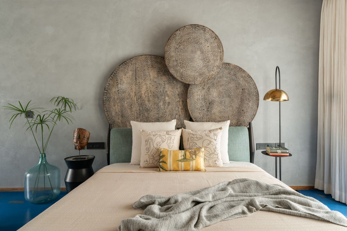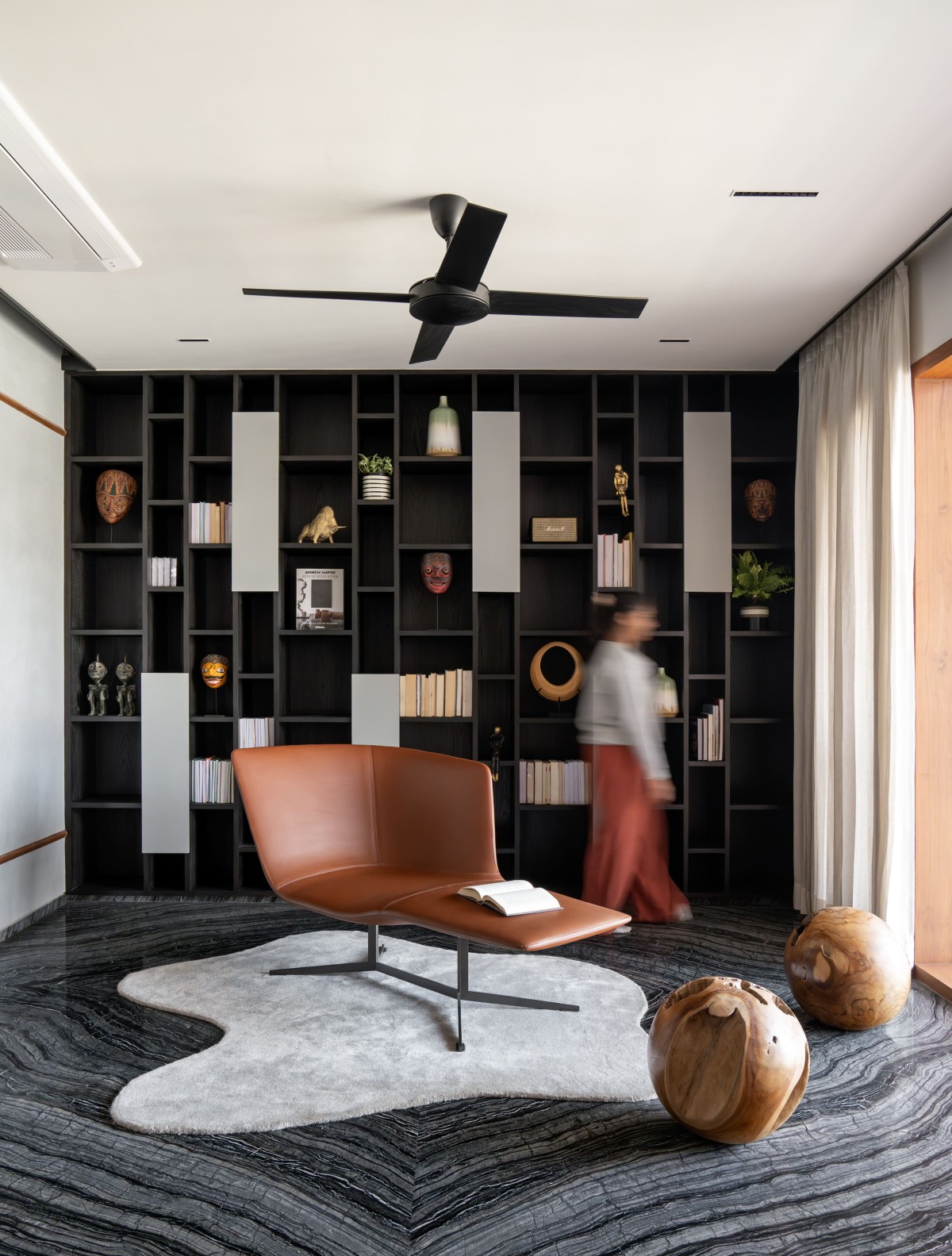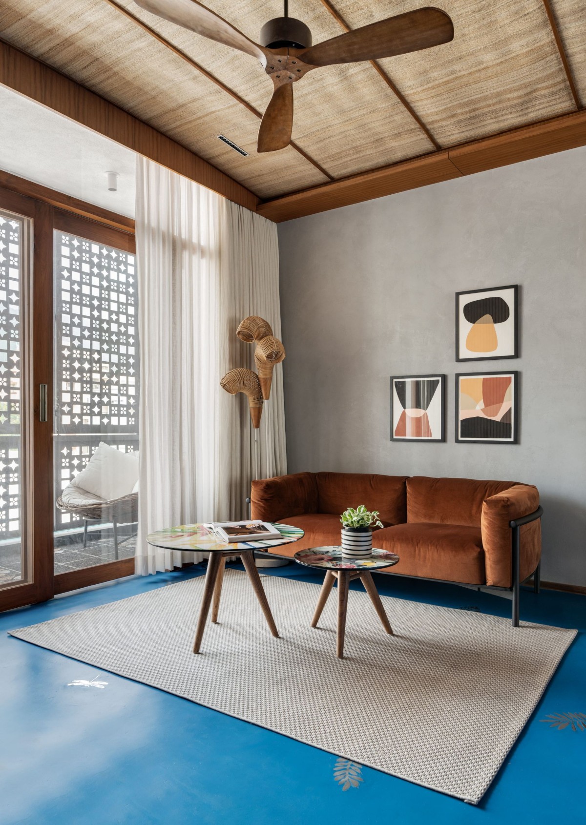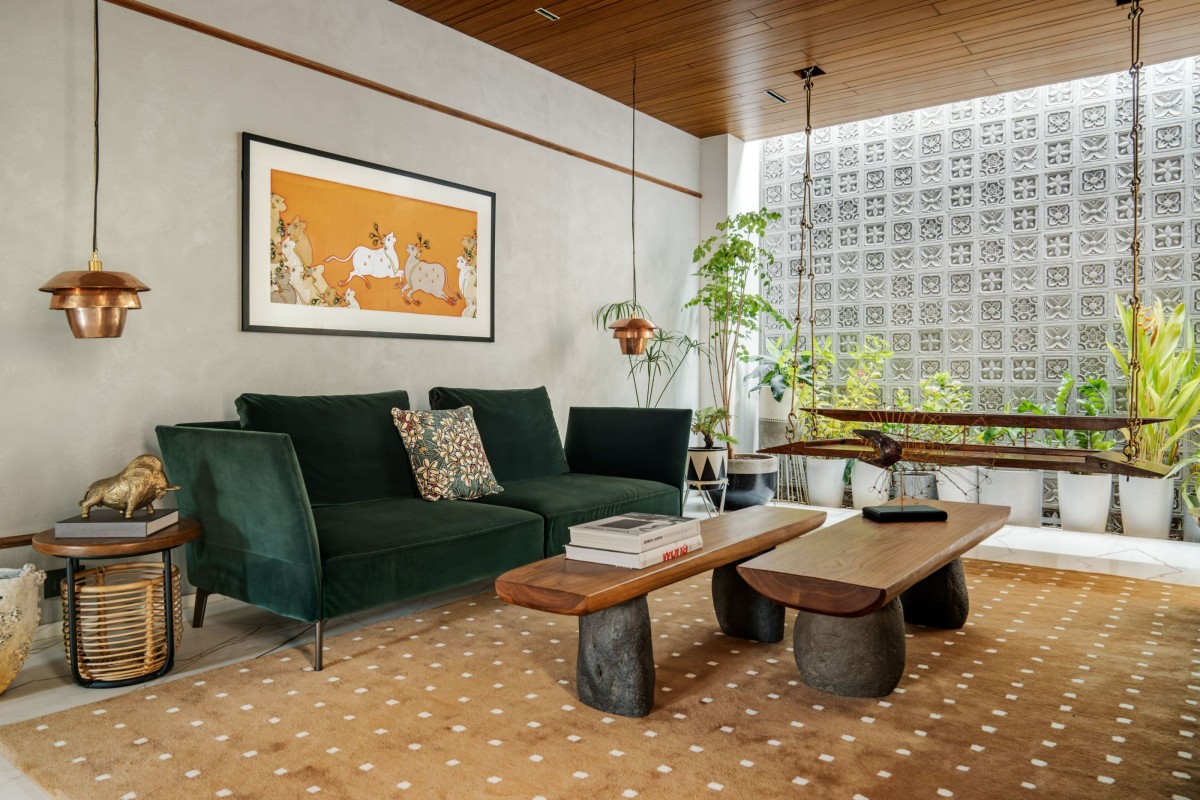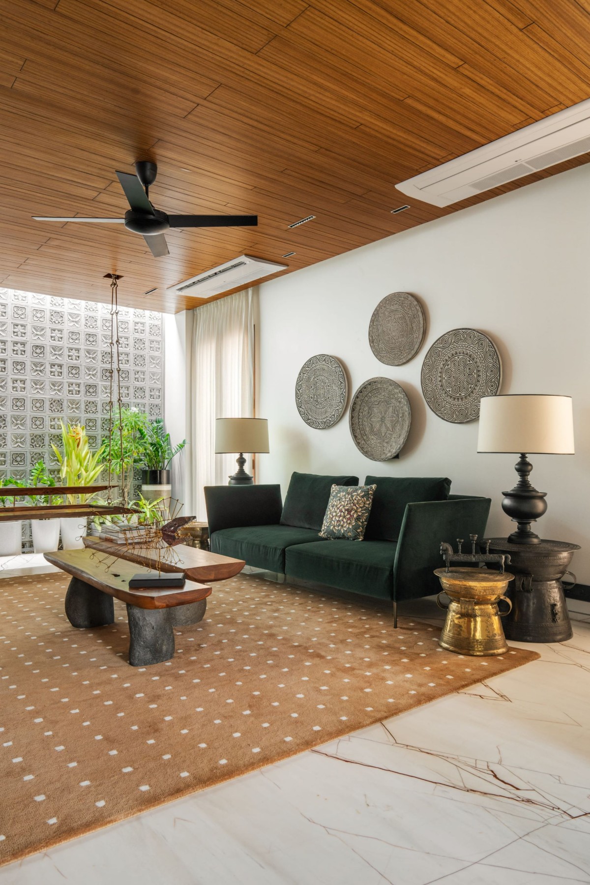 A standout feature in the house is the external façade, designed to evoke a sense of sanctuary amidst urban hustle. Inspired by the need of protection from various factors such as extreme heat, close proximity to the roads and neighbouring homes the façade incorporates a curtain of terracotta breeze blocks. The expression of the façade was to enhance a weathered object within the landscape.  It spans three floors, offering privacy and protection from the extreme weather.  It houses alternating balconies within, which offer interesting visual connections for the inhabitants. And these pockets are used for the incorporation of the landscape for their home. This also allows for all spaces to be near the garden and to be able to see light change through the seasons and hours of the day. There are different ways to experience the home based on where you are vertically.