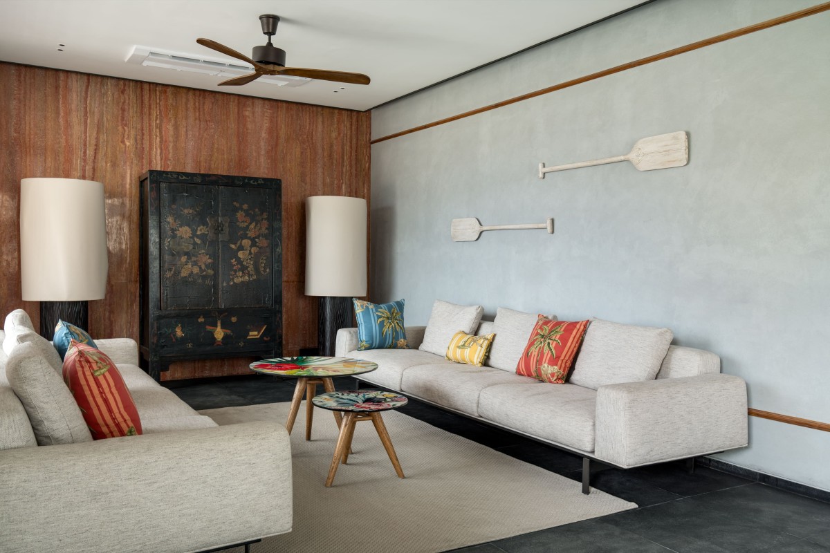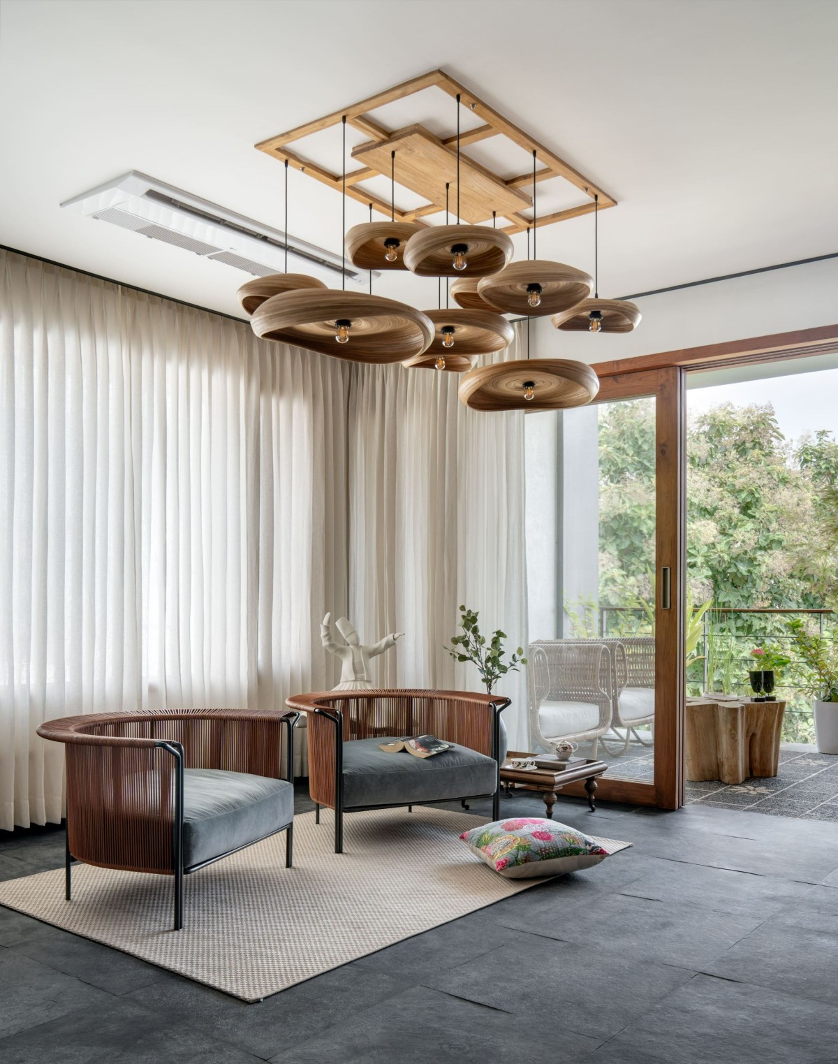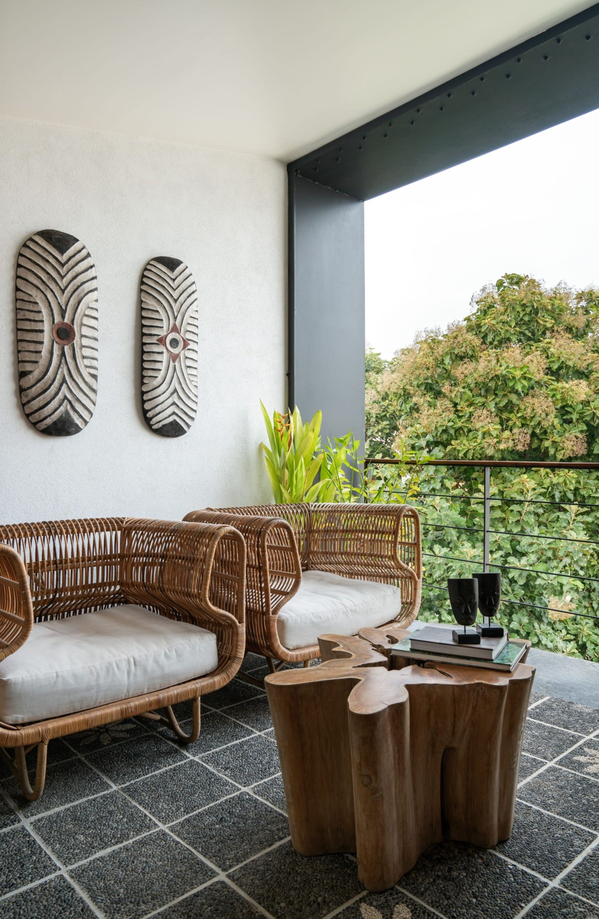 The simple building form is comfortable to inhabit, relaxed, and has an easy lifestyle feeling about it. The home is organized in three levels. The living spaces on all three floors are located towards the front side of the home, making the rear side more private and houses all the bedrooms and en suites. Internally we wanted to capture a spirit of a tropical haven. The use of simple cement finishes with teak wood accents, elegant white marble, and timber ceilings infuses the spaces with warmth and a relaxed ambiance. Carefully curated materials such as locally sourced stones, natural oxide floorings, banana fiber mats, and bamboo-crafted lighting elements contribute to the tropical mood, ensuring a harmonious blend of comfort and style.
