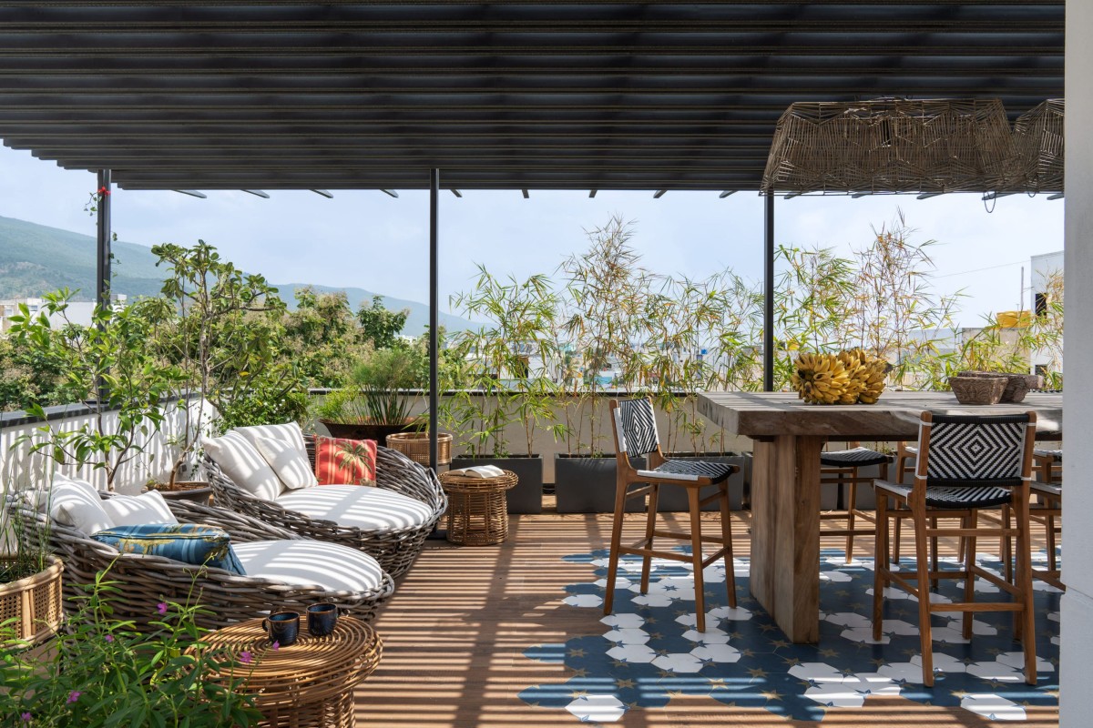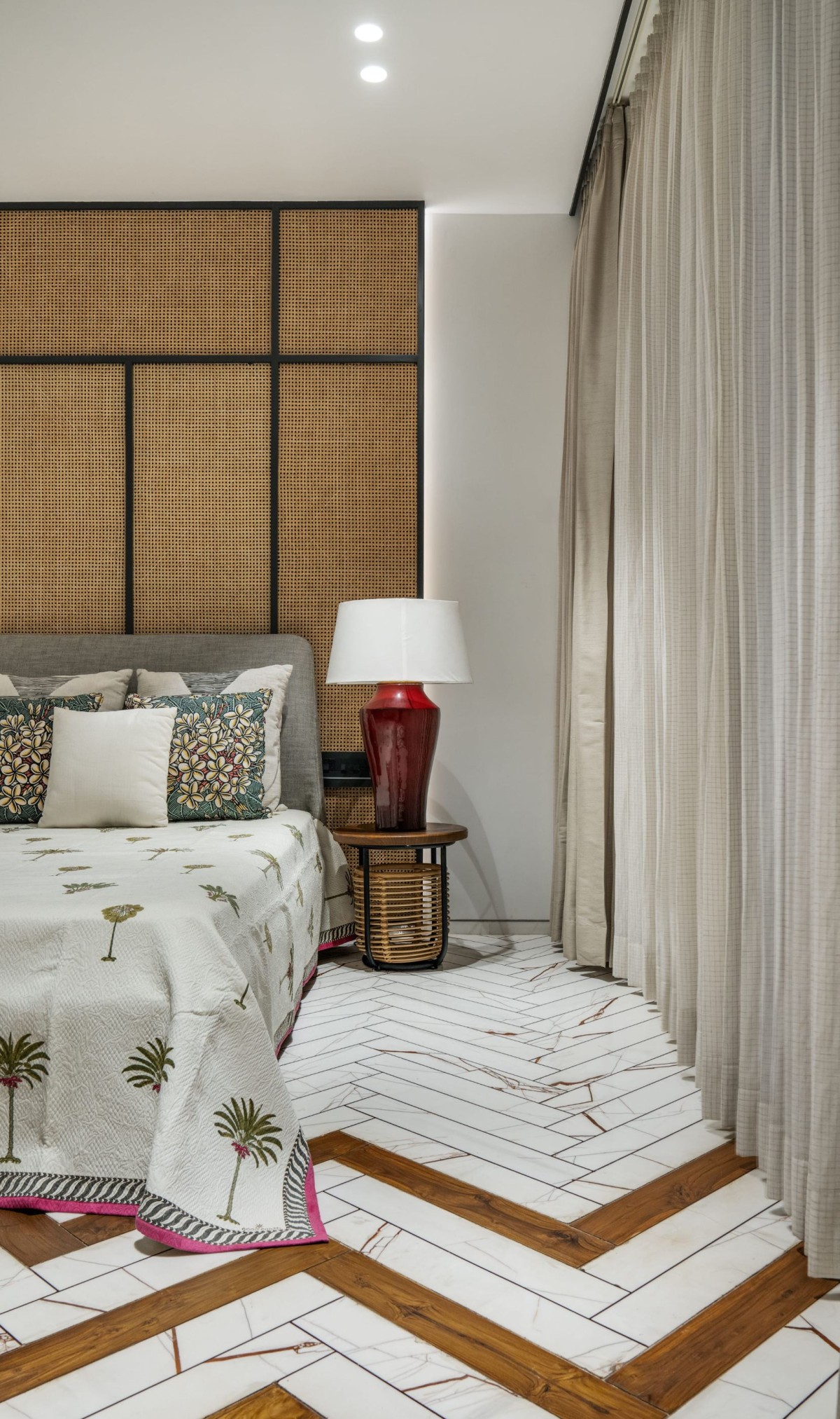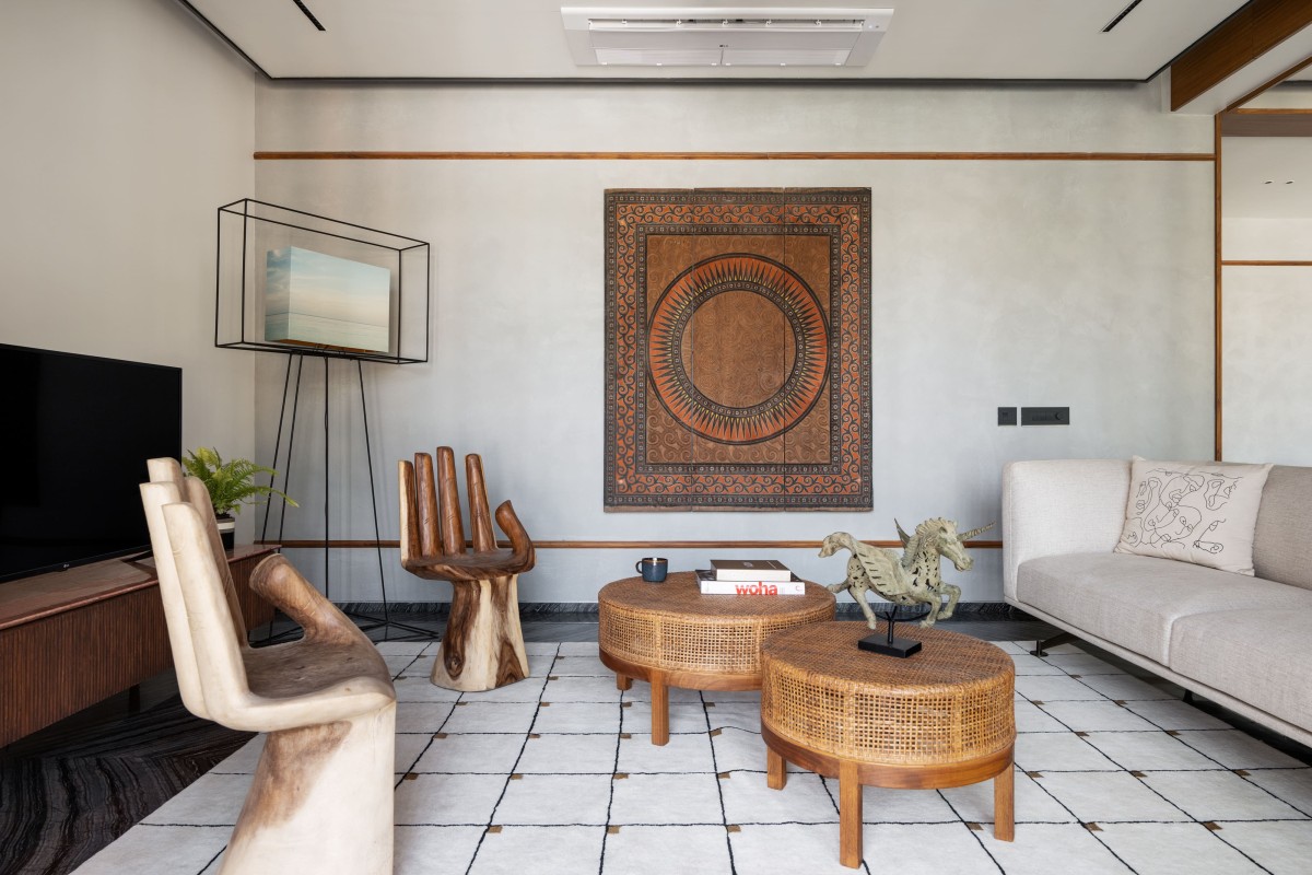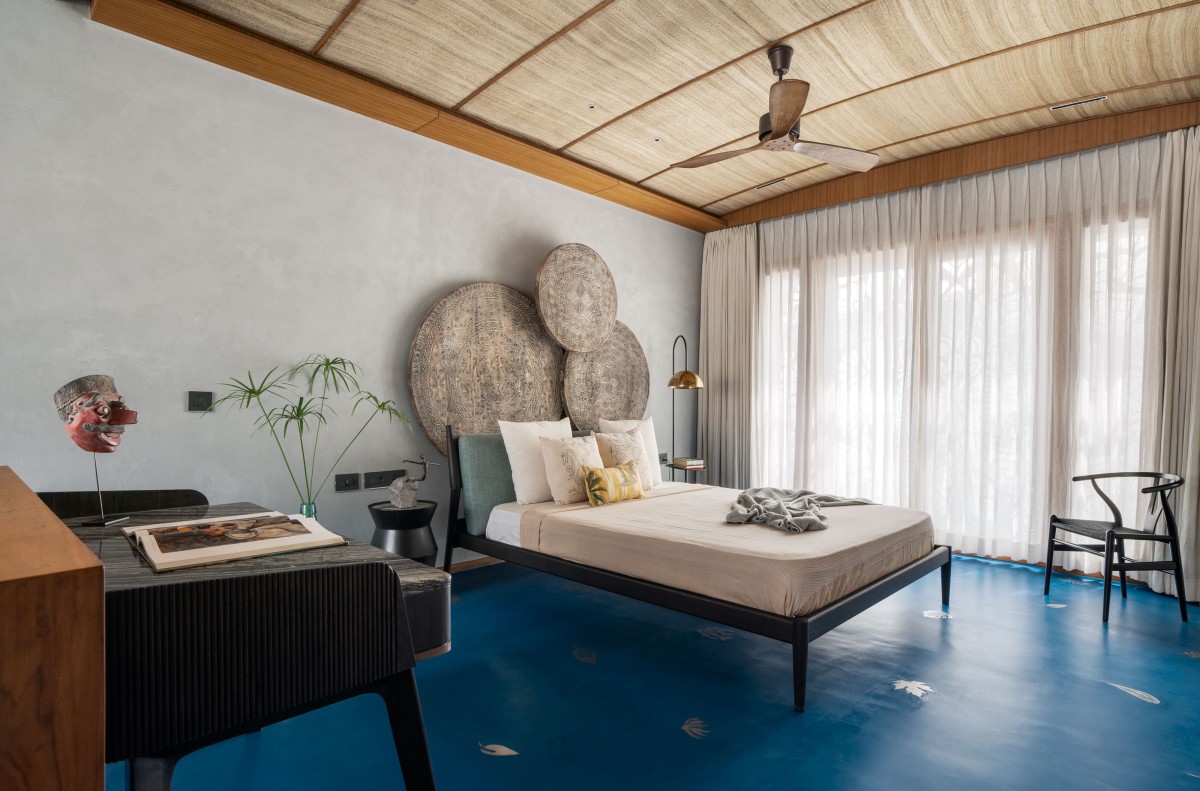 The simple building form is comfortable to inhabit, relaxed, and has an easy lifestyle feeling about it. The home is organized in three levels. The living spaces on all three floors are located towards the front side of the home, making the rear side more private and houses all the bedrooms and en suites. Internally we wanted to capture a spirit of a tropical haven. The use of simple cement finishes with teak wood accents, elegant white marble, and timber ceilings infuses the spaces with warmth and a relaxed ambiance. Carefully curated materials such as locally sourced stones, natural oxide floorings, banana fiber mats, and bamboo-crafted lighting elements contribute to the tropical mood, ensuring a harmonious blend of comfort and style.