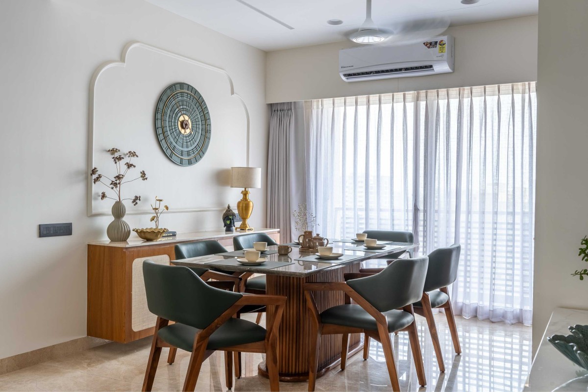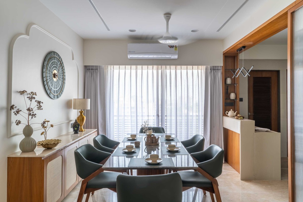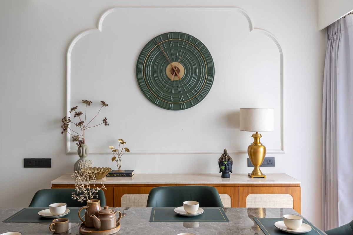 The dining area is a con nua on of the same design language — textural, layered, yet minimal. We’ve explored different materials here — mixing mouldings, ra an, fabrics, and stone — to demonstrate how variety can s ll feel cohesive. A wall clock, nestled elegantly between the delicate moulding Pa s and finished in the same natural pale e, becomes an understated design element rather than a mere func onal accessory. The goal was always to celebrate materials without le ng them overpower one another.