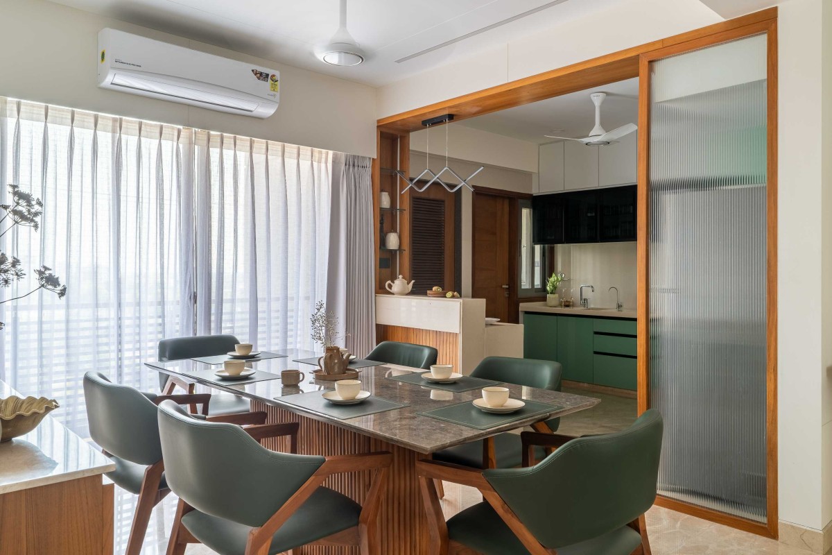 Dining to Kitchen view of House Of Textural Contrasts by Zzarna Sstudio