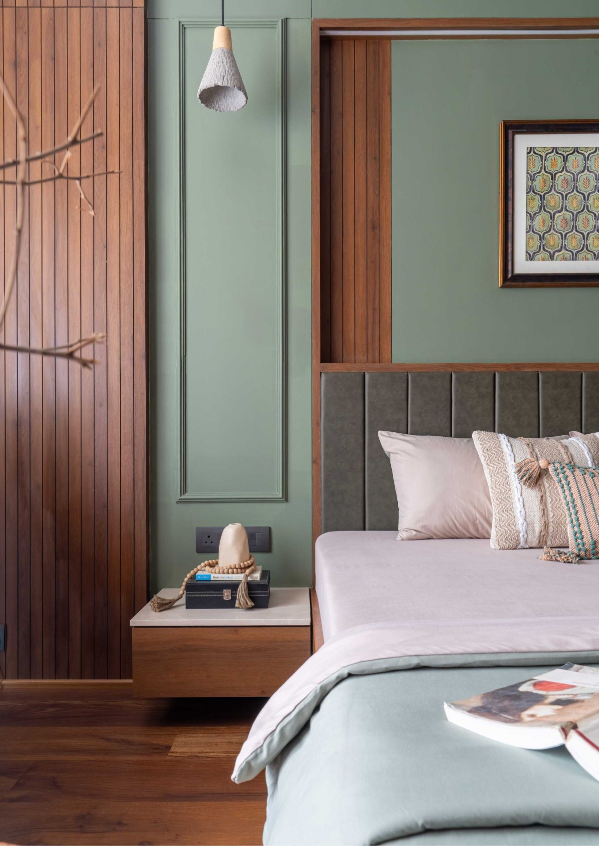 The master bedroom speaks a different language — more muted, more mature. Earthy tones and crisp lines define this space, and the moulding pa s con nue here, offering texture without fuss. It also includes a walk-in wardrobe, keeping the space func onal without losing its serenity.