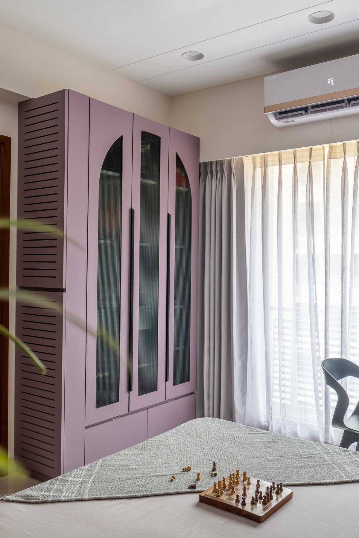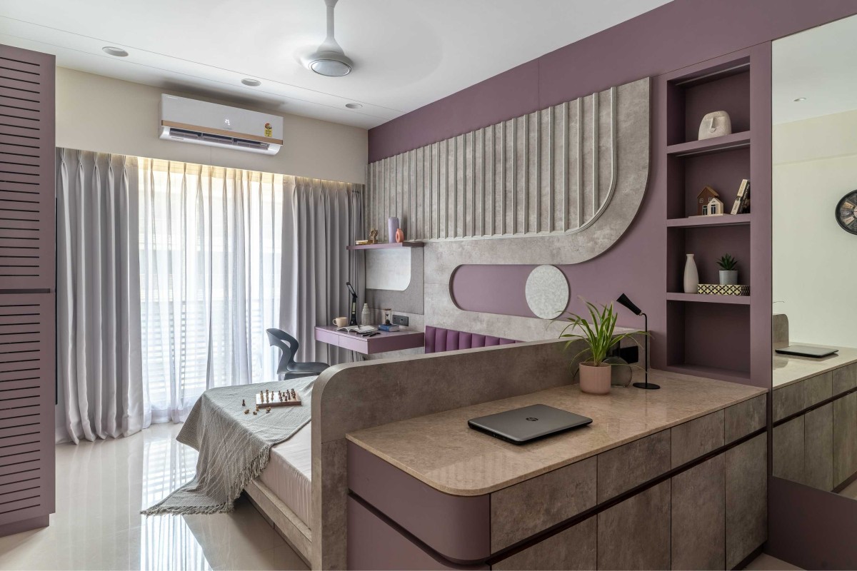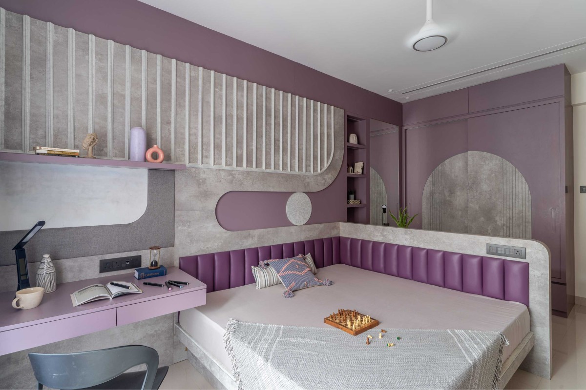 The kids’ bedroom was where we allowed ourselves to bend the rules. We introduced so purple hues and paired them with both curves and linear elements to keep the room dynamic and playful. It’s func onally zoned too — the bed area flows into a cozy study corner, offering the child both calm and crea vity.