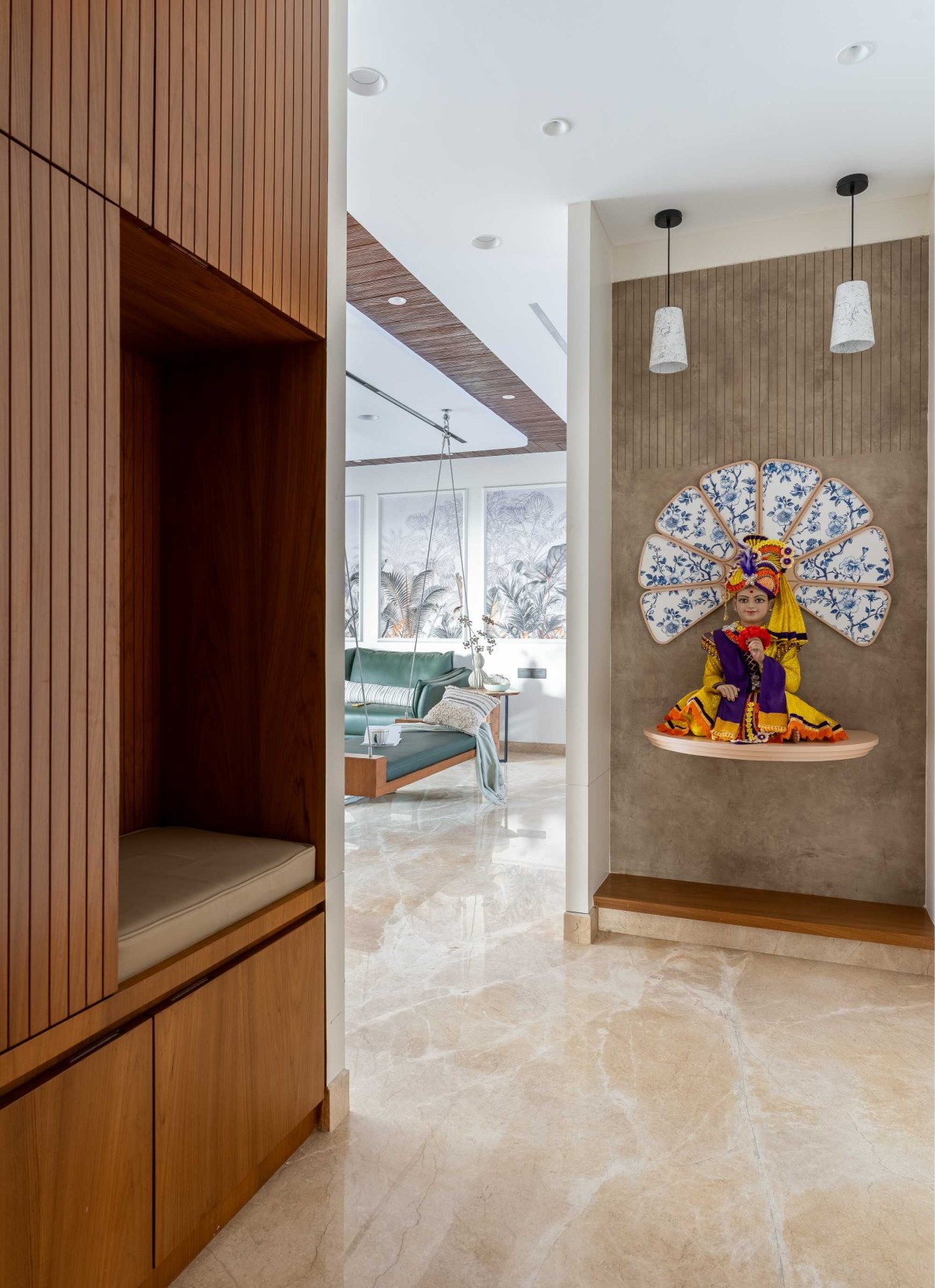 Just before you enter the bedrooms, a deity placed in the passage — with a sacred verse carved above — offers another spiritual punctua on, adding depth to the transi onal space.