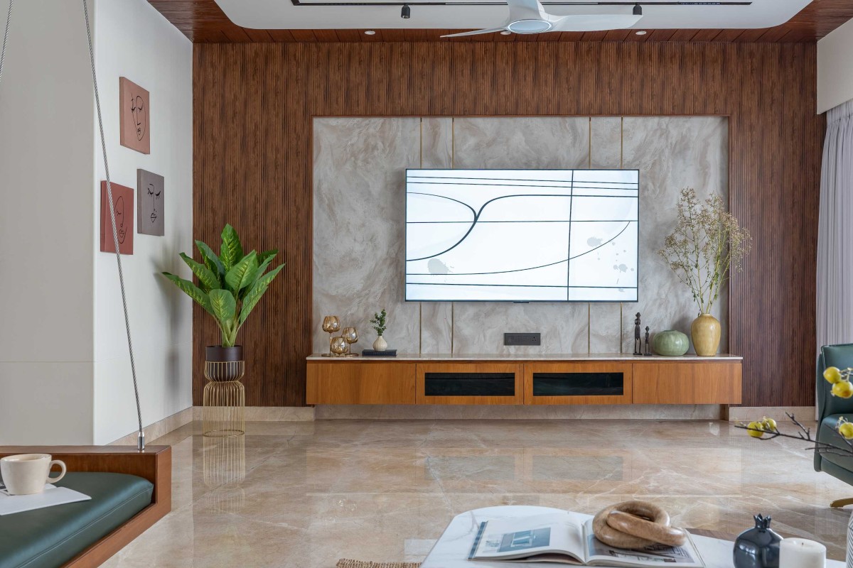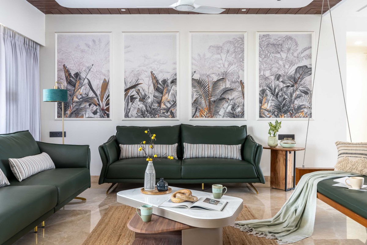 The living room became our canvas for subtle drama. A monochrome decorative panel framed in delicate moulding pattis acts as the visual anchor here. It’s restrained yet striking, and works in harmony with the natural palette that runs throughout the house. We placed a swing as an additional seating option — not just for its functionality, but for its symbolic charm. It adds a playful, almost nostalgic note, and brings in a connection to nature and childhood that softens the geometry of the space.