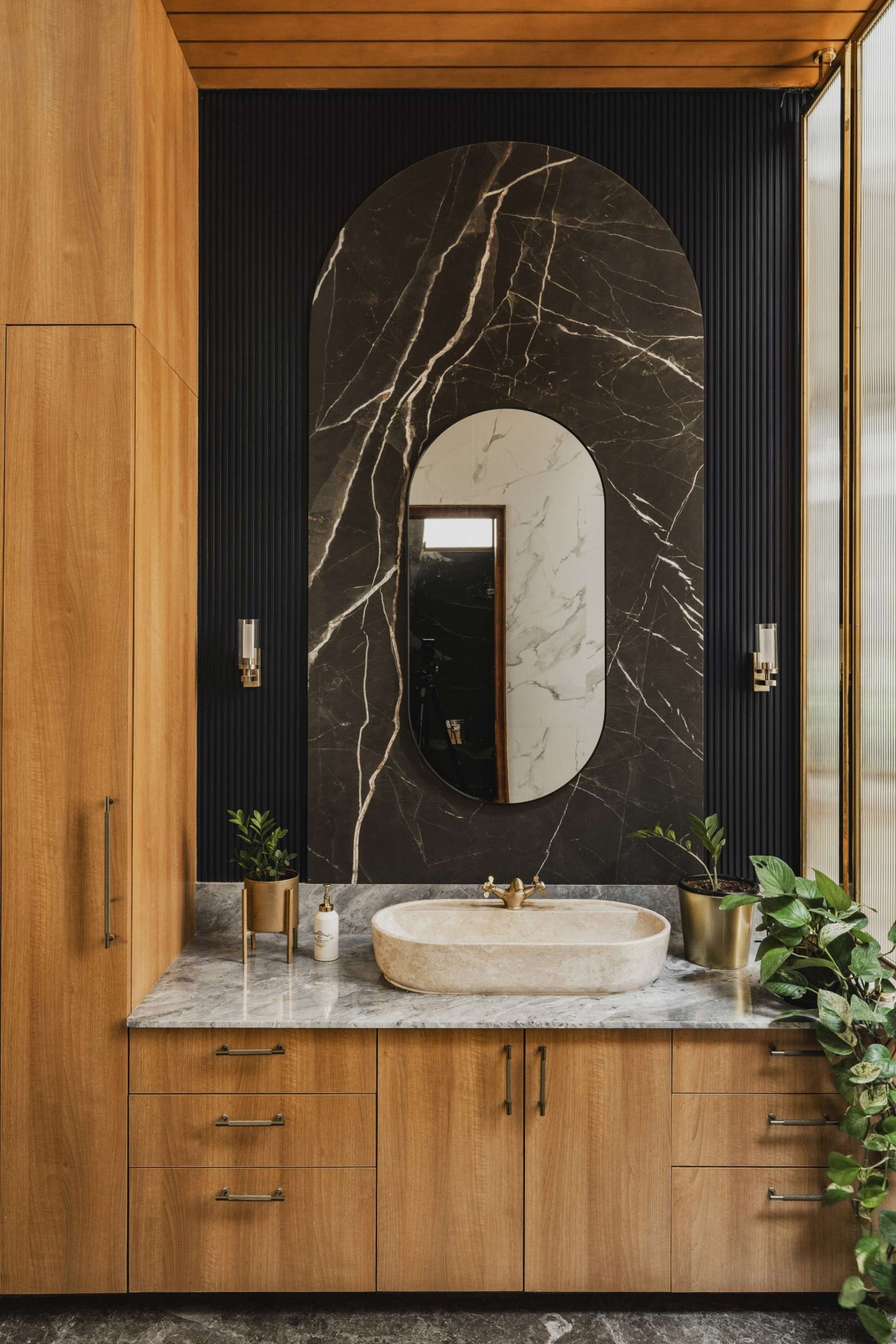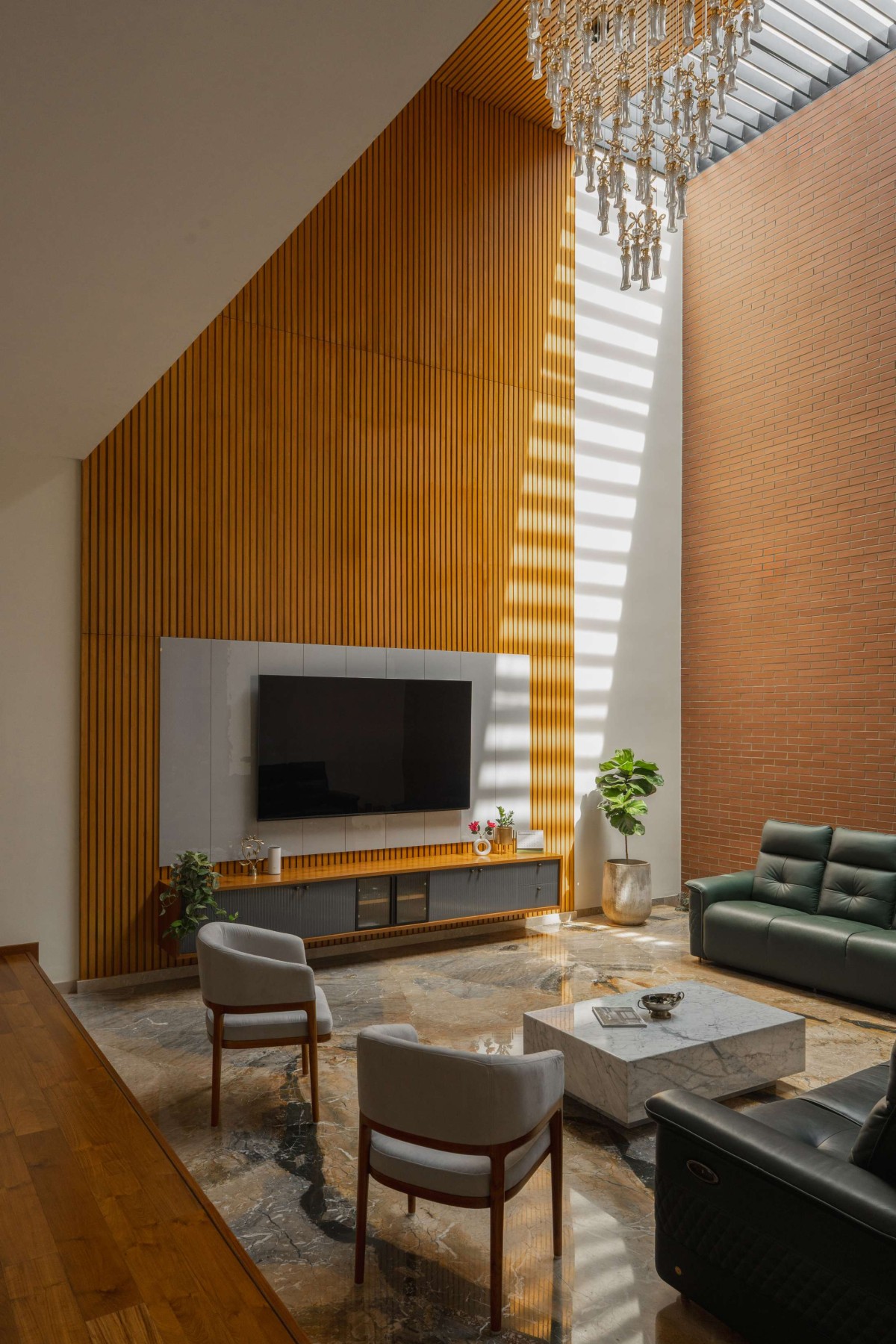 Materially, the house employs a mix of exposed concrete, natural stones, woods, terracotta tiles, and glass- creating a warm, durable, and climate-responsive palette. The thoughtfulness of lights, air, and greenery defines the identity of the home.