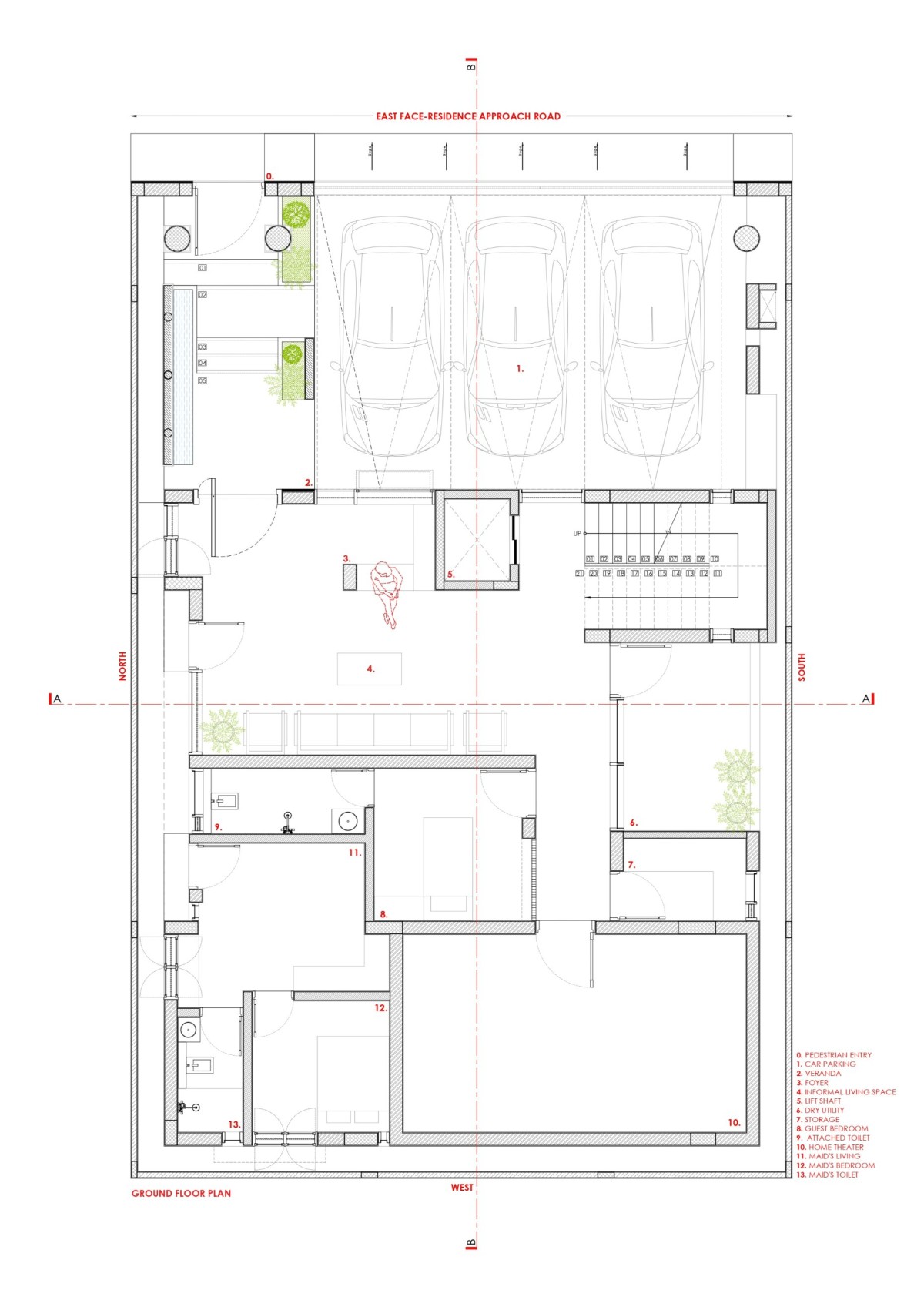 The house is vertically organized across four levels. The ground floor accommodates a car drop-off zone, parking for three vehicles, a formal living room, a Guest Bedroom, a Home theatre, and a maid's room with a separate entrance, ensuring privacy for domestic staff. This floor functions as a semi-public base with service and guest amenities tucked efficiently into the plan.