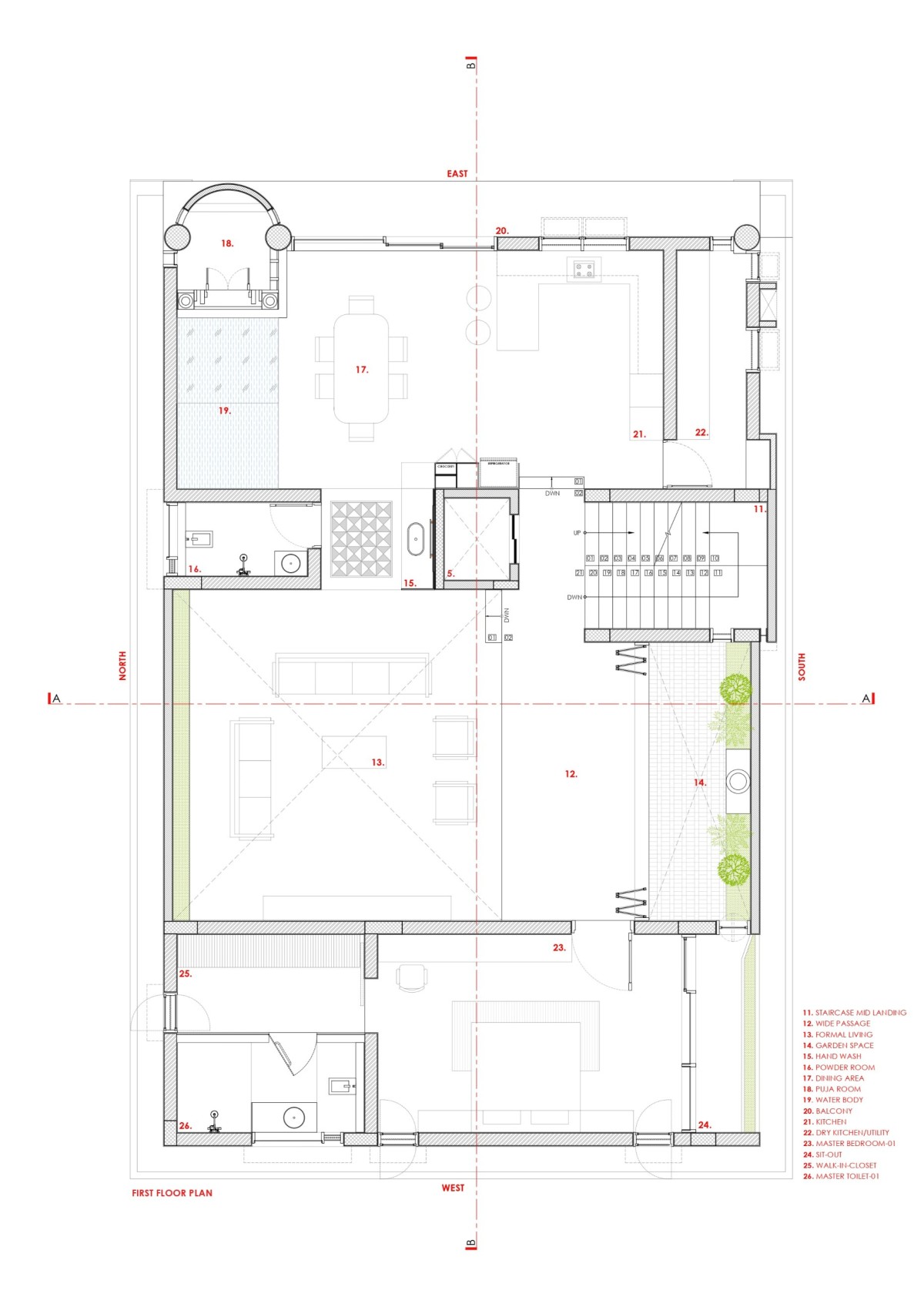 The first floor acts as the social and spiritual heart of the house. It features a double-height formal living area that opens into a linear courtyard, bringing in daylight and enabling passive cooling. A puja room, kitchen, and dining area are placed strategically as per South Indian Vastu on the east faces to fulfill the Vastu benefits, and same way, it benefits from front park views utilization. A master bedroom on this floor ensures privacy for the primary residents while maintaining proximity to communal spaces.