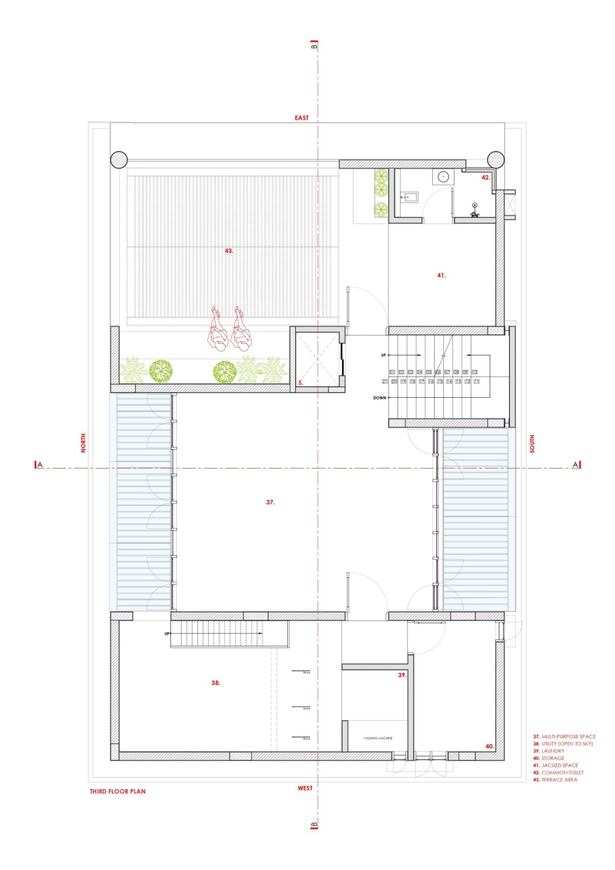 The third floor is focused on wellness and relaxation, housing a gymnasium in a multifunctional space, a laundry area, and a terrace space with a planter box with lush green plants. The front east public park views serve as a green retreat at the height level, ideal for family gatherings and quiet reflection in the evening.